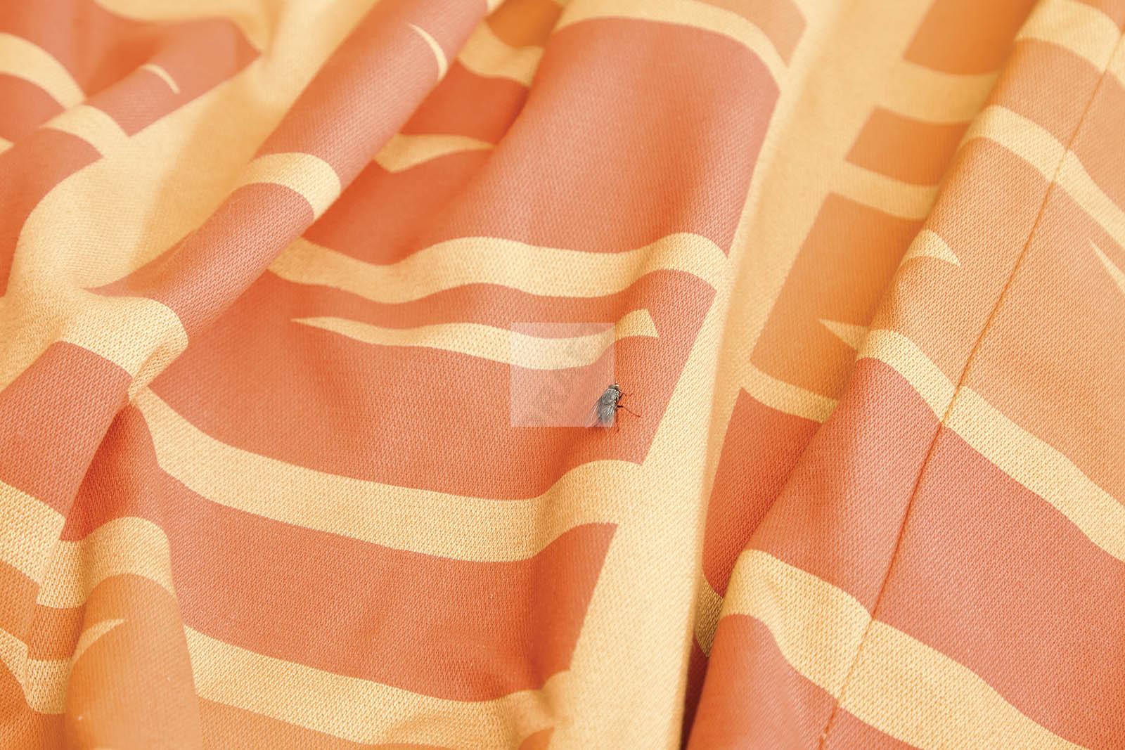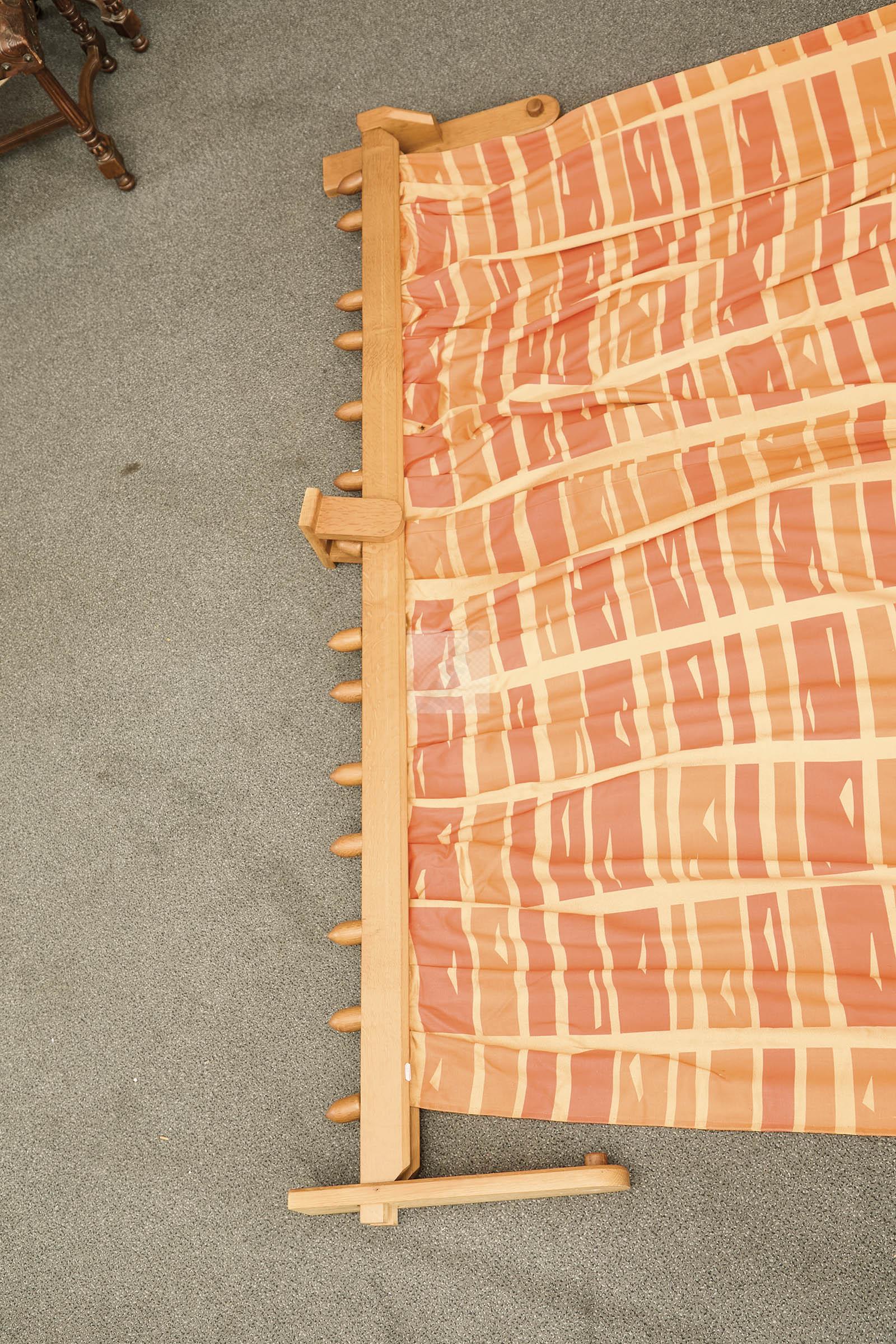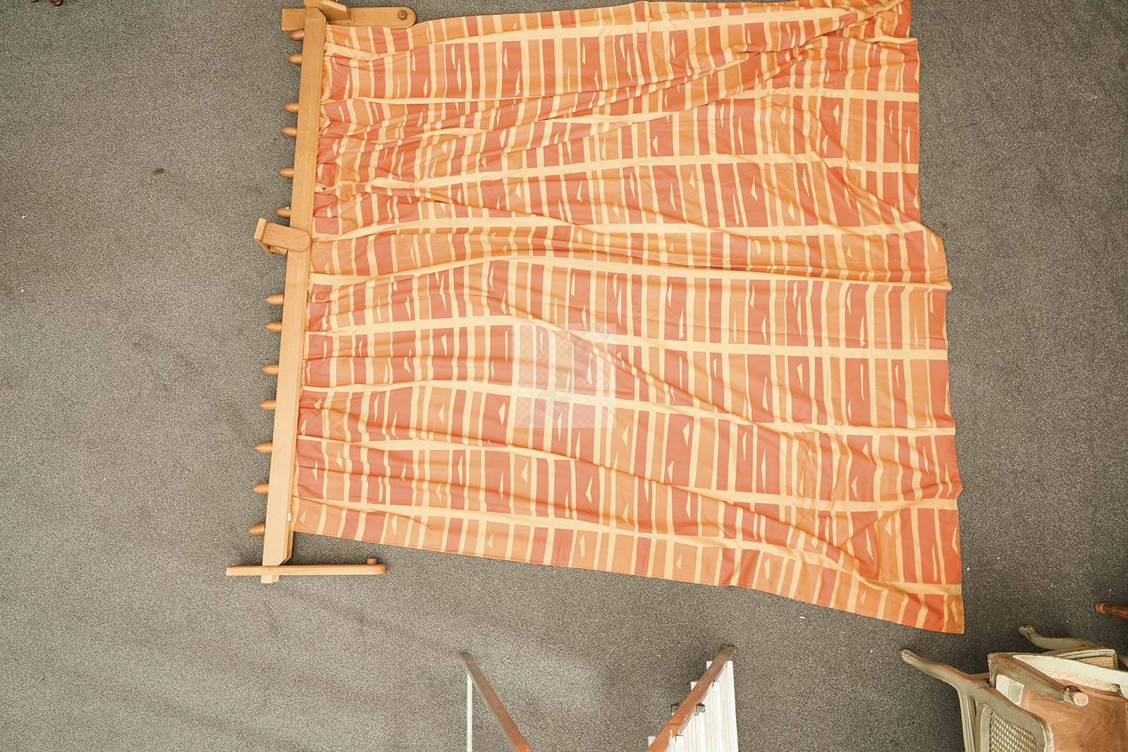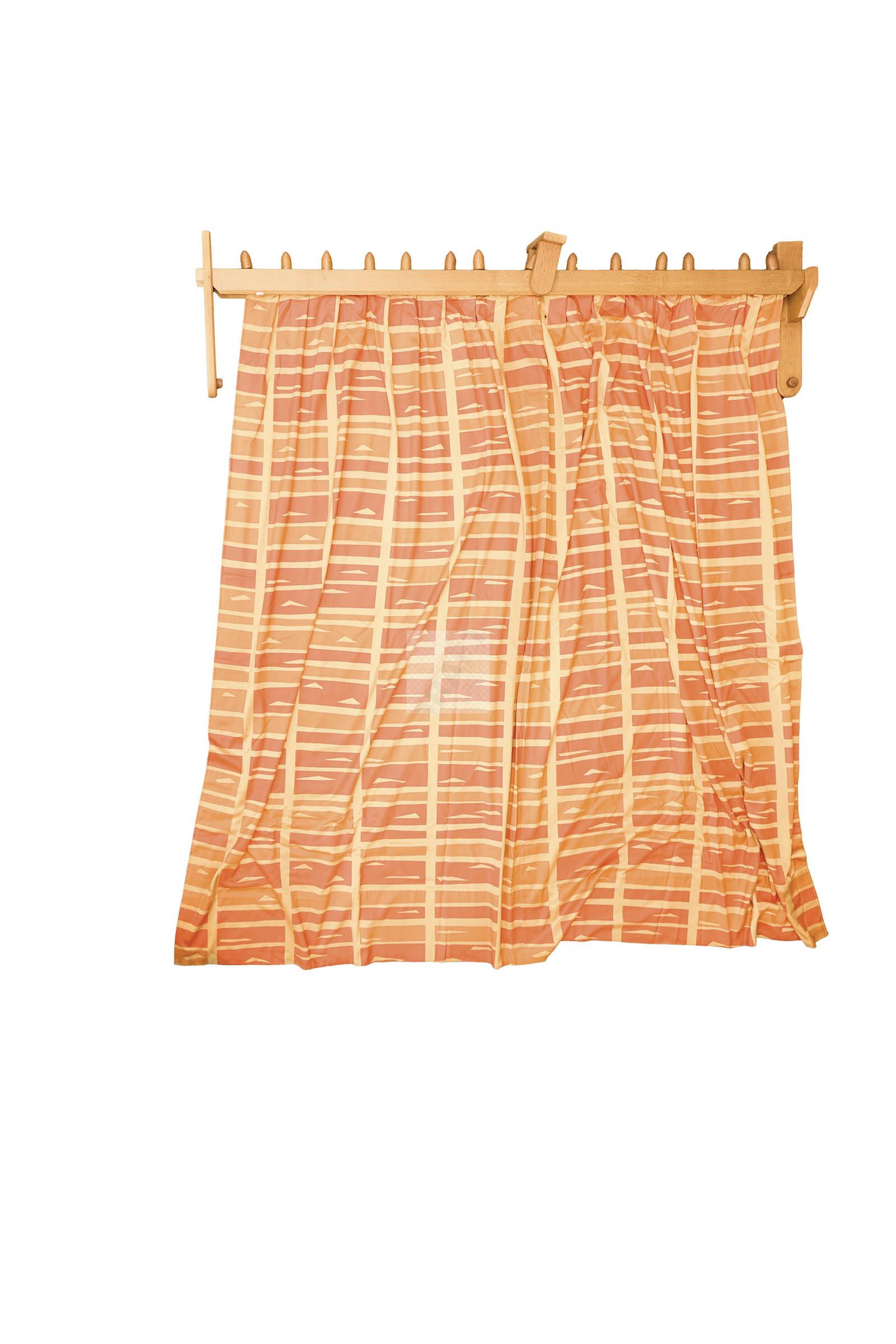 Supports et barres de rideaux, et leur rideau d’origine à motifs géométriques oranges,