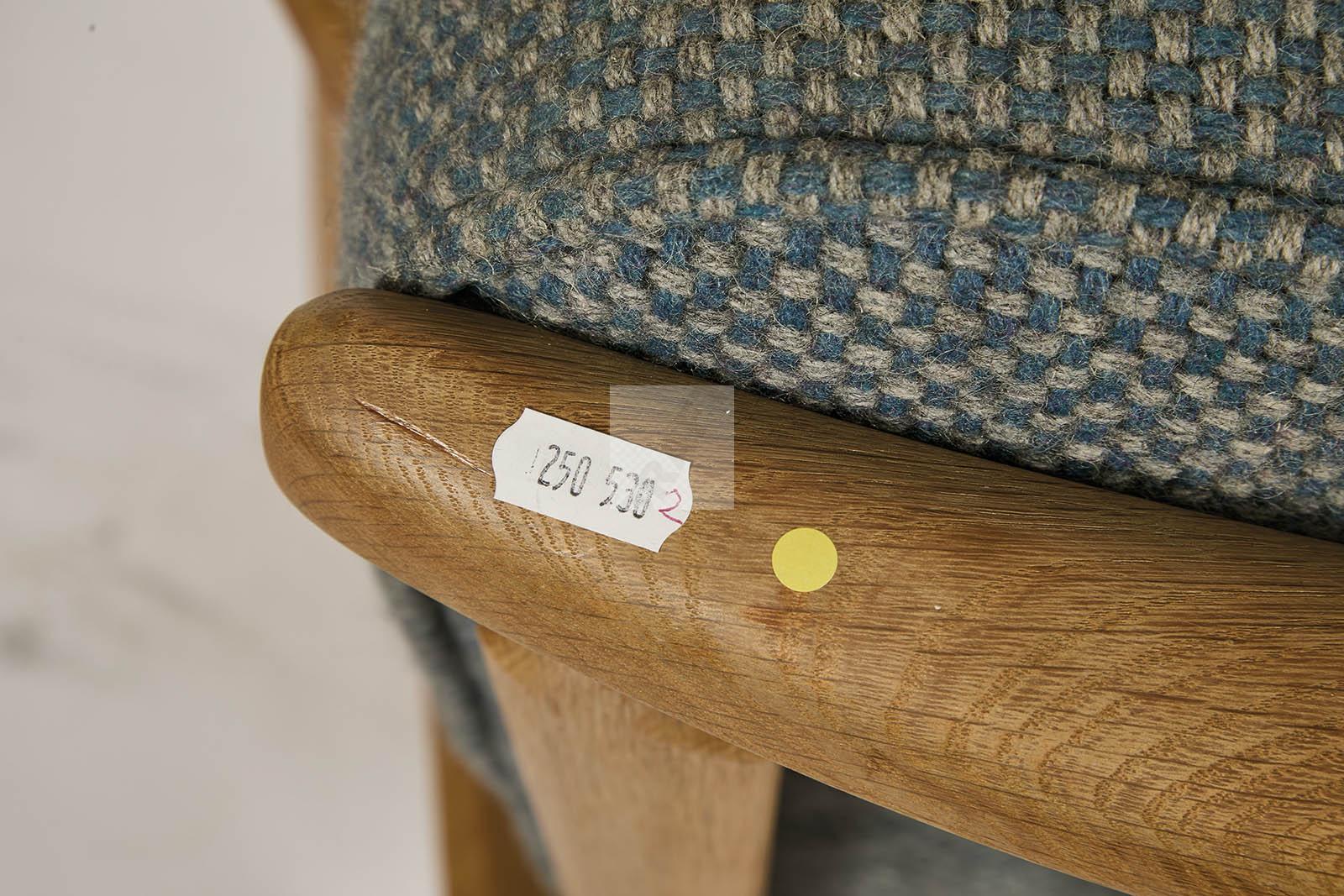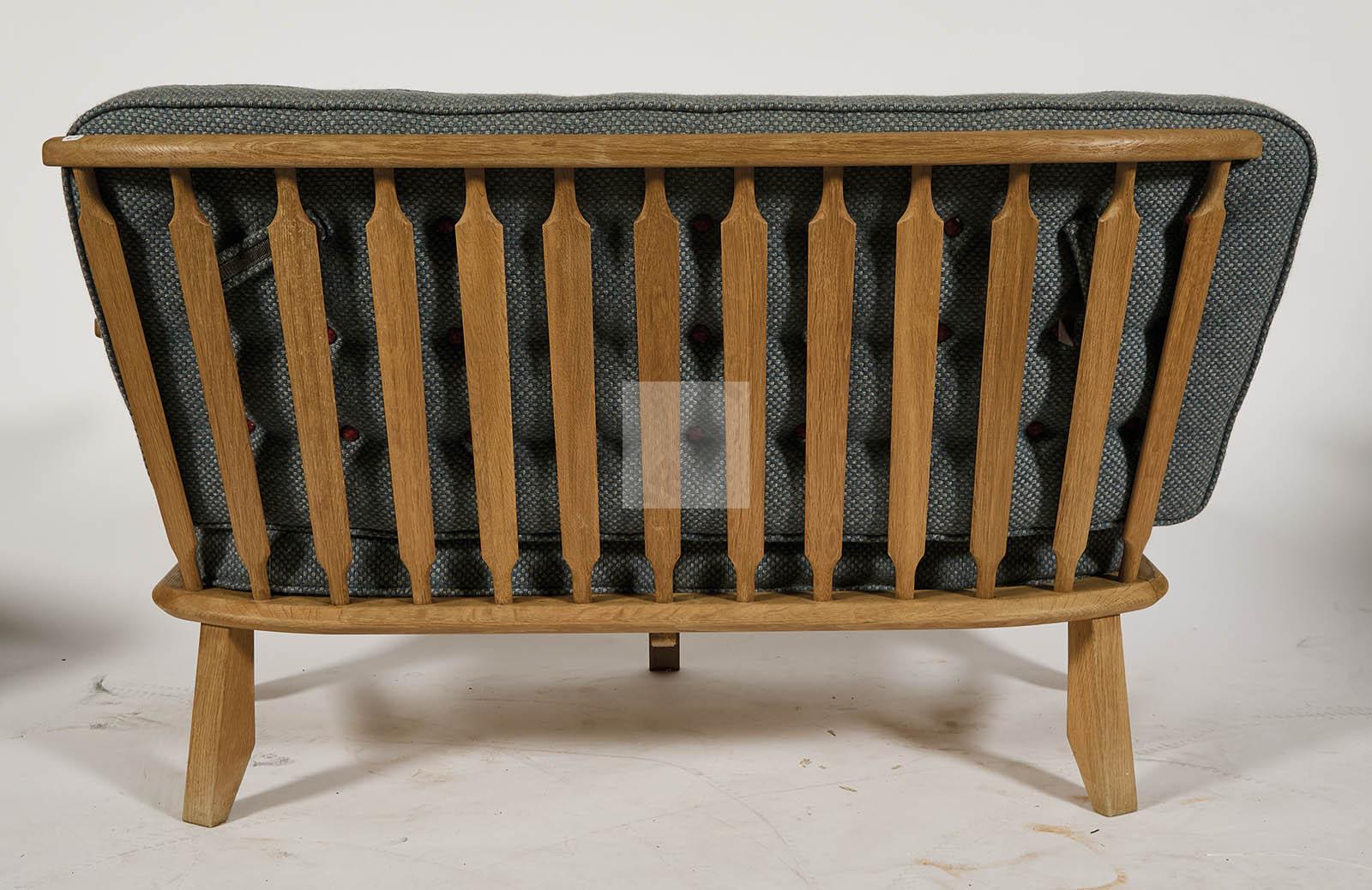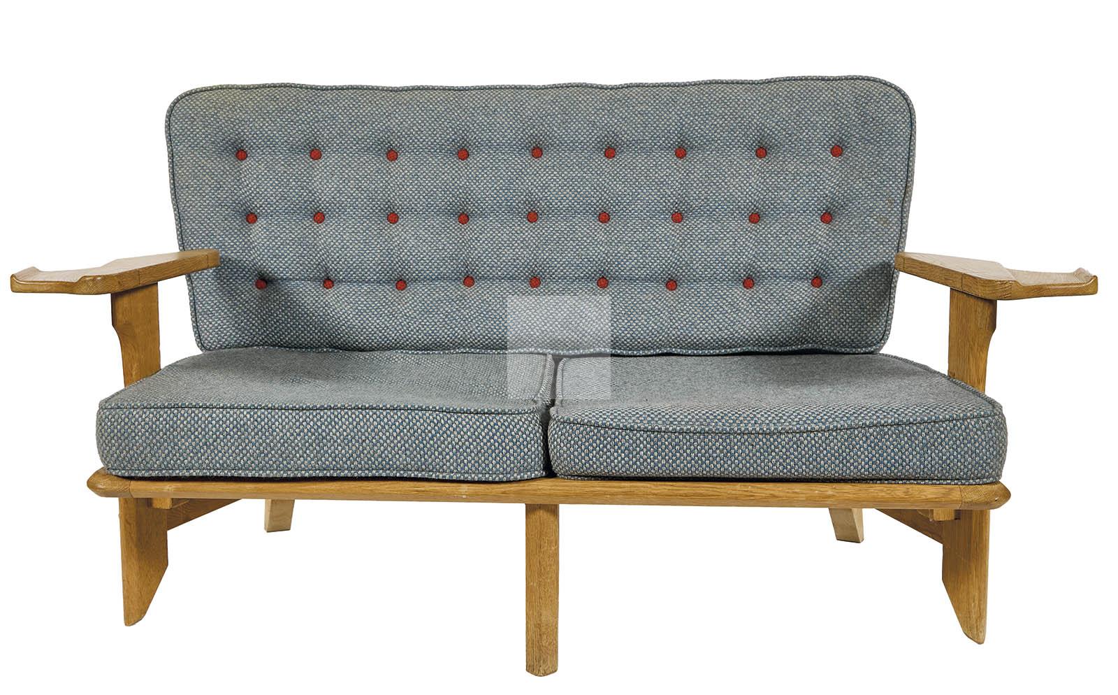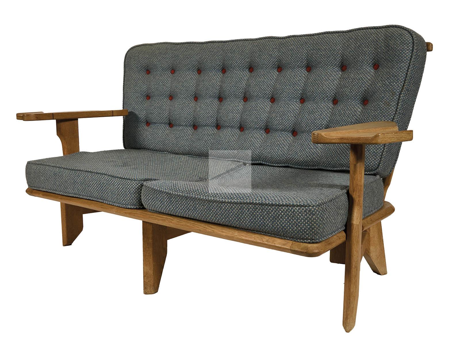 Canapé deux places en chêne, assise en laine grise, capitonnée, boutons rouges,