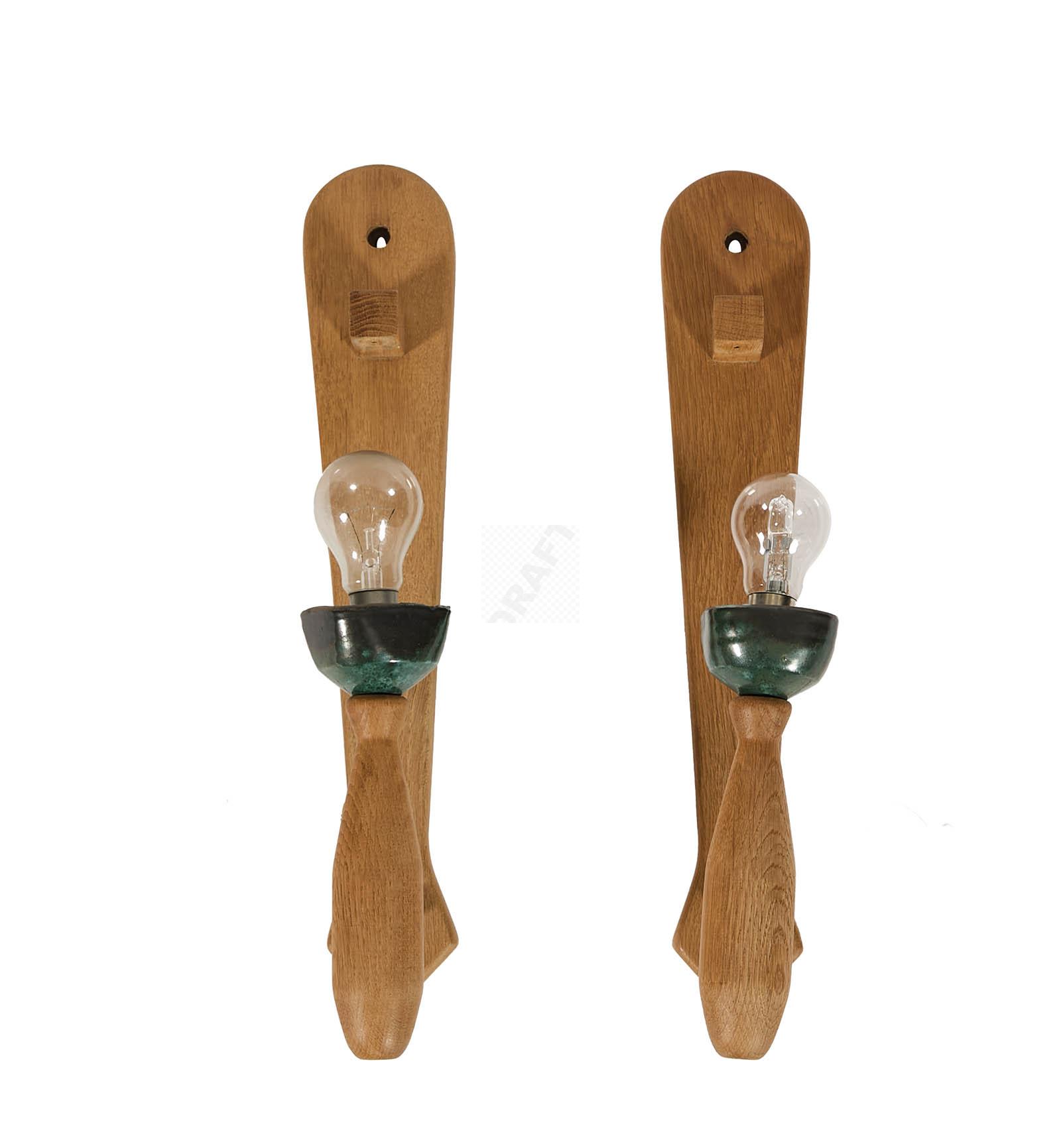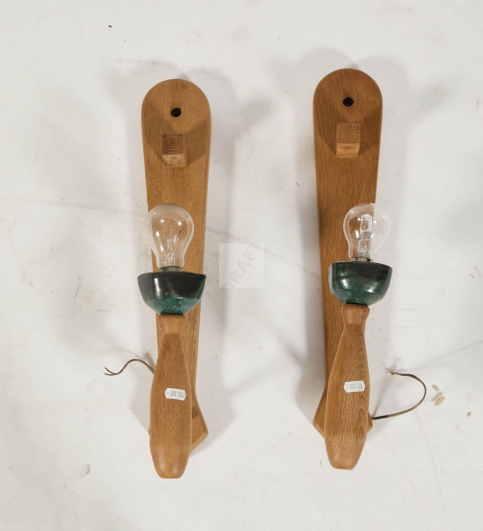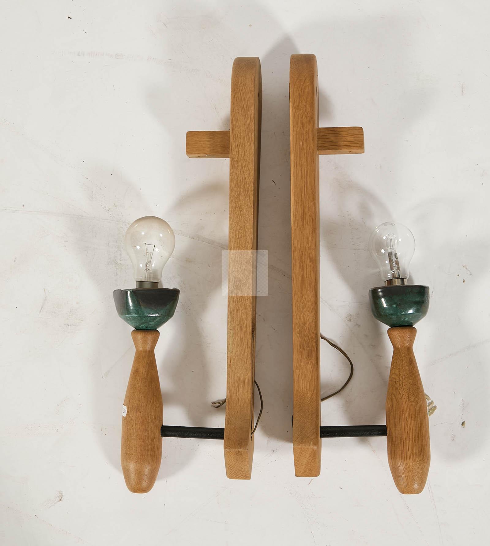 Deux grandes appliques lumineuses en chêne, et tige en métal, cache-ampoules en céramique émaillée.