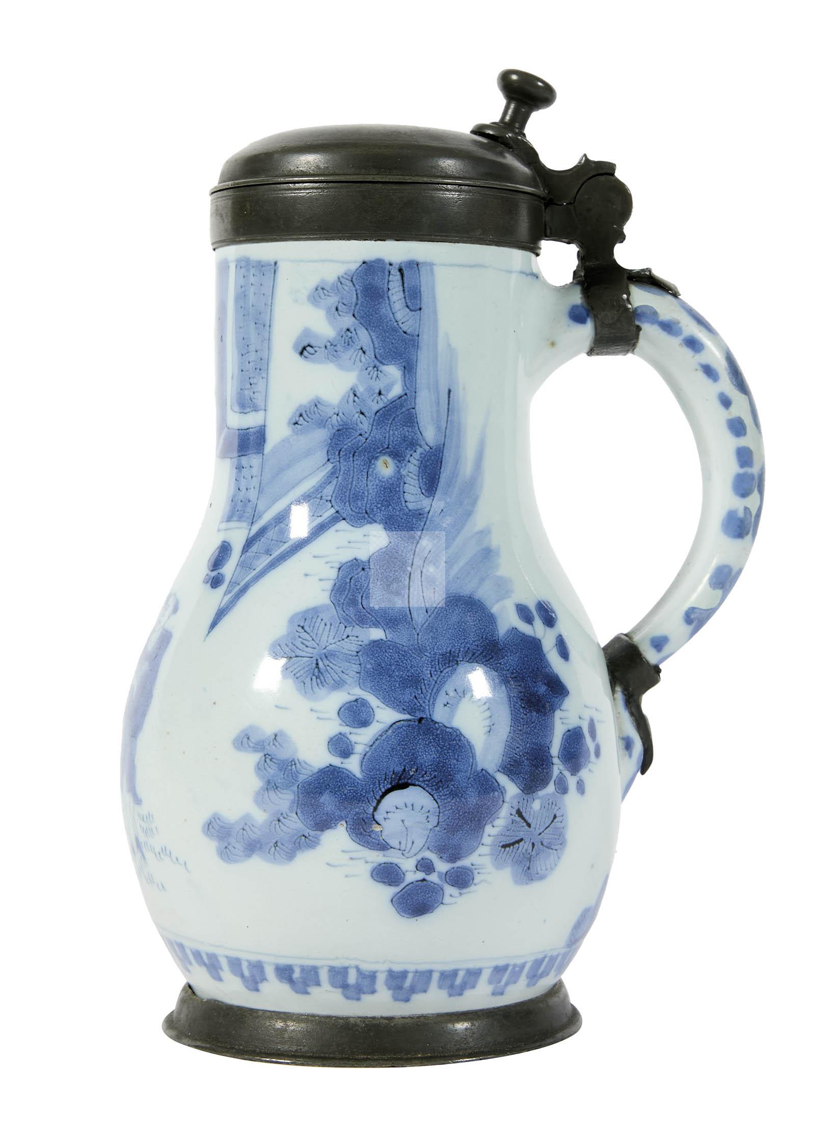 34 Delft : pichet en faïence stannifère à décor de chinois. Monture en étain daté 1685. Ht : 24 cm. Etat : une ancienne restauration à la anse.