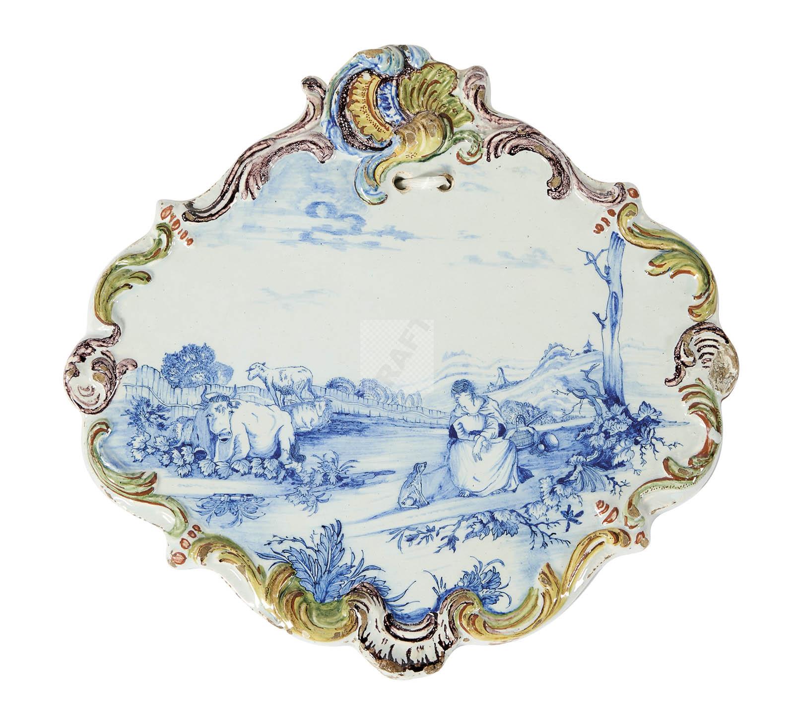 Plaque en faïence stannifère polychrome. Scène de bergère à la manière de Nicolas Berchem. Epoque : 2ème moitié du 18ème