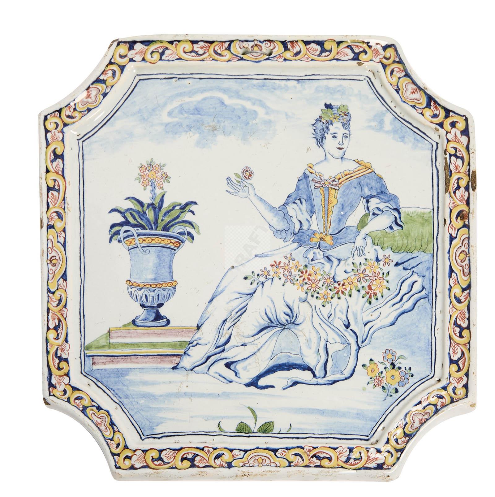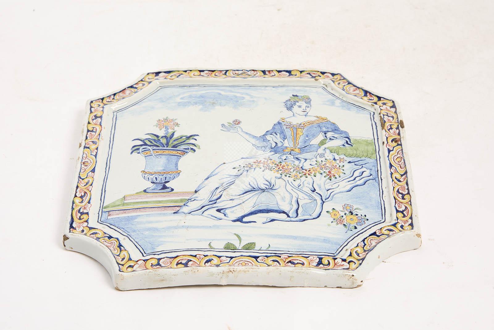 Plaque à pans coupés en faïence stannifère polychrome à décor d’allégorie de l’été.