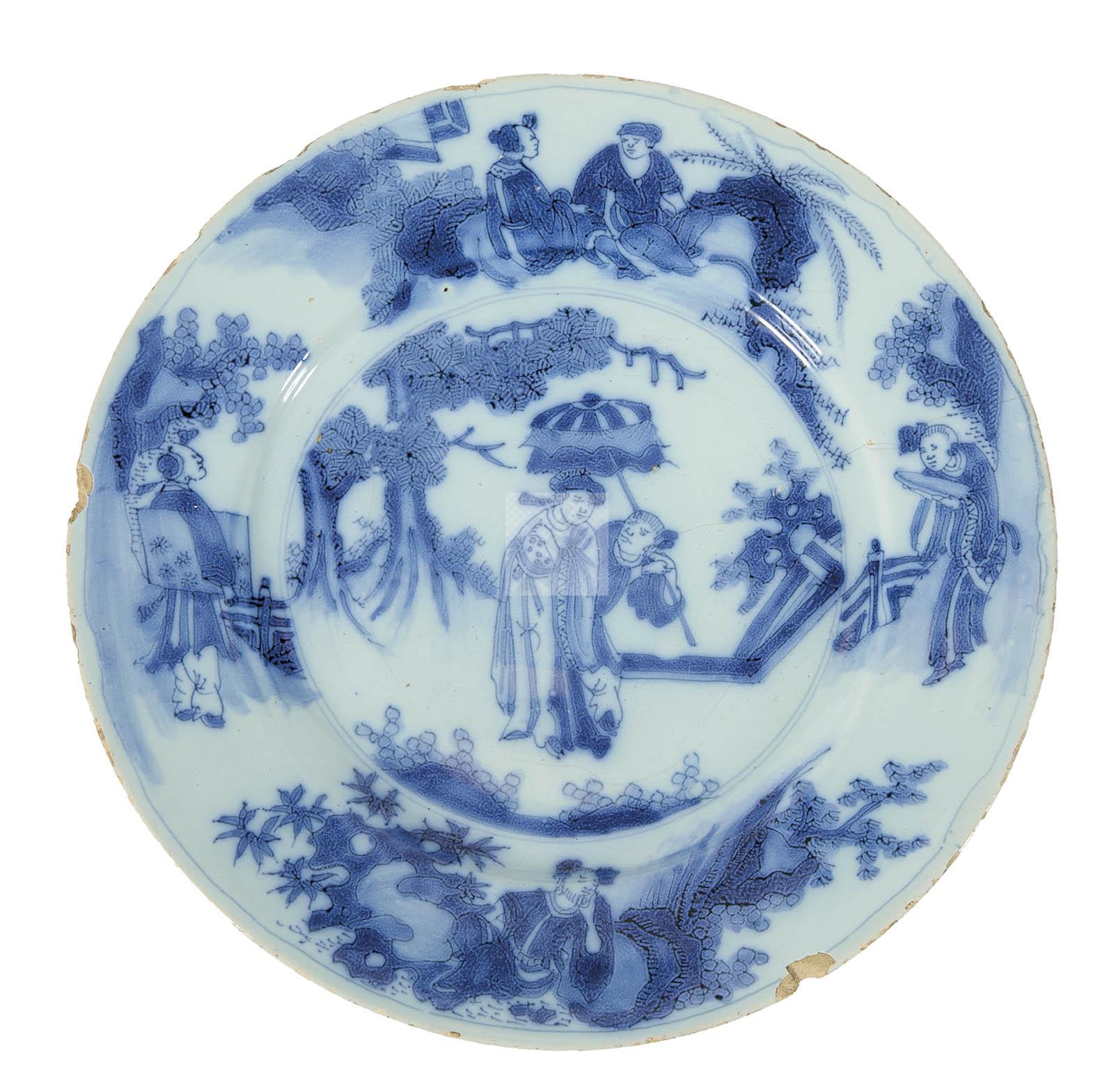 Une assiette en faïence stannifère à décor de chinois de la manufacture Samuel van Eenhoorn, fin du 17ème. Un fêle et égrenures.