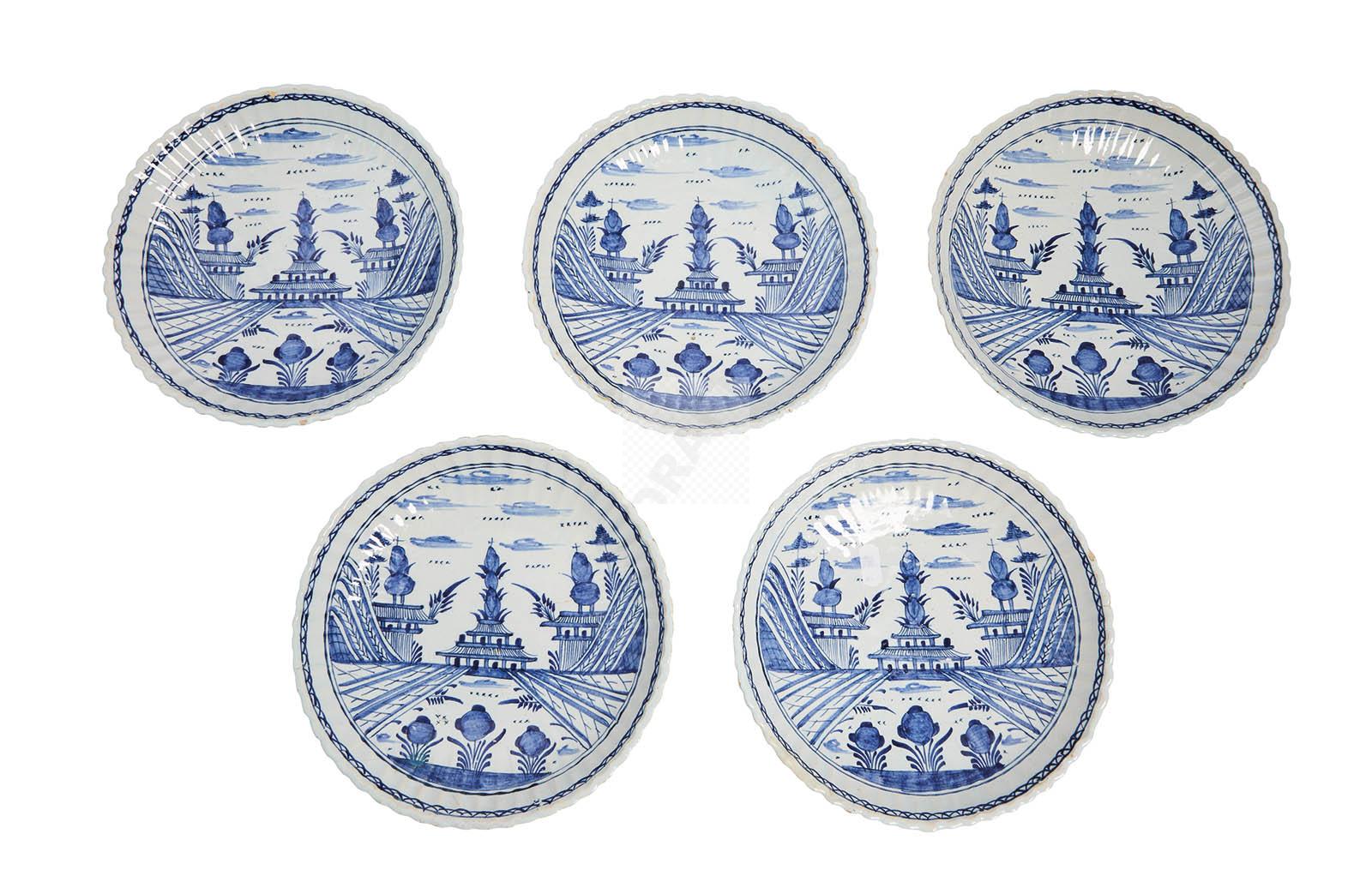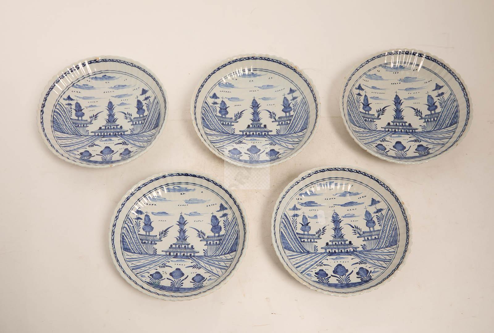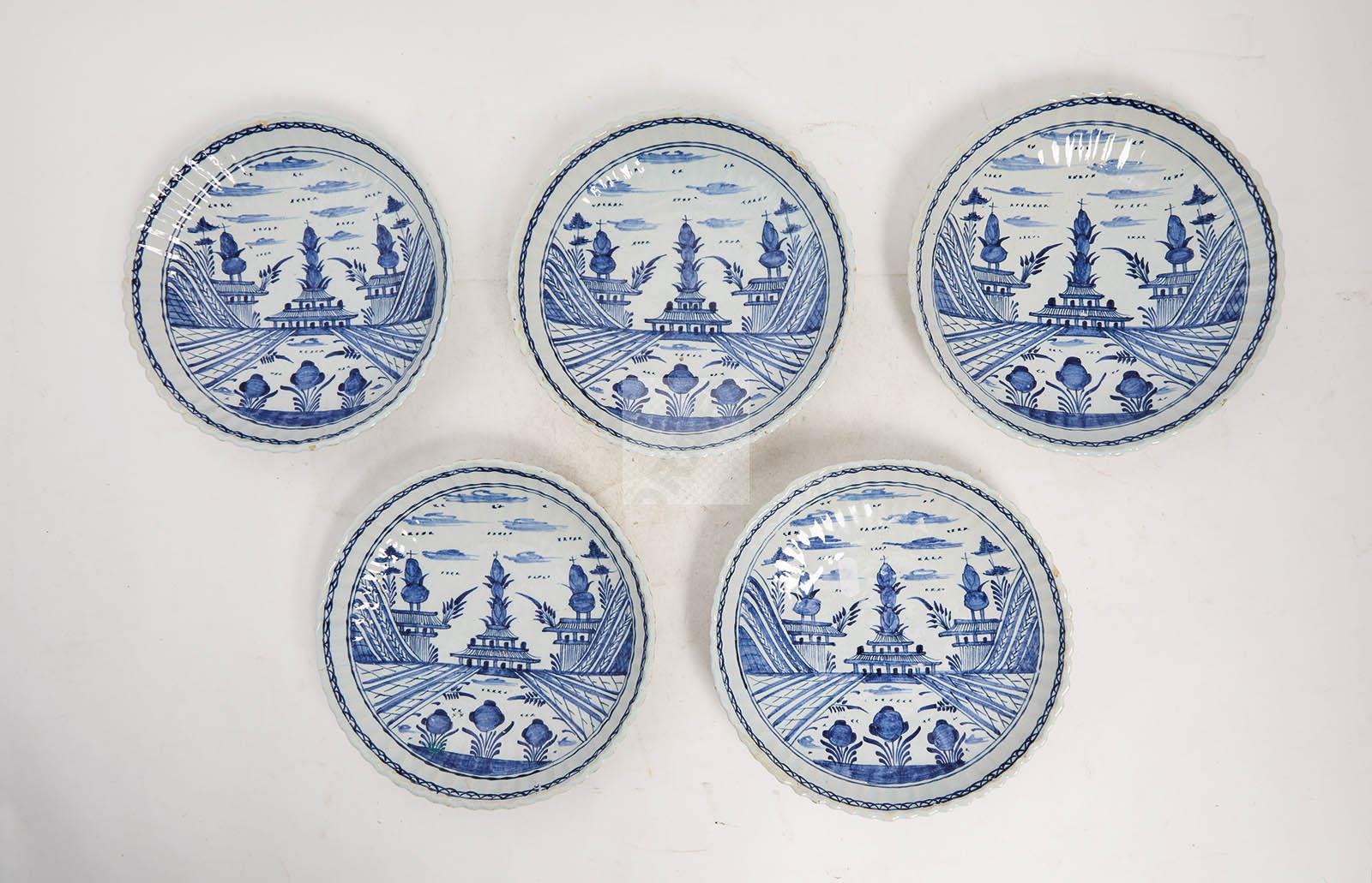 Suite de cinq assiettes godronnées en faïence stannifère et à décors peints en camaïeu bleu de pagodes dans des paysages.