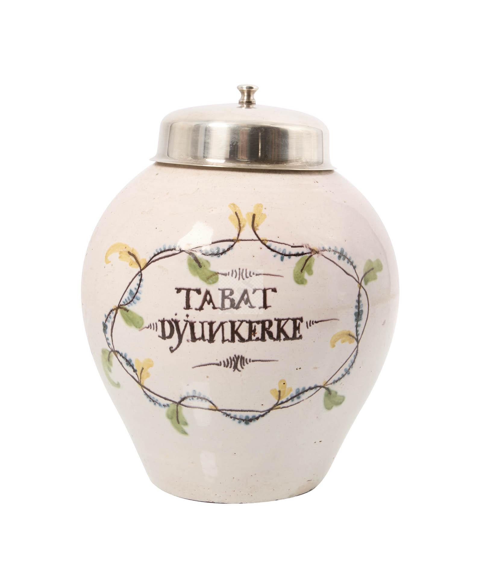 Pot à tabac en faïence stannifère polychrome marqué « TABAT DYUNKERKE »