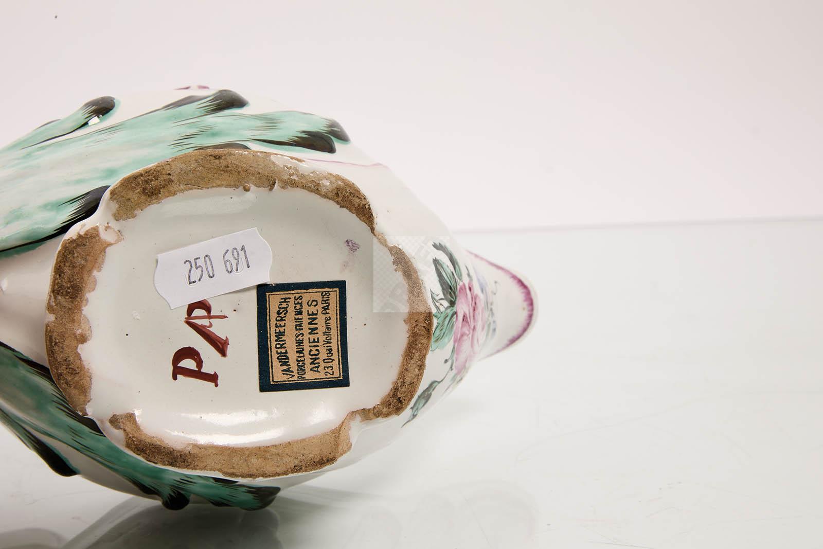 51 Aprey : saucière en faïence stannifère à décor polychrome de fleurs. Belle marque de la manufacture sous le piédouche. Etat : bon. Selon label, ancienne collection Vandermeersh. Long : 19 cm.