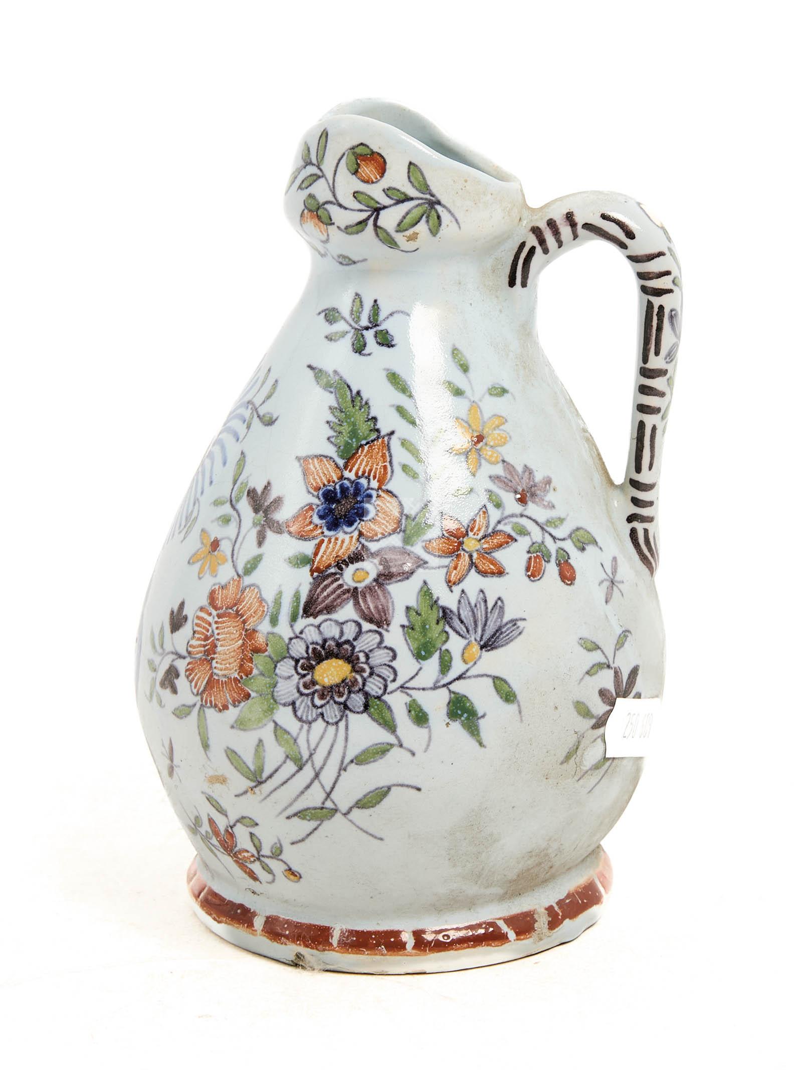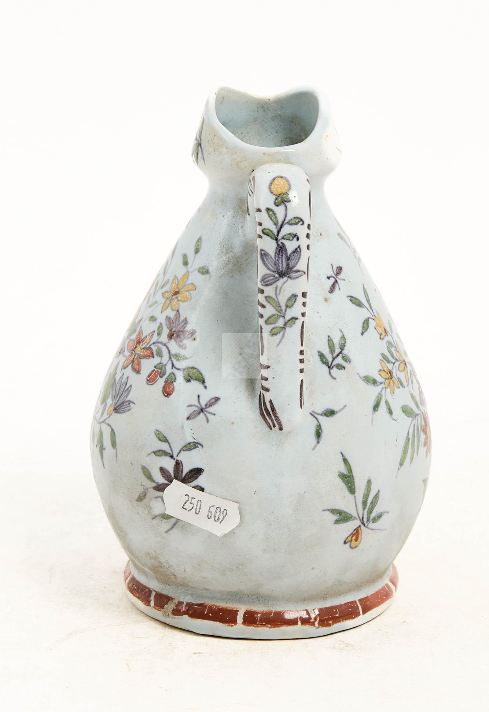 Lot n°58 - 58 Desvres façon Rouen Petit pichet sur talon en faïence polychrome