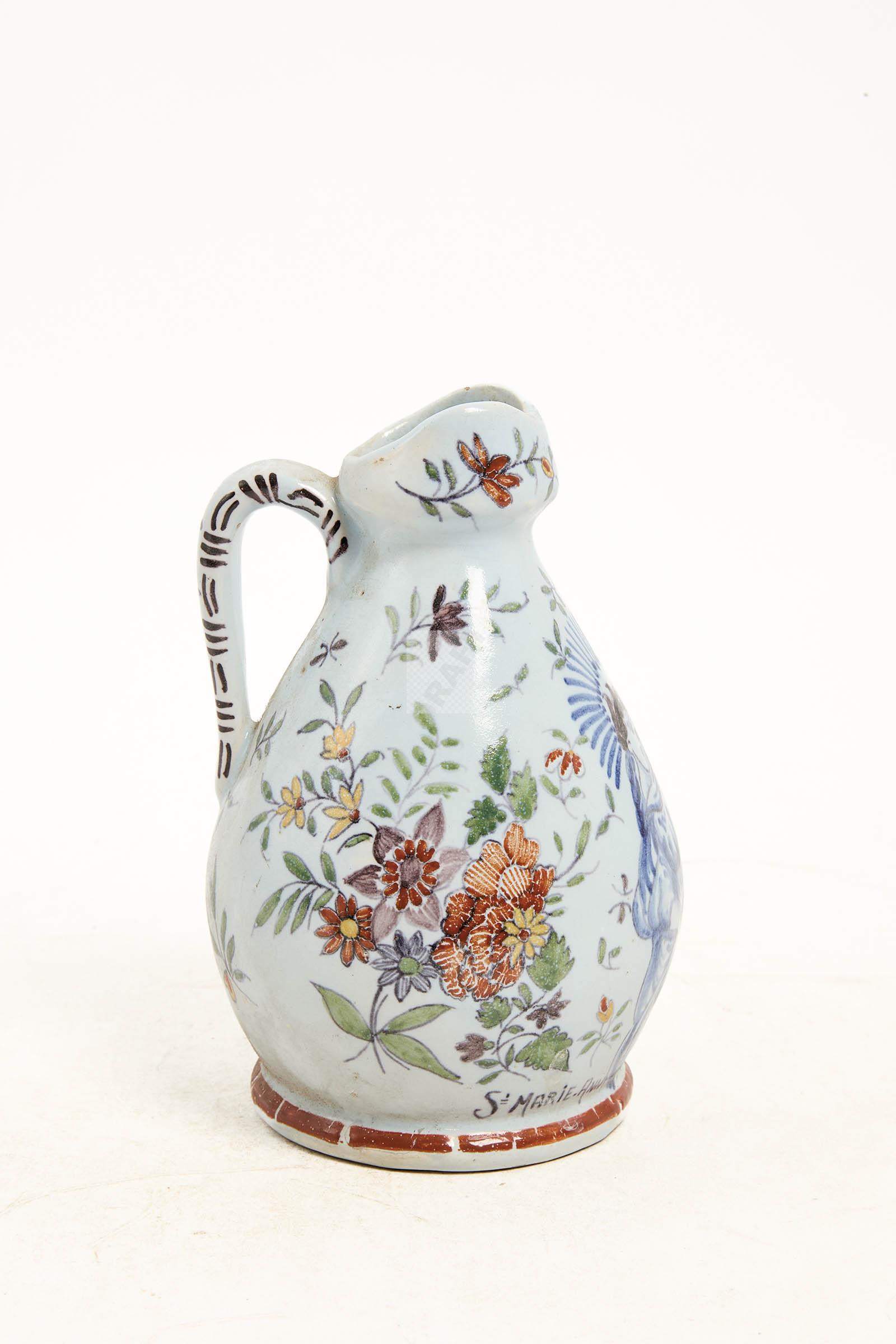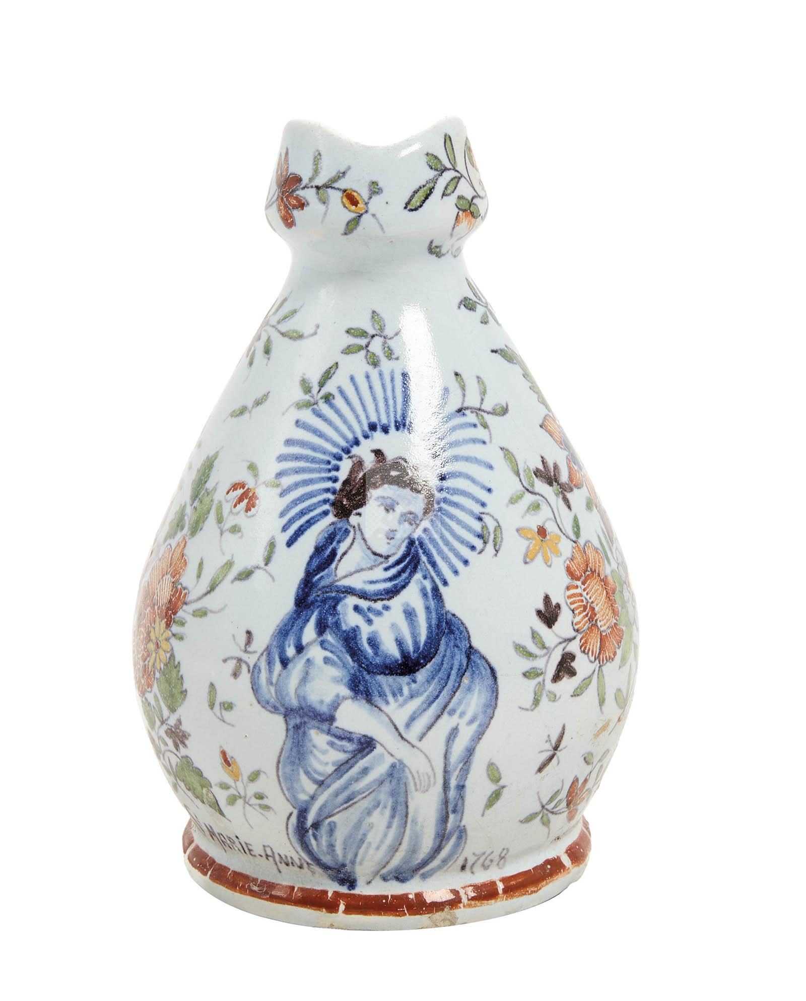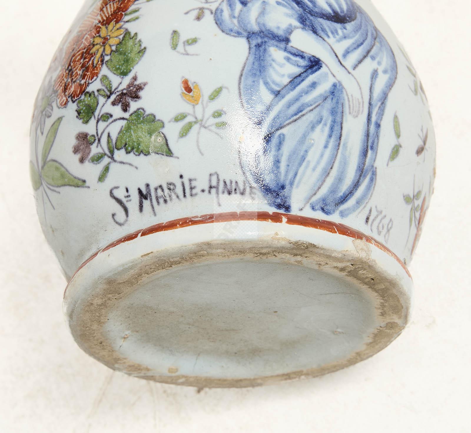 Petit pichet sur talon en faïence polychrome marqué Sainte Marie-Anne et datée 1762.
