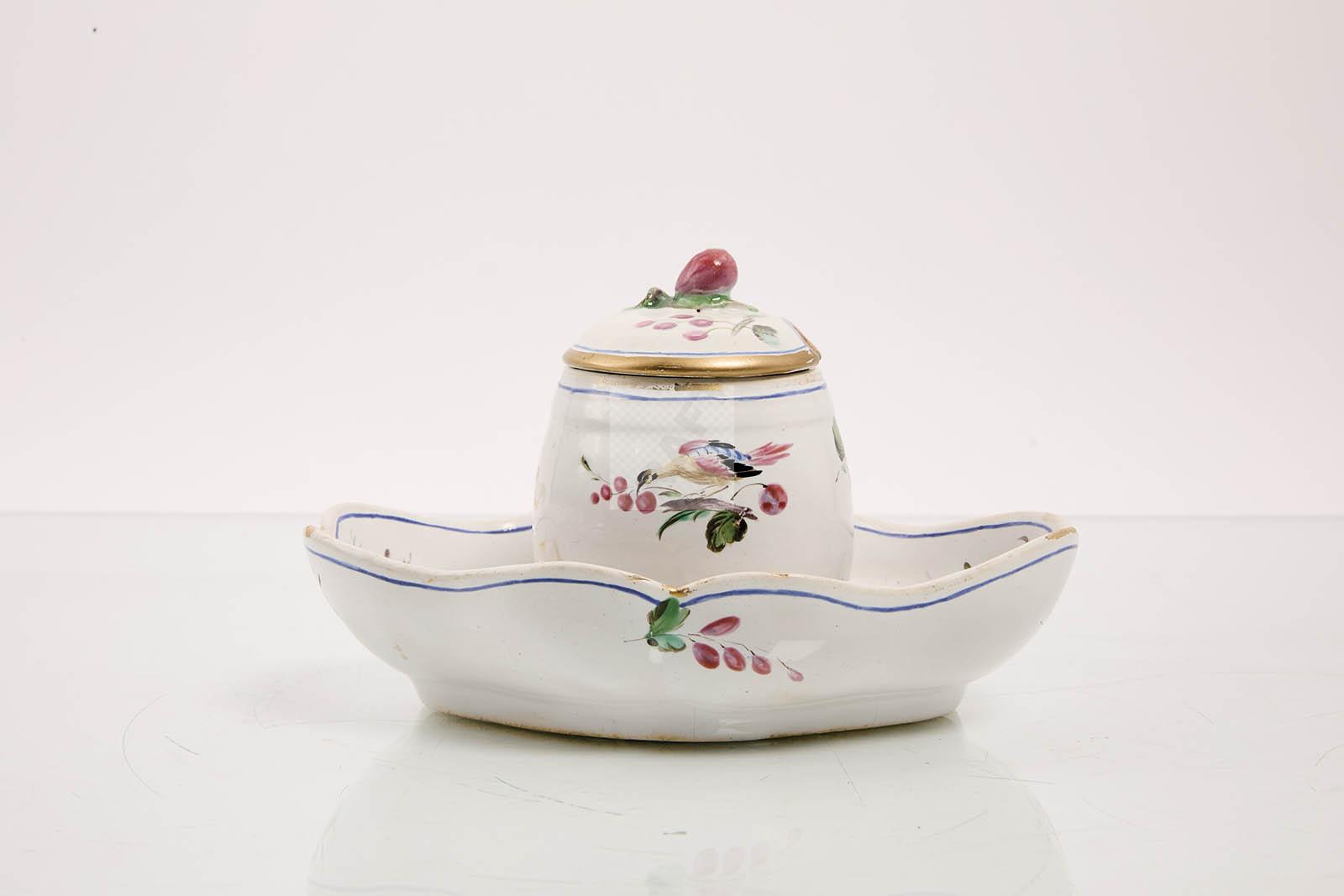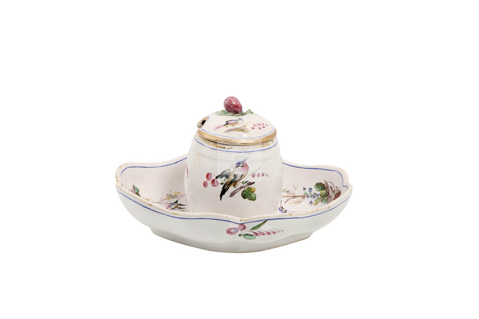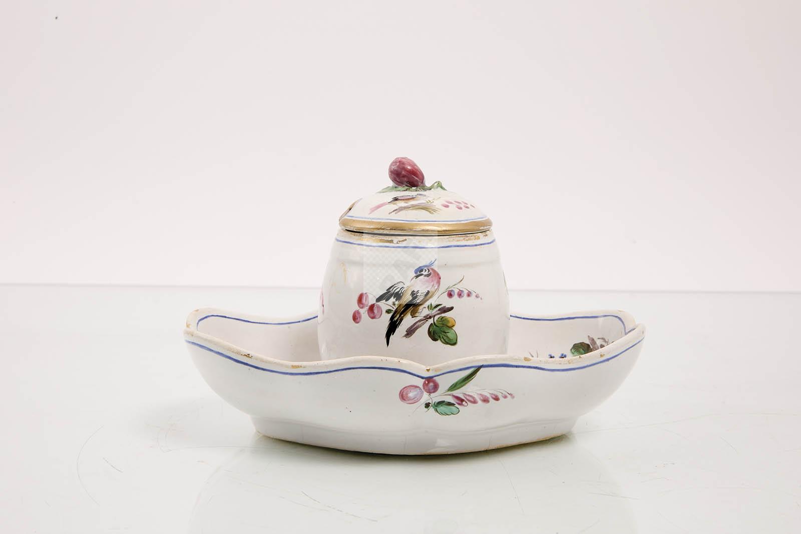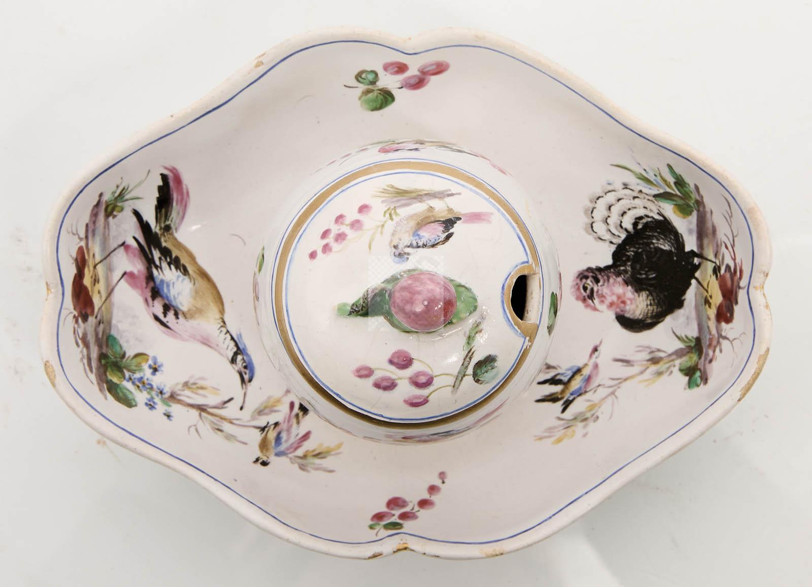 66 Sceaux : moutardier et son couvercle sur plateau adhérant en faïence stannifère à décors polychromes d’oiseaux. Epoque : 1770-1775. Etat : couvercle restauré.