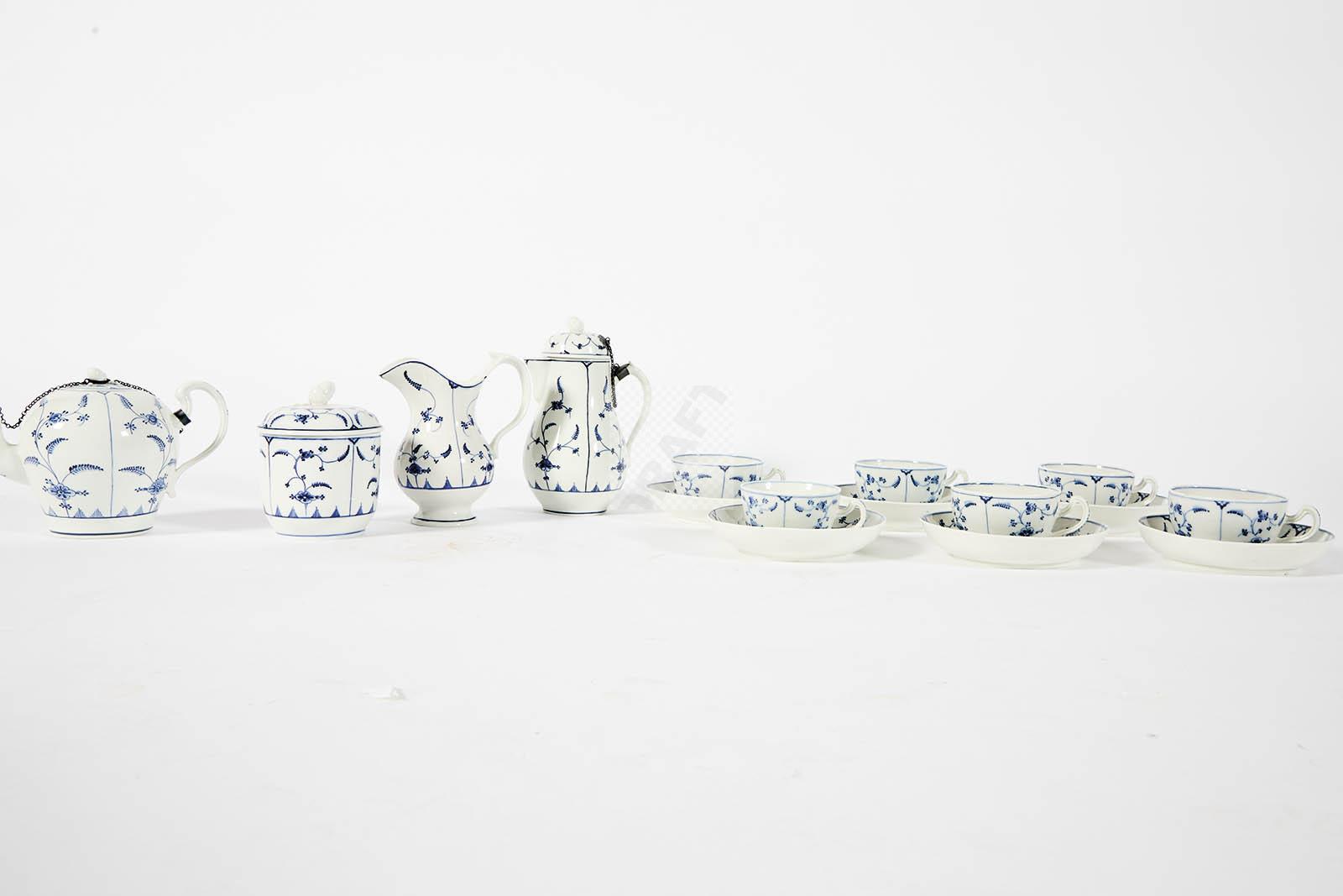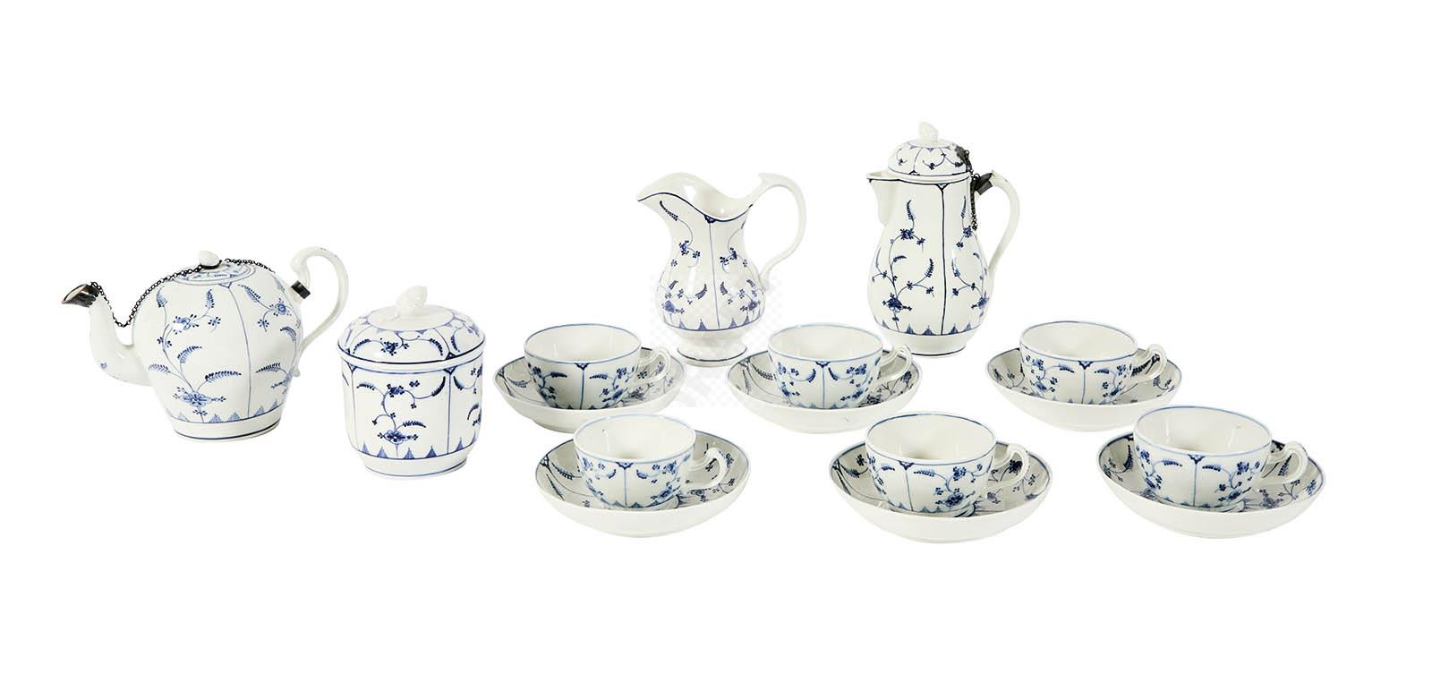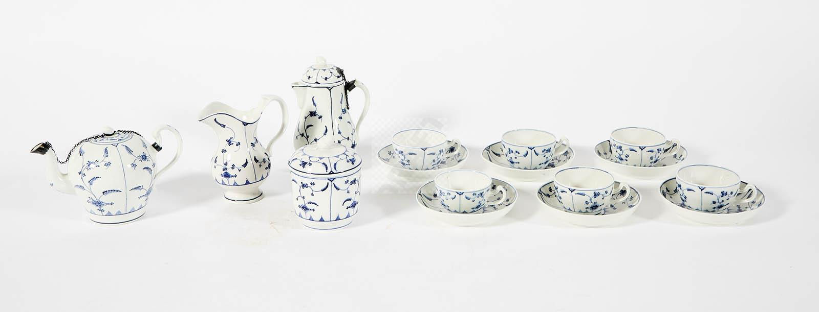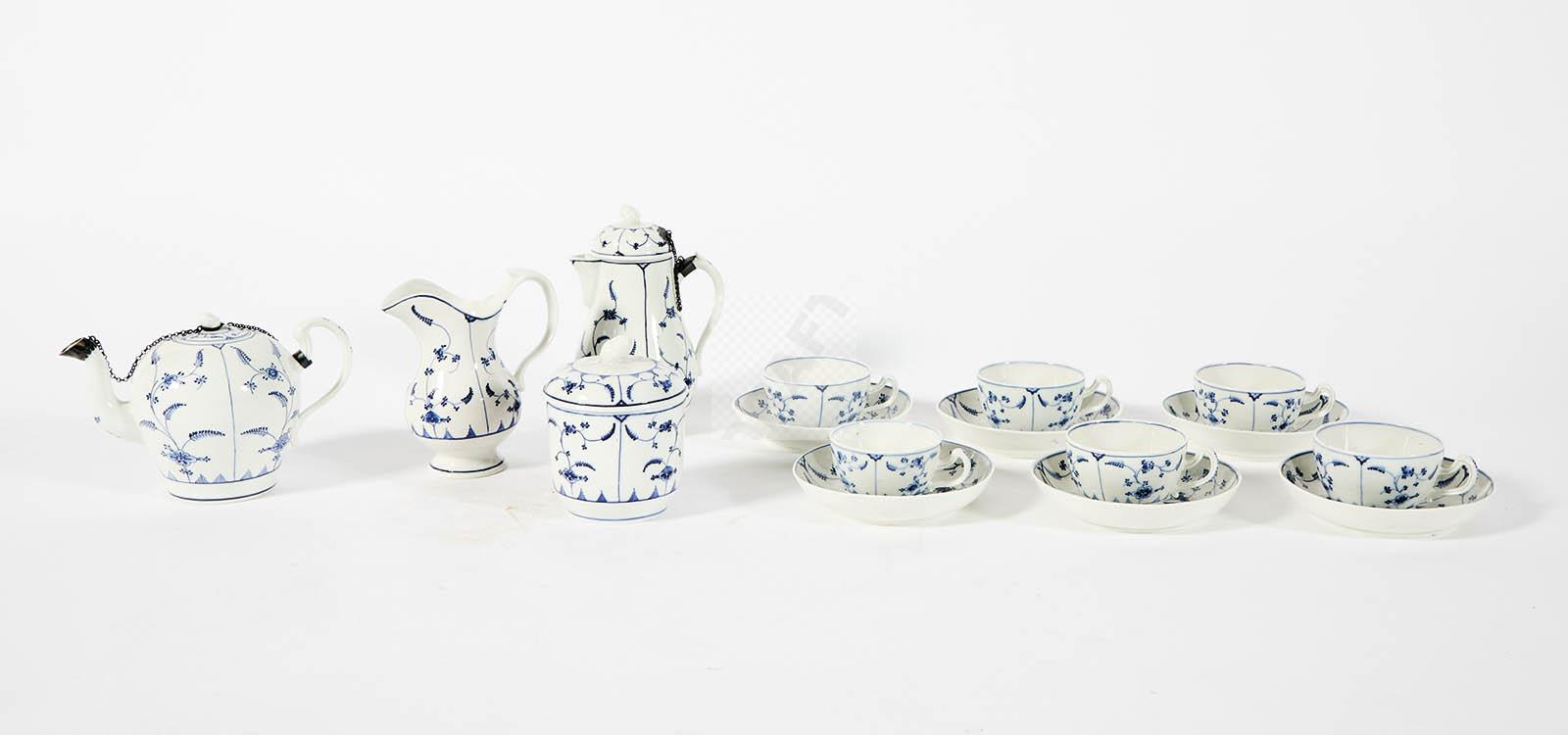 Service en porcelaine tendre à décor Saxe. Théière, pot lait, sucrier, verseuse couverte, 6 tasses, 6 sous tasses. Tournai, 3ème période, 1775-1800. Ht de la verseuse la plus haute : 18.5 cm.