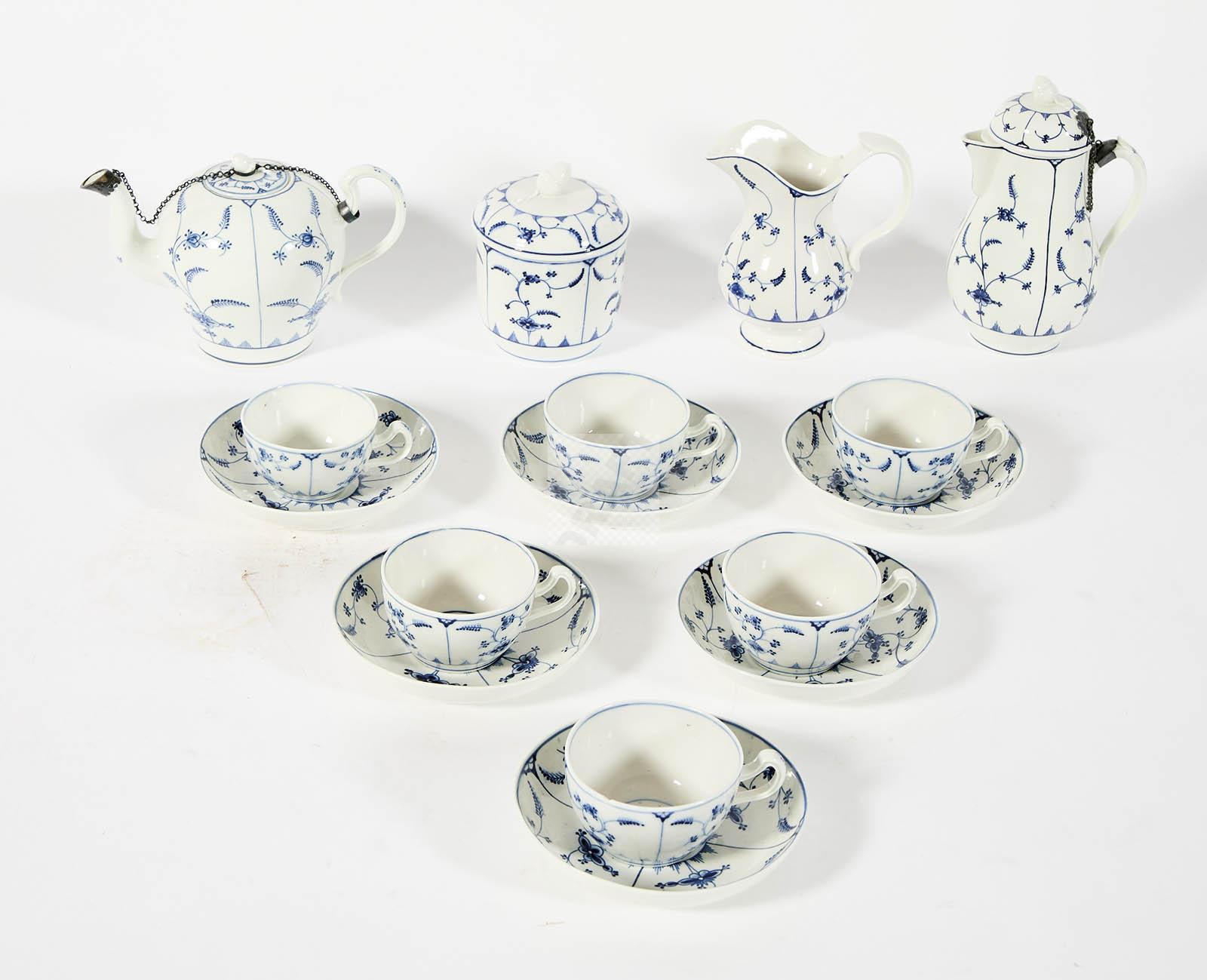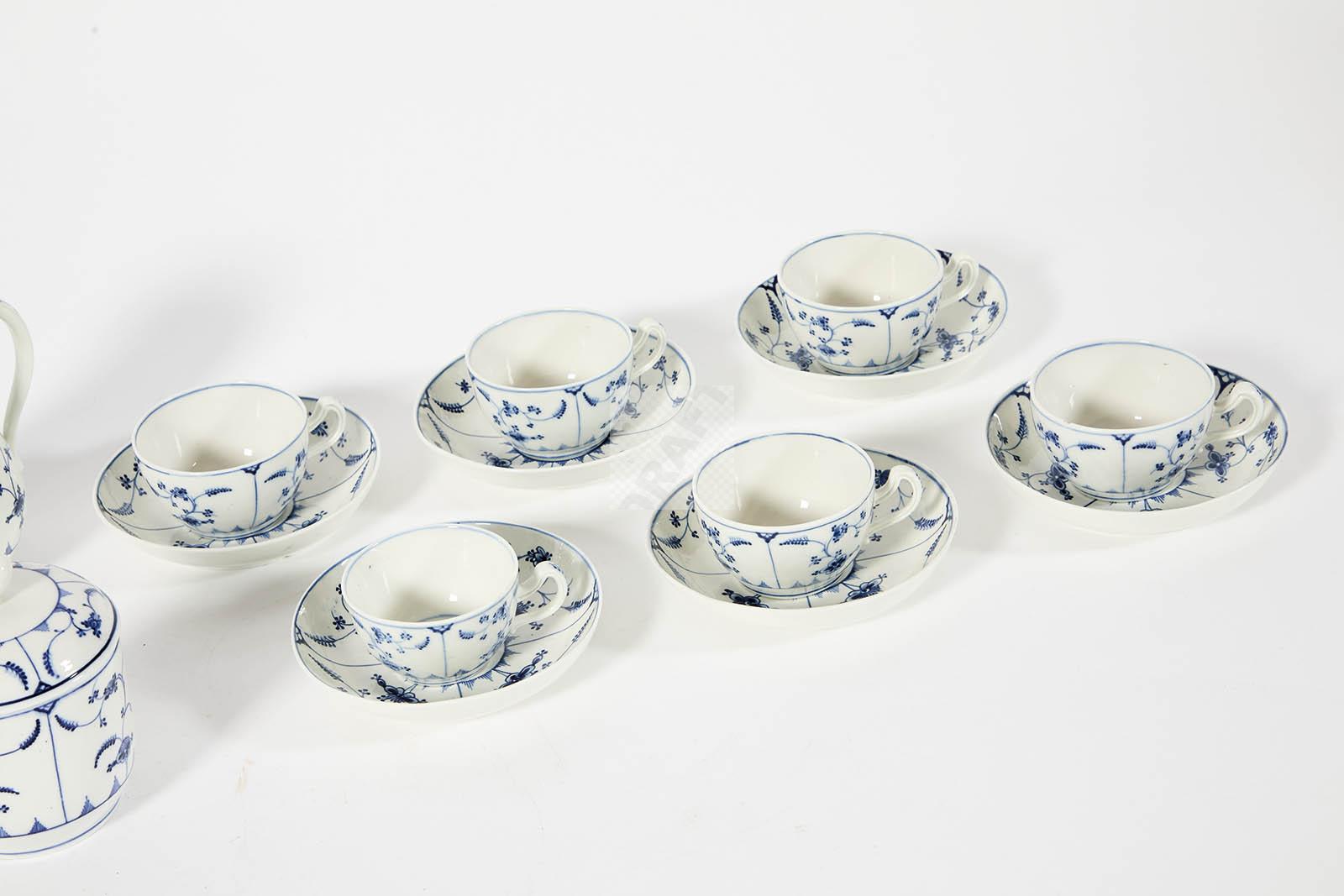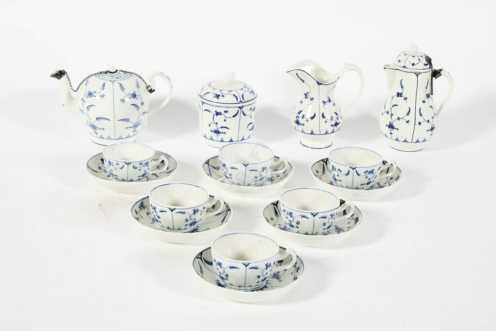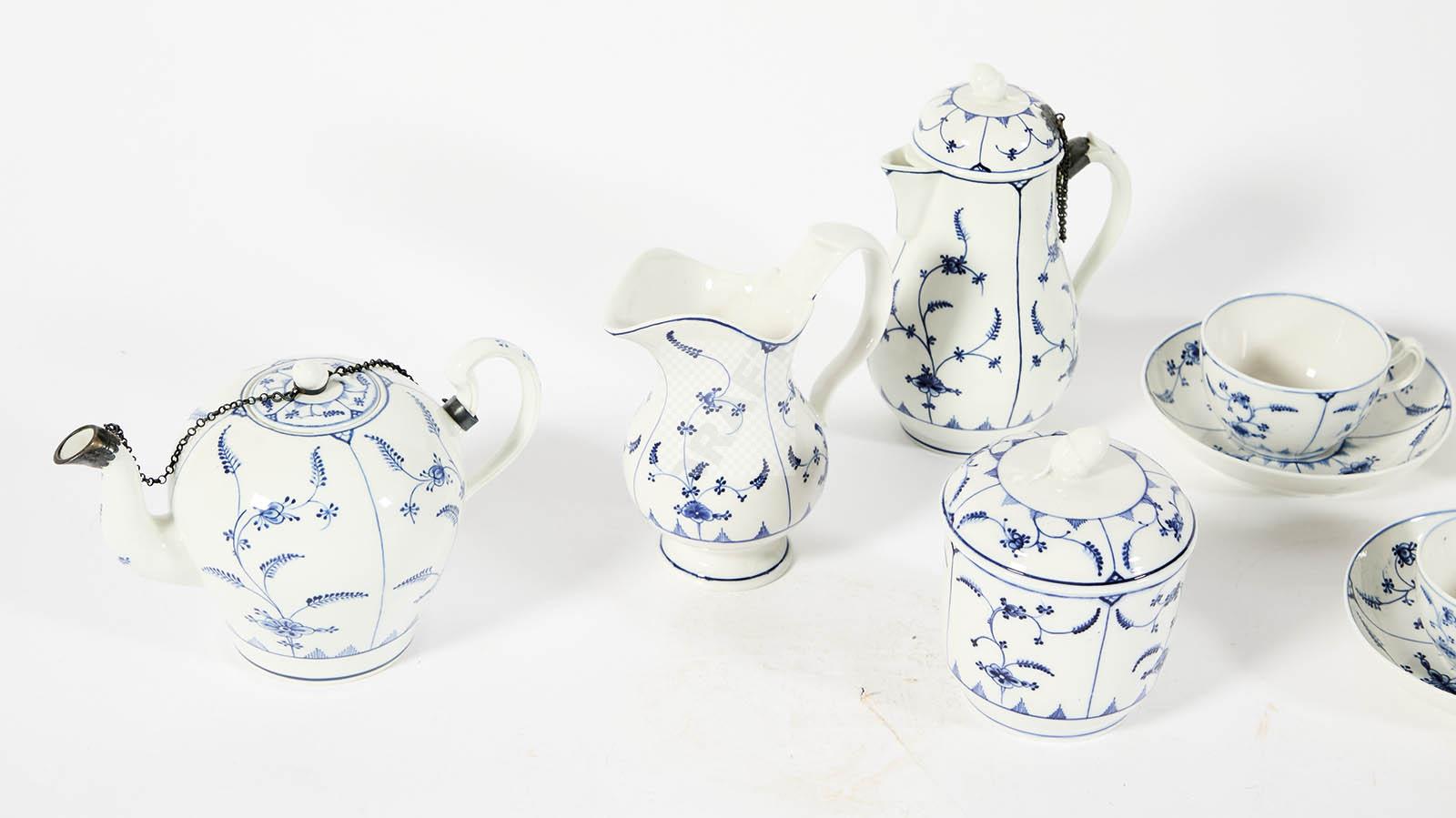 Service en porcelaine tendre à décor Saxe. Théière, pot lait, sucrier, verseuse couverte, 6 tasses, 6 sous tasses. Tournai, 3ème période, 1775-1800. Ht de la verseuse la plus haute : 18.5 cm.