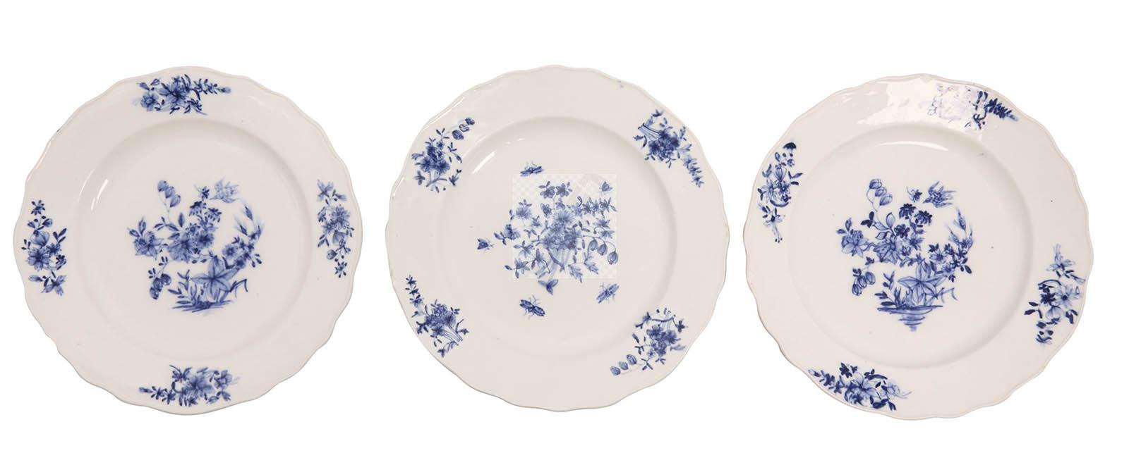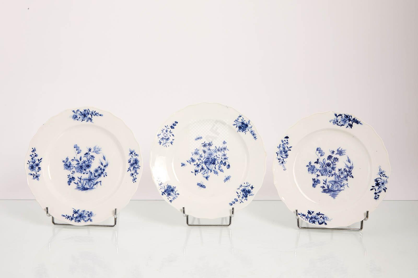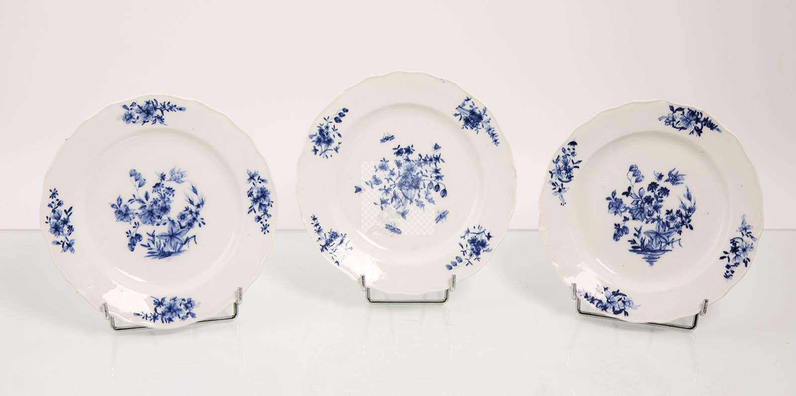 95 Tournai : trois assiettes en porcelaine tendre à décors de fleurs peints en camaïeu bleu de grand feu. Epoque : vers 1755. Etat : petits éclats. Diam : 21.8 cm