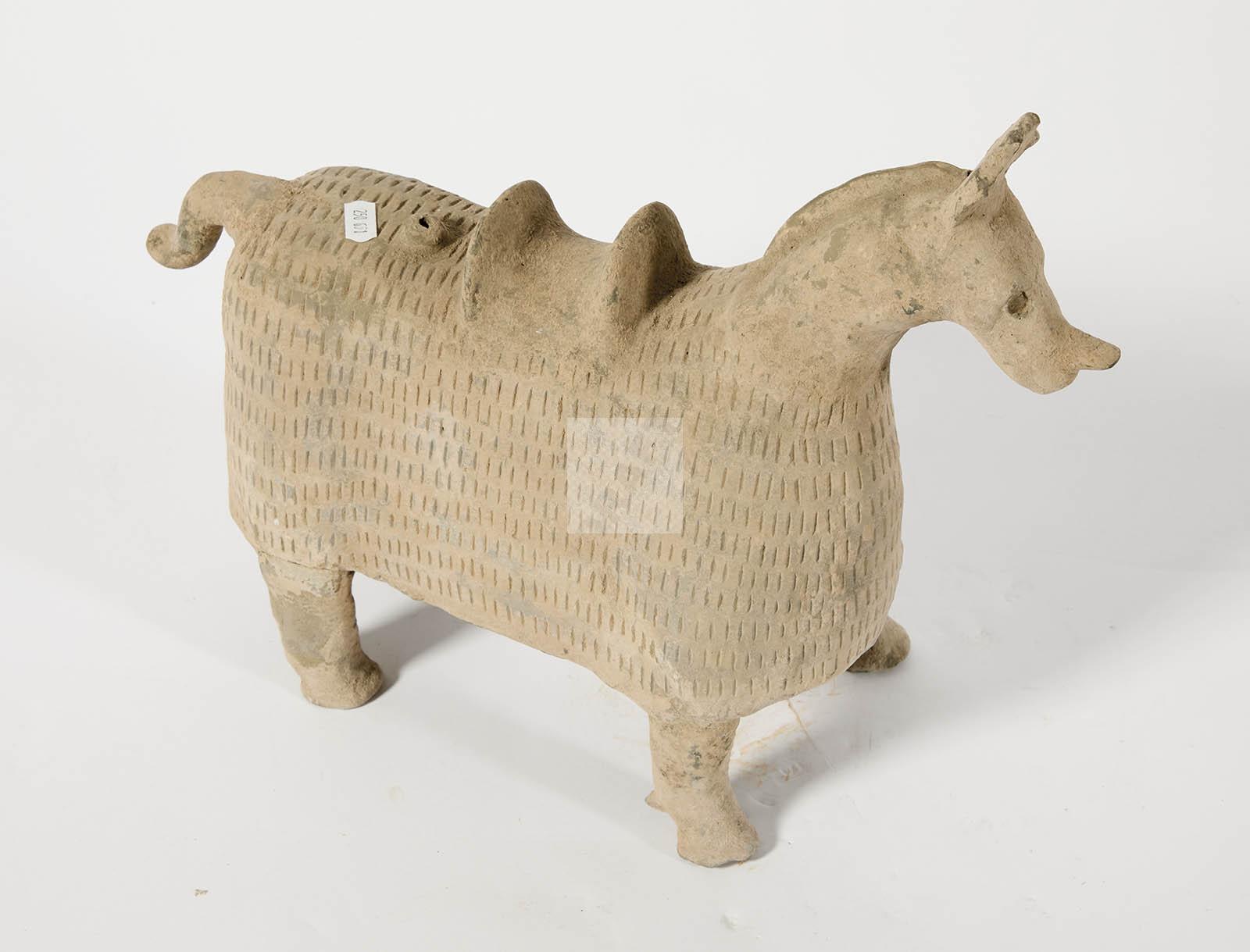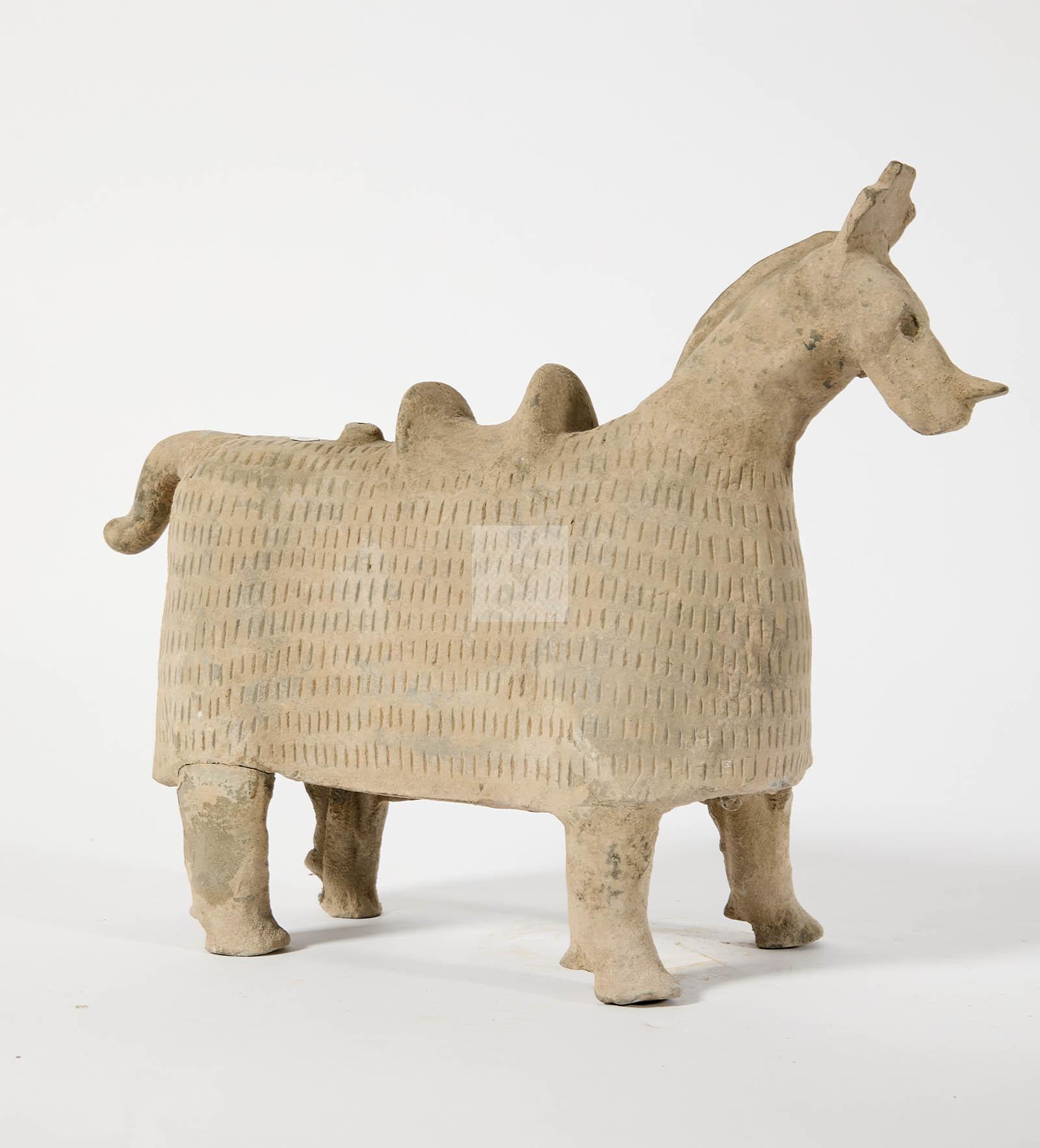 Lot n°99 - 99 Chine : Cheval caparaçonné en terre-cuite grise. Chine, style