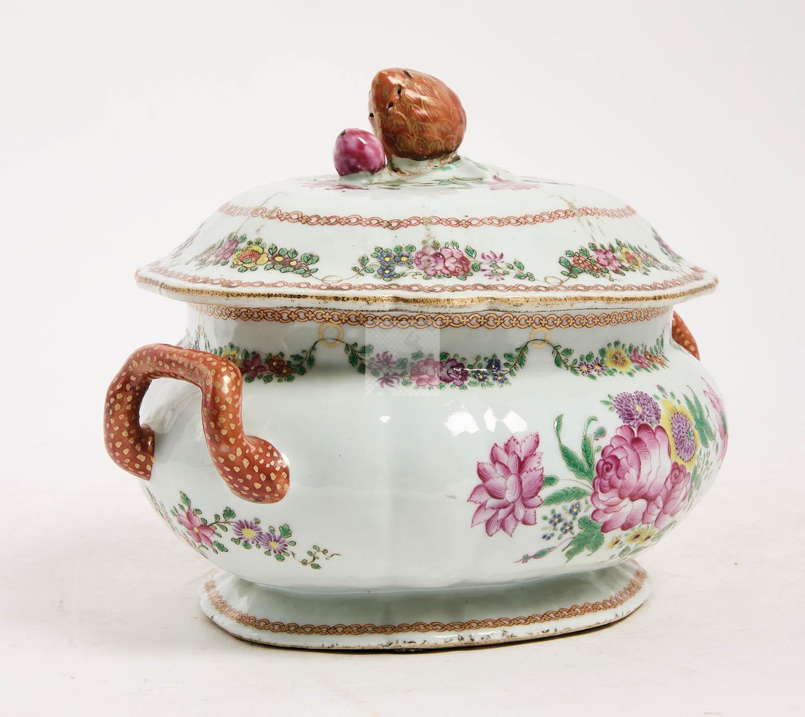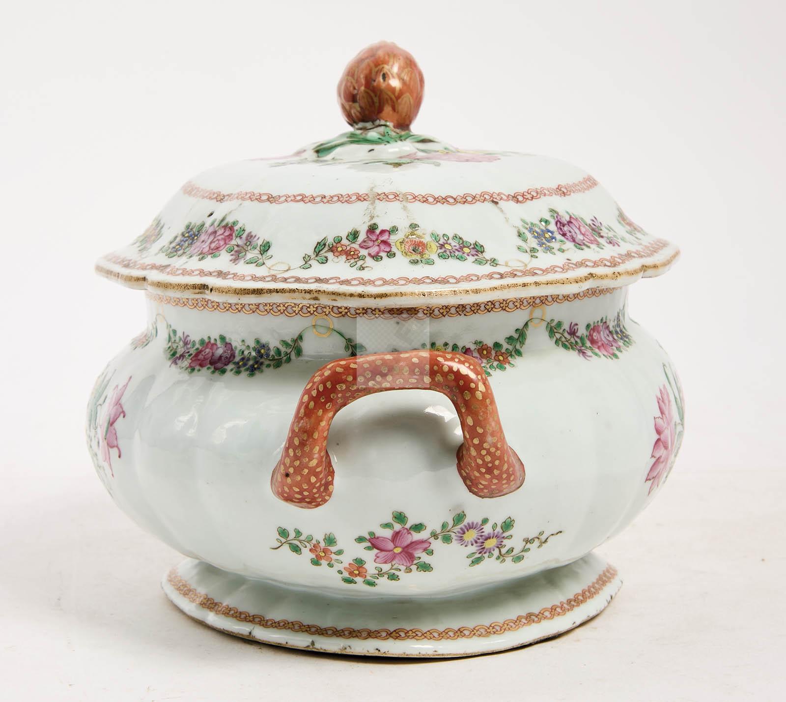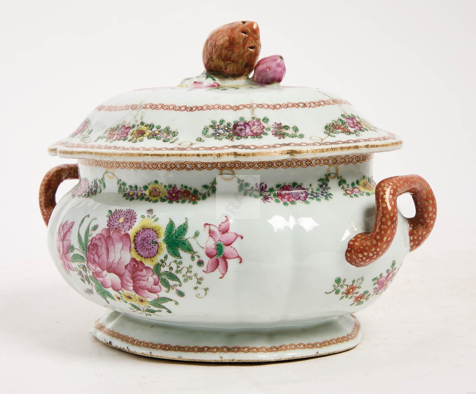 Terrine à larges côtes en porcelaine polychrome à décor de jeté de fleurs et guirlandes fleuris. Epoque : Qianlong (1736-1795)