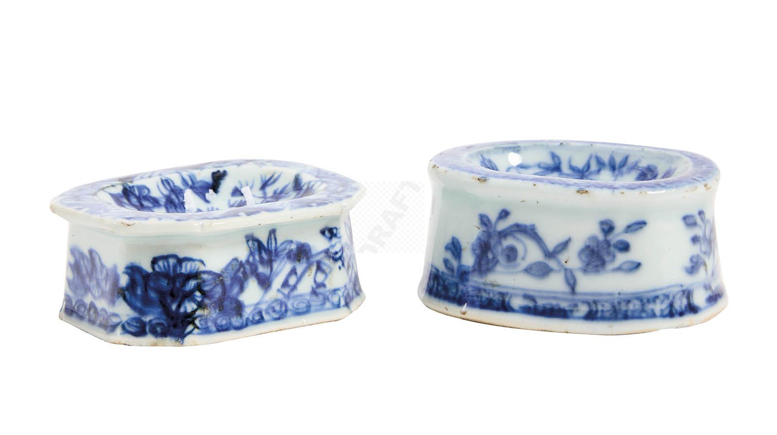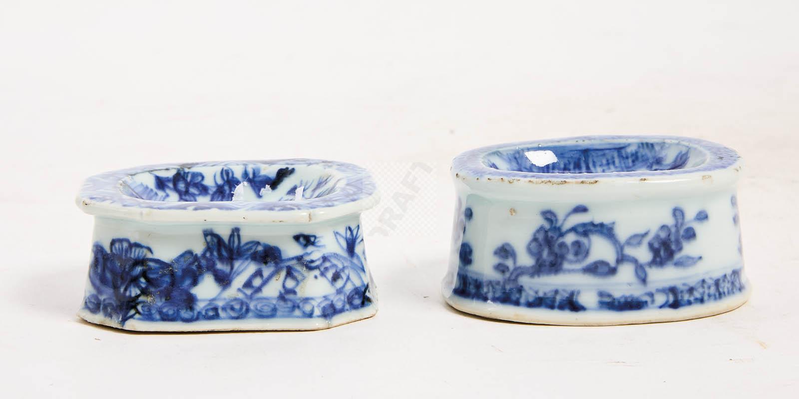 Deux salerons en porcelaine camaïeu bleu à décors végétaux stylisés .