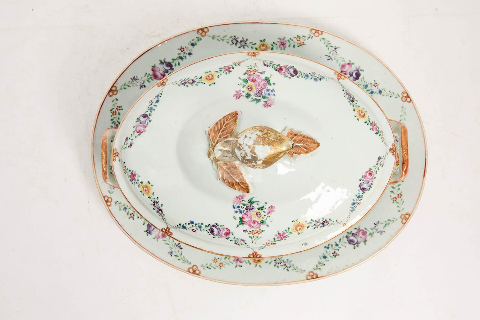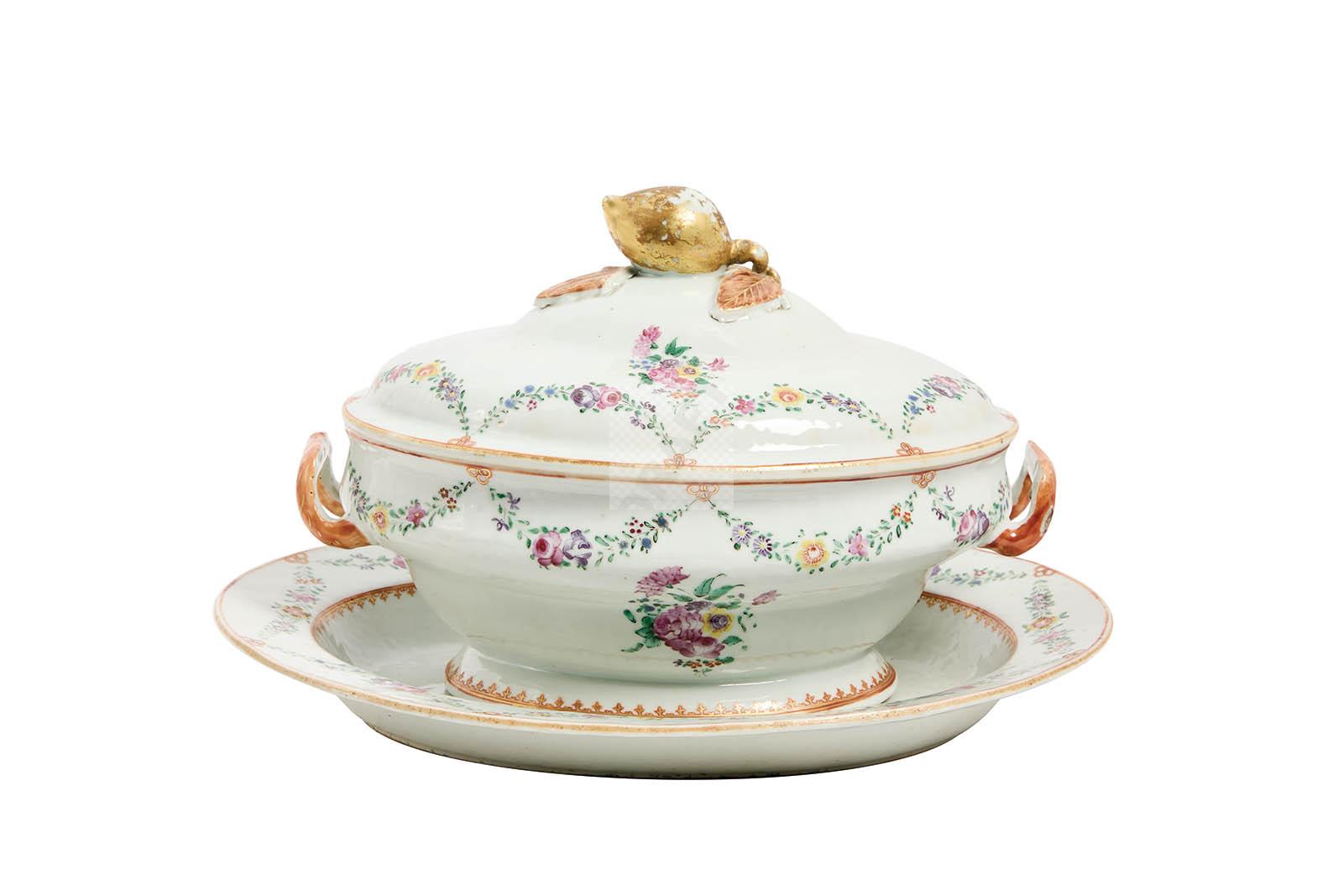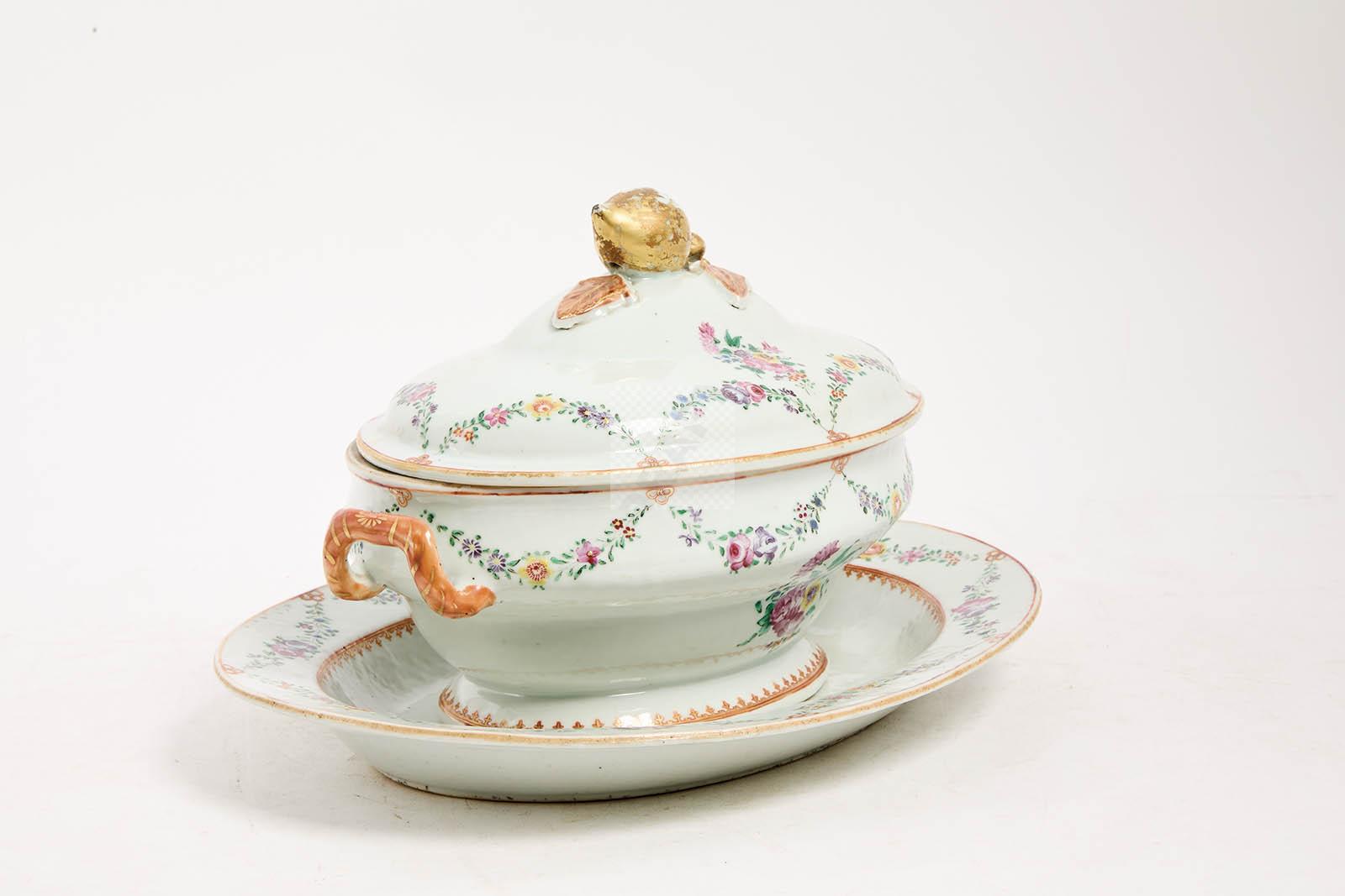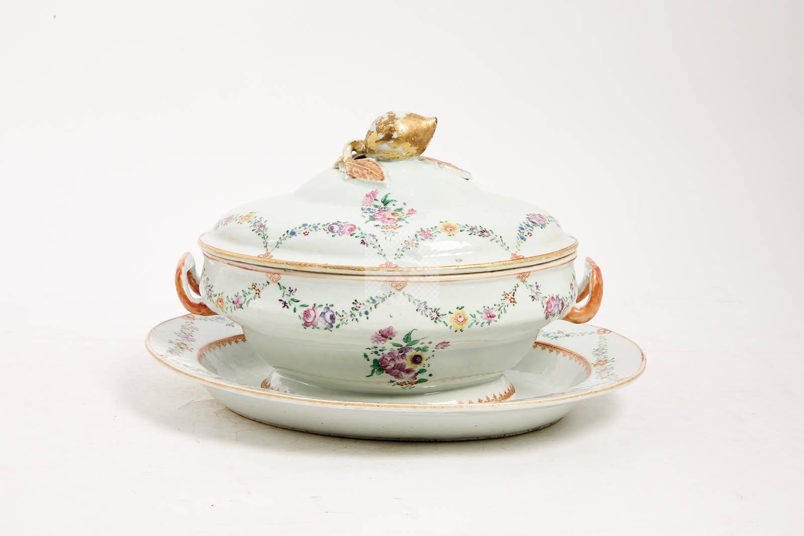 Terrine et son dormant en porcelaine polychrome à décor de jetée de fleurs et guirlandes fleuris, prise à décor de fruit.