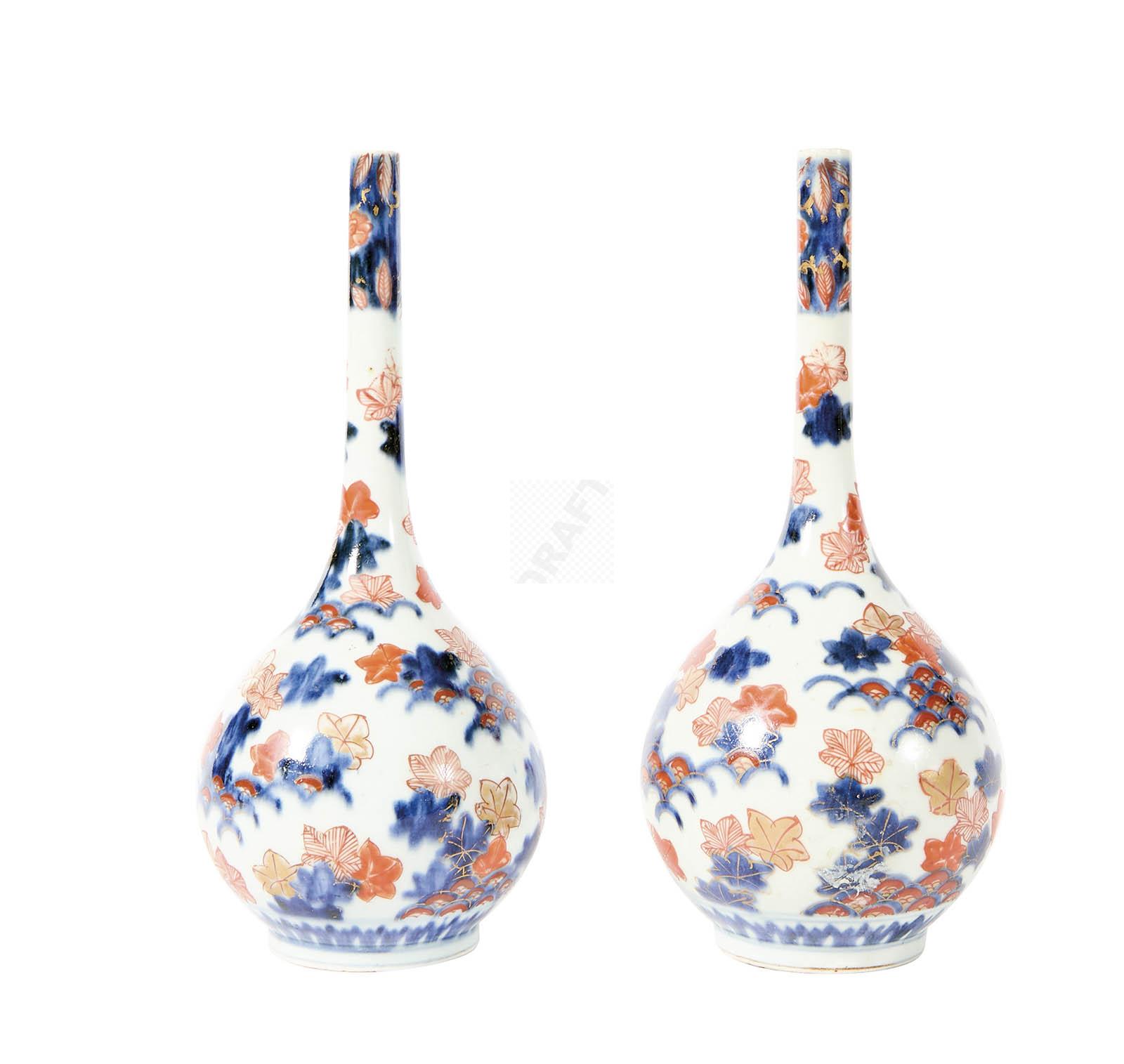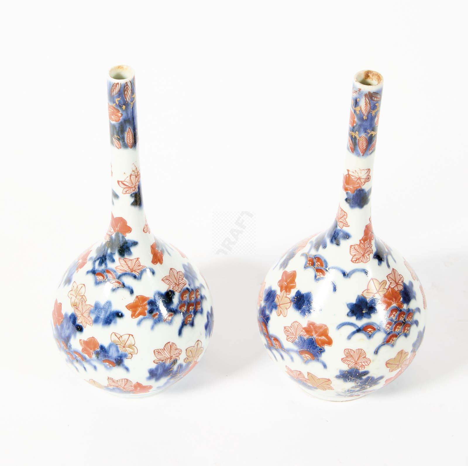 Paire de vase bouteille en porcelaine Imari à colle élancé, décorés dans des couleurs traditionnelles de fleurs, feuillage et réhauts d’or.
