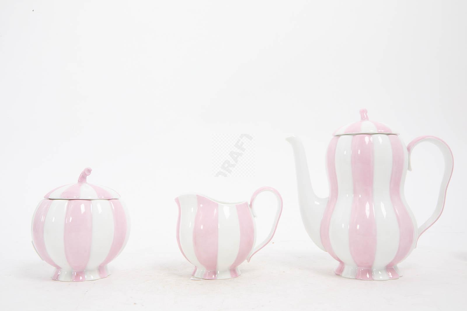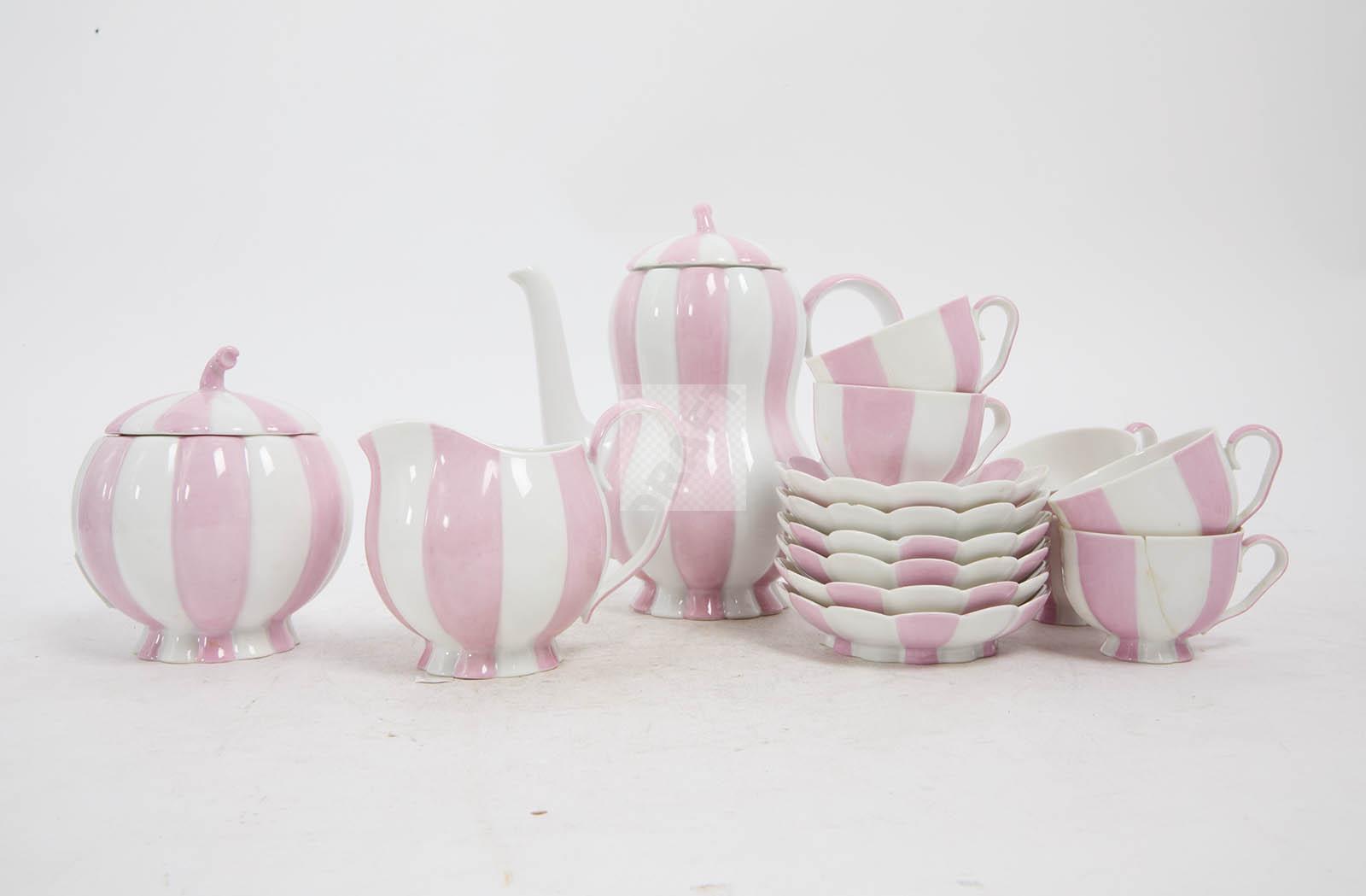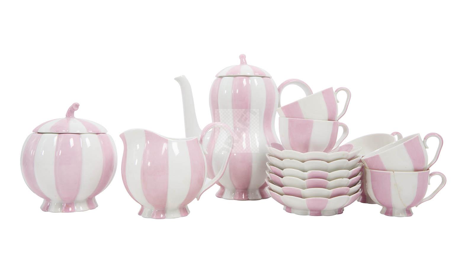 Rare partie de service en porcelaine « Melon » (créé en 1929), à décor polychrome de rayures rose et blanc, comprenant six tasses et six sous-tasses, un pot à lait, un sucrier et une cafetière,