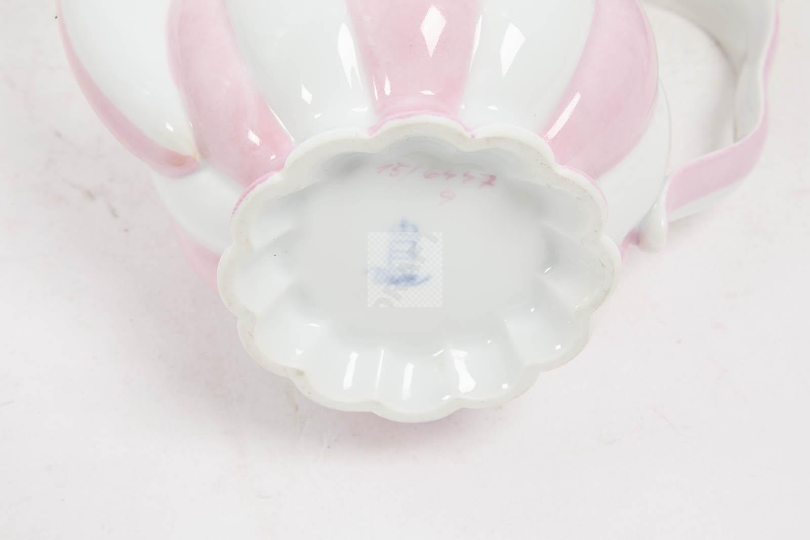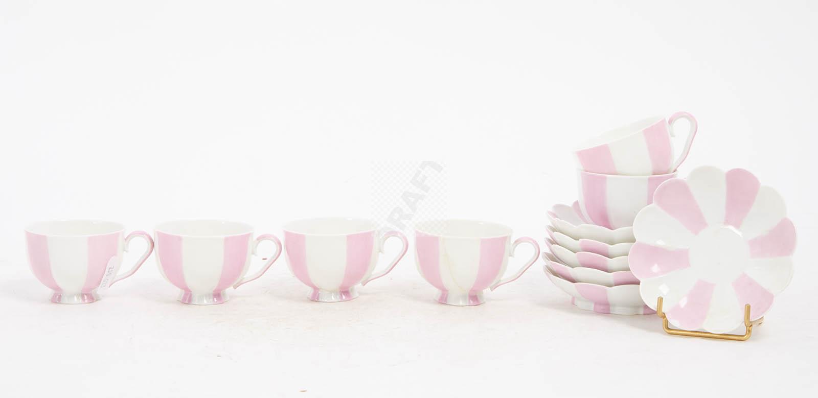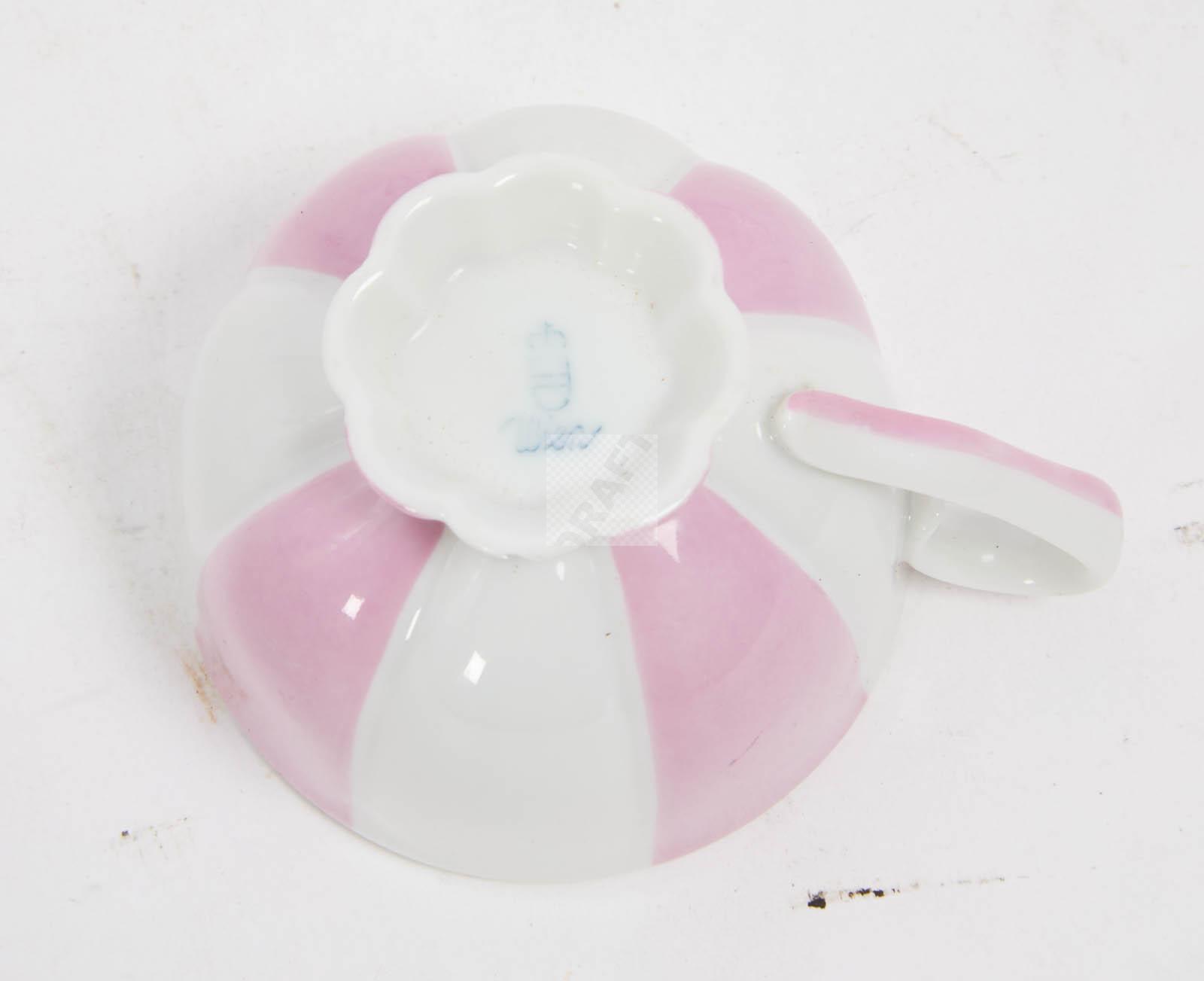 Rare partie de service en porcelaine « Melon » (créé en 1929), à décor polychrome de rayures rose et blanc, comprenant six tasses et six sous-tasses, un pot à lait, un sucrier et une cafetière,