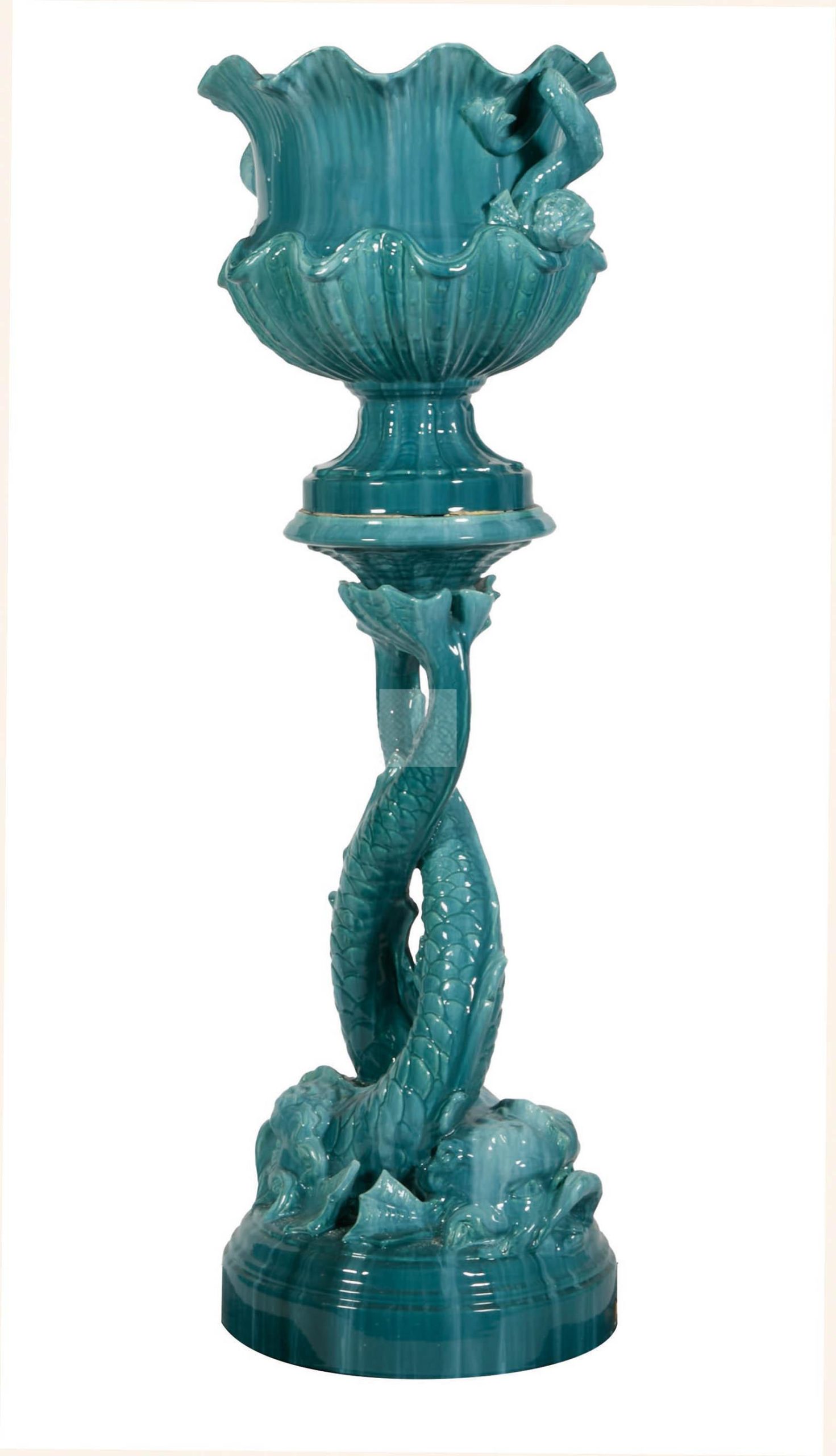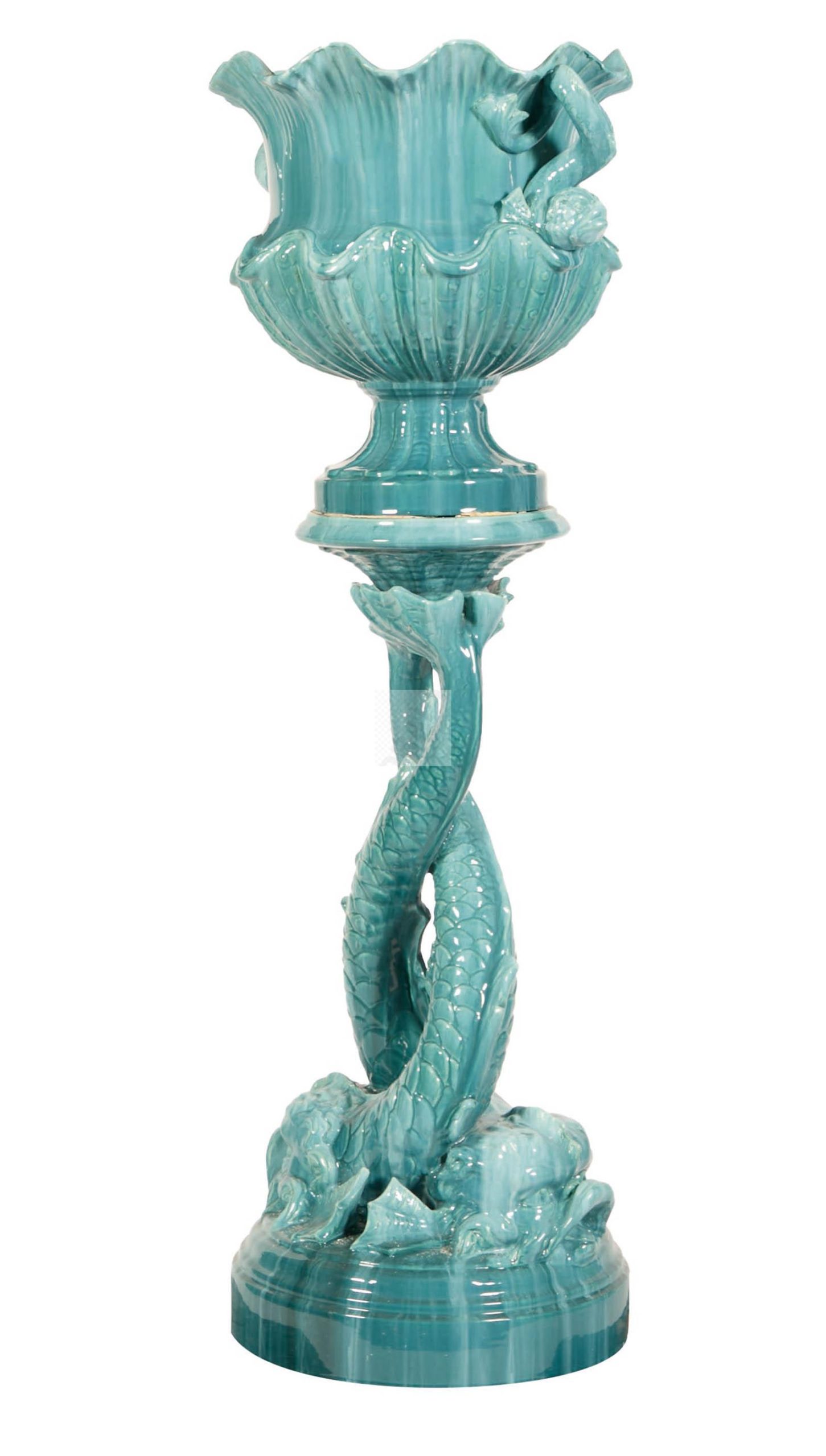 140 Important cache pot en faïence fine, pied ajouré à décor de dauphins entrelacés.