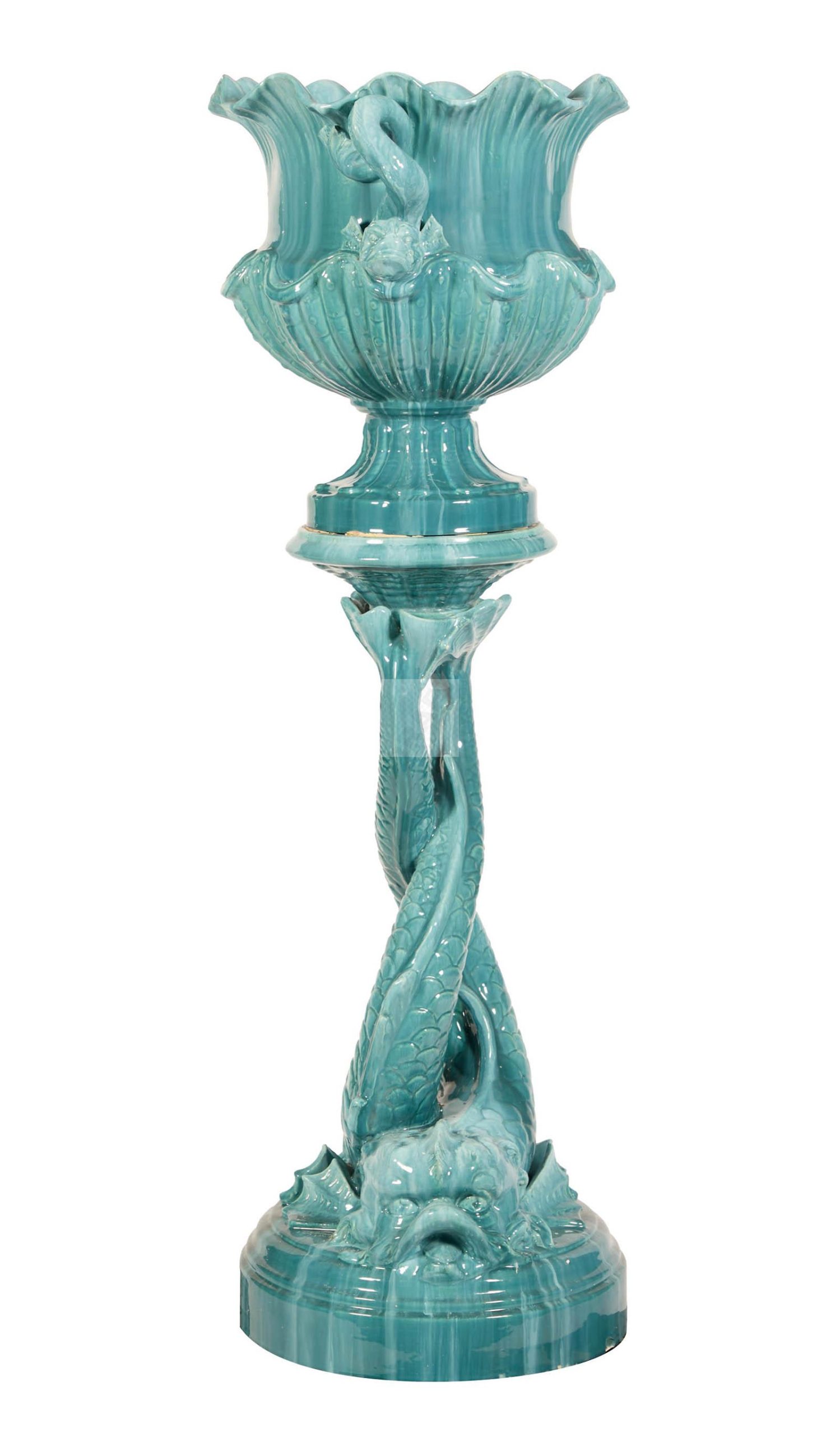 Lot n°140 - 140 Important cache pot en faïence fine, pied ajouré à décor de dauphins entrela