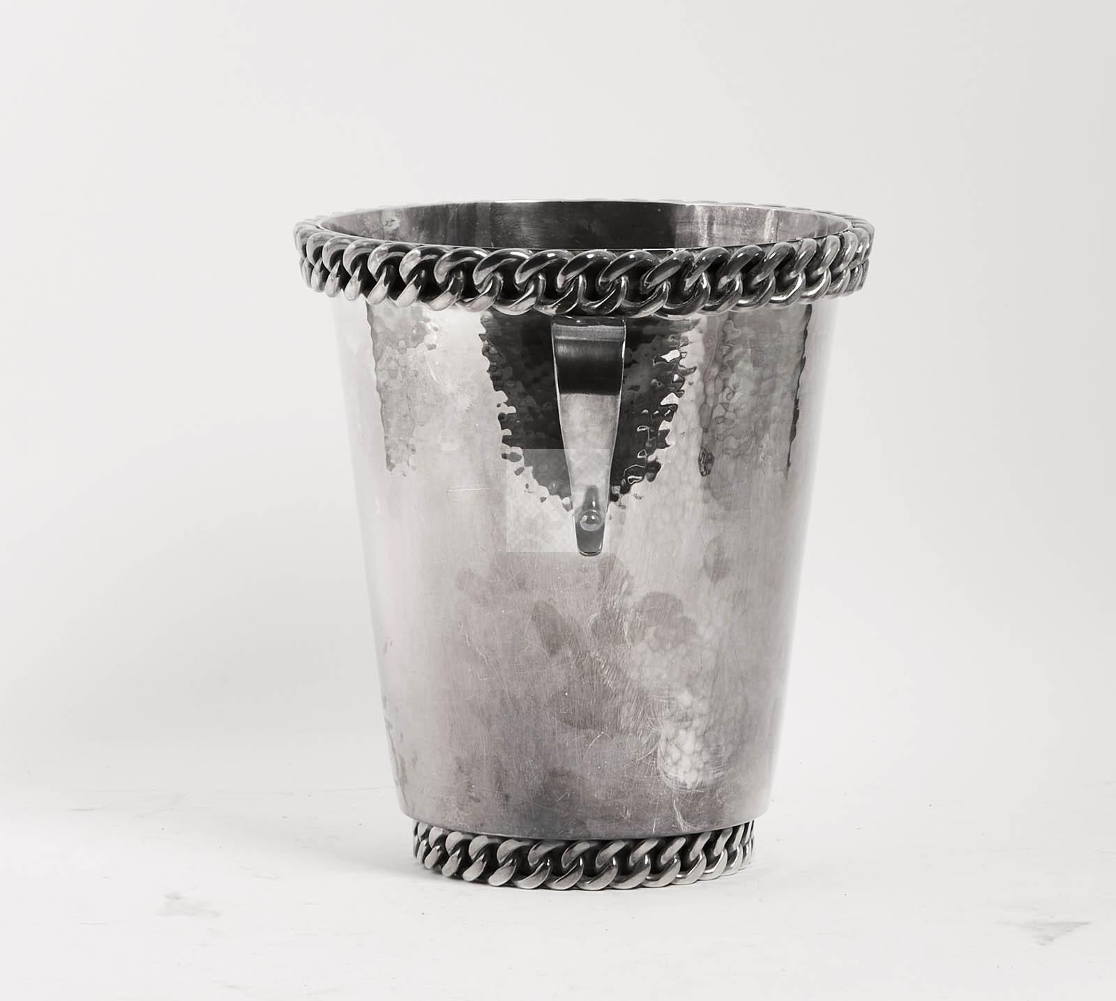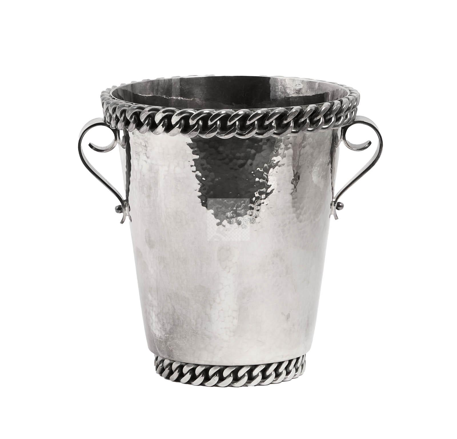 Seau à champagne en métal argenté martelé, anses à volutes , base et col soulignés de motifs de gourmettes.