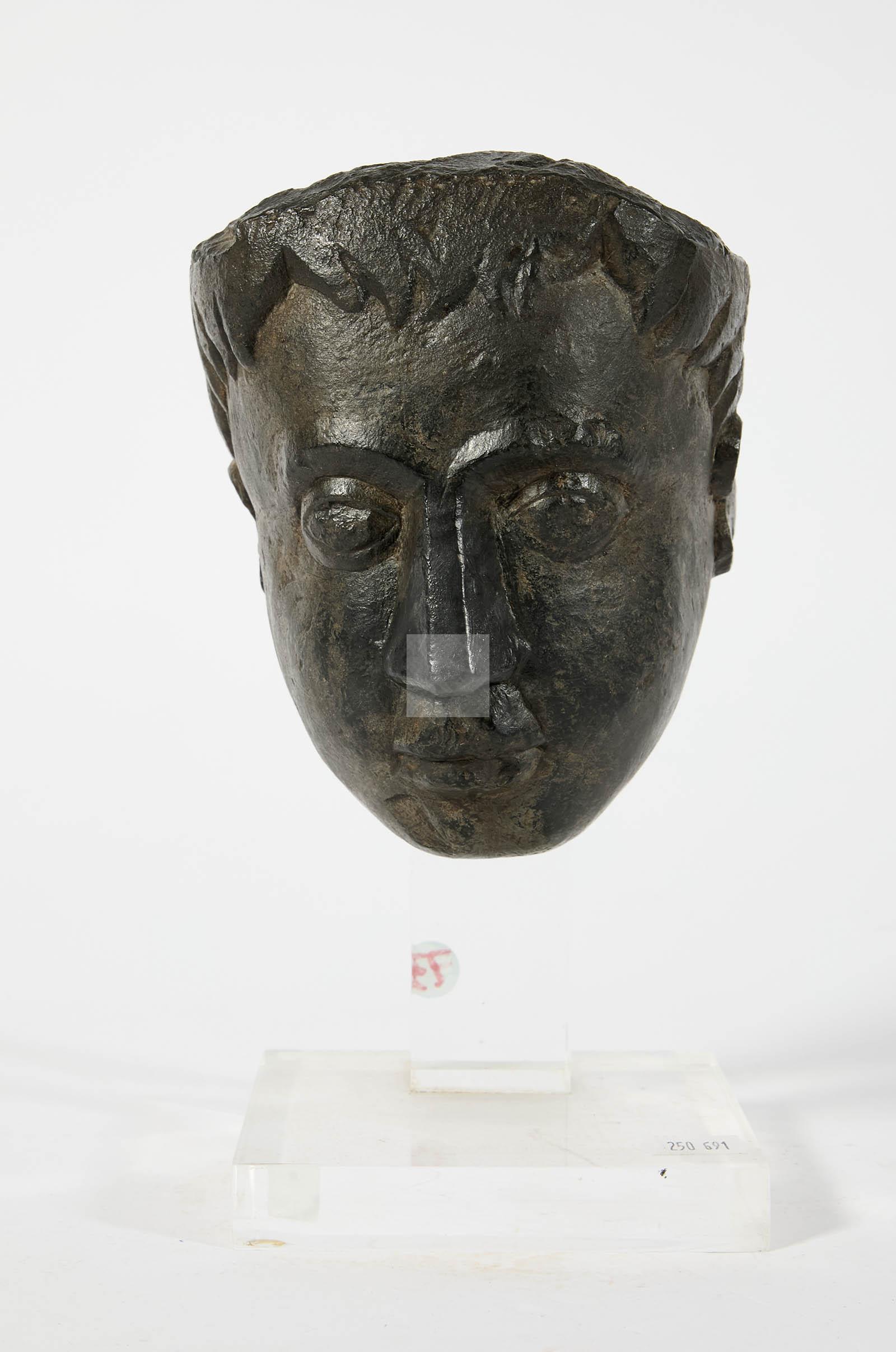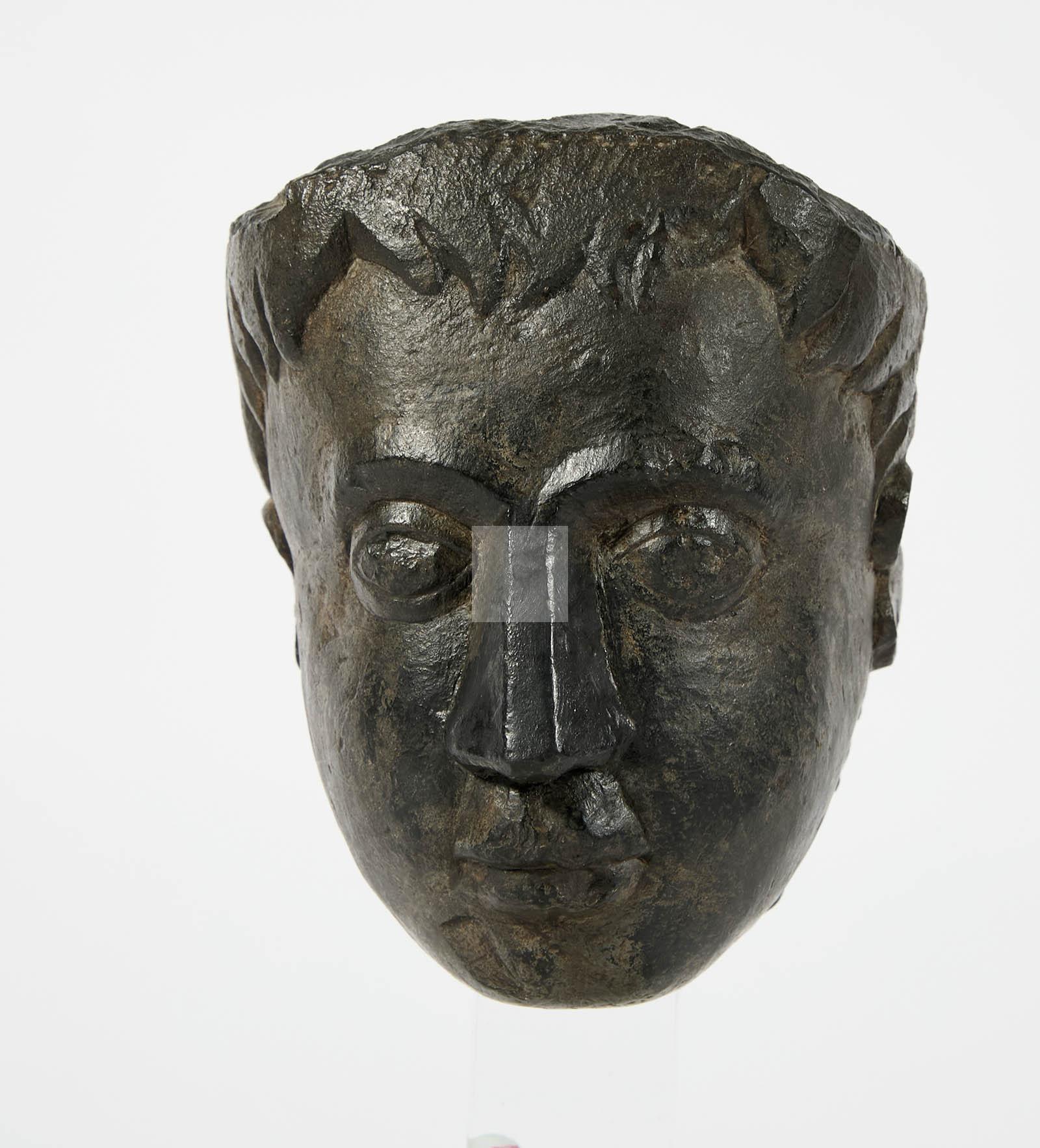 151Tête en pierre calcaire sculptée et patinée noire ; visage ovale, aux traits saillants, yeux en amende aux paupières ourlées, nez droit, bouche charnue. Quelques mèches de cheveux encadrent le haut du visage.