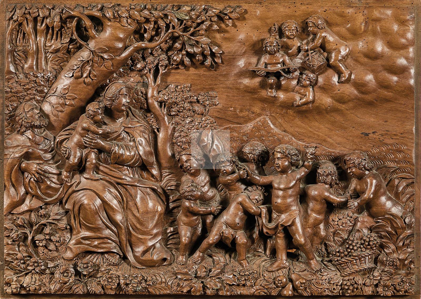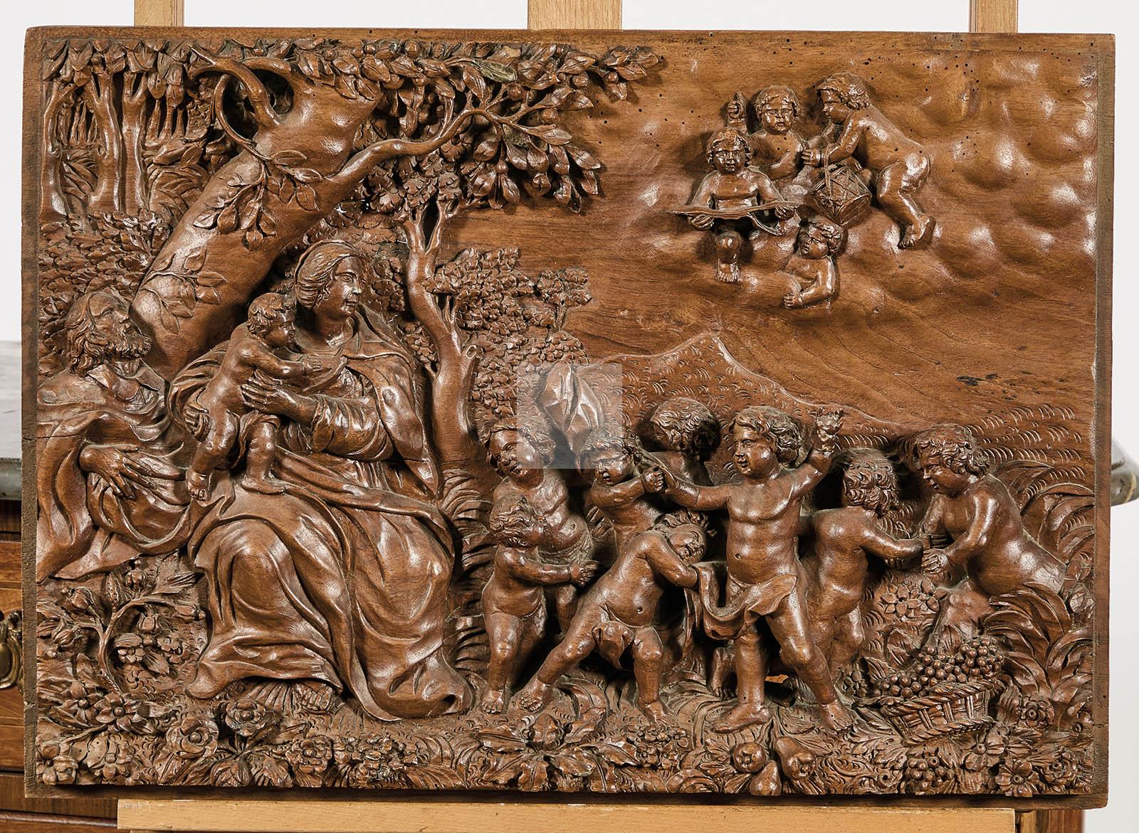 154 Bas-relief en noyer sculpté représentant le repos de la Sainte Famille pendant la fuite en Égypte. Dans un paysage boisé, un cortège d’angelots est aux pieds de Marie, des anges musiciens sont dans le ciel.