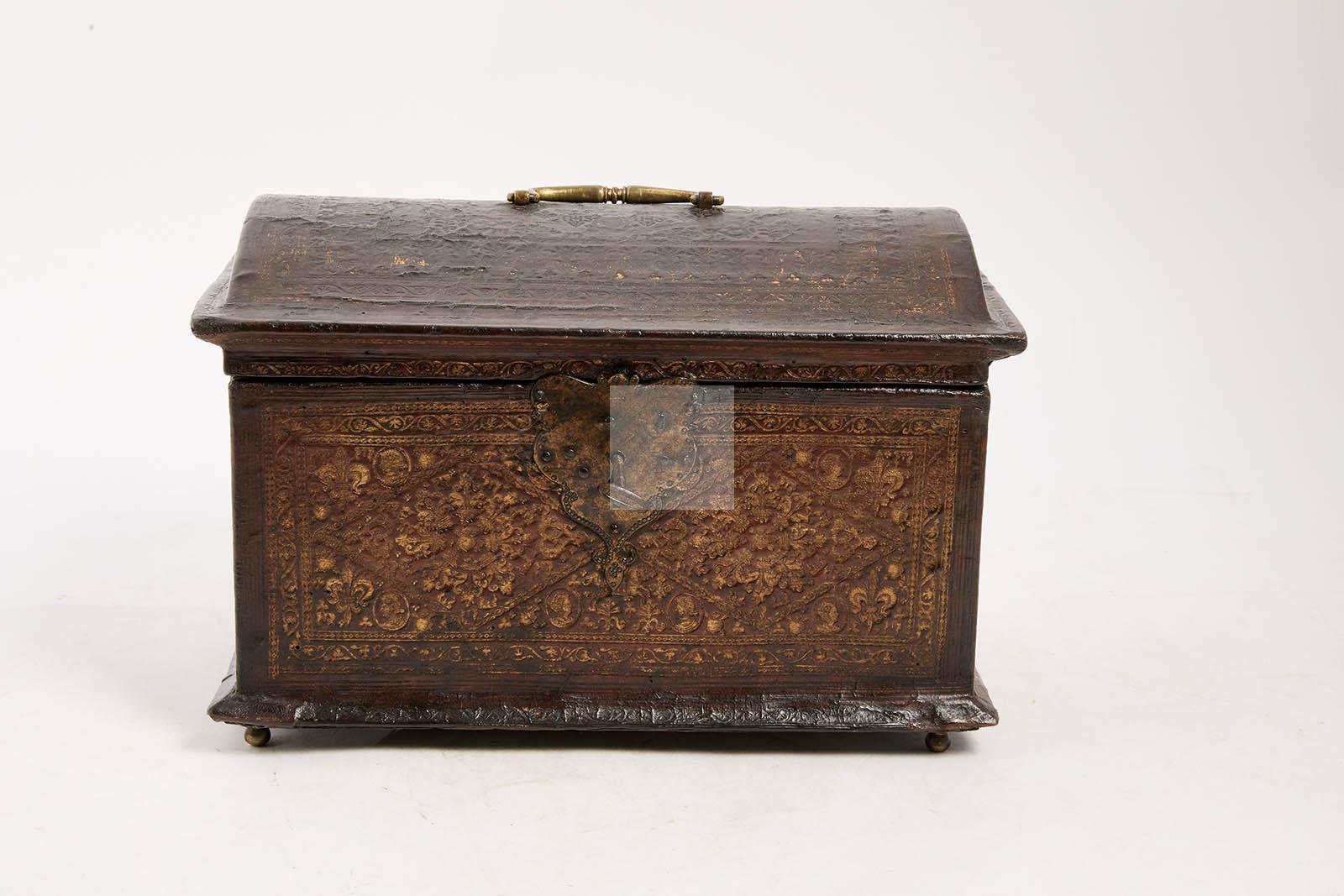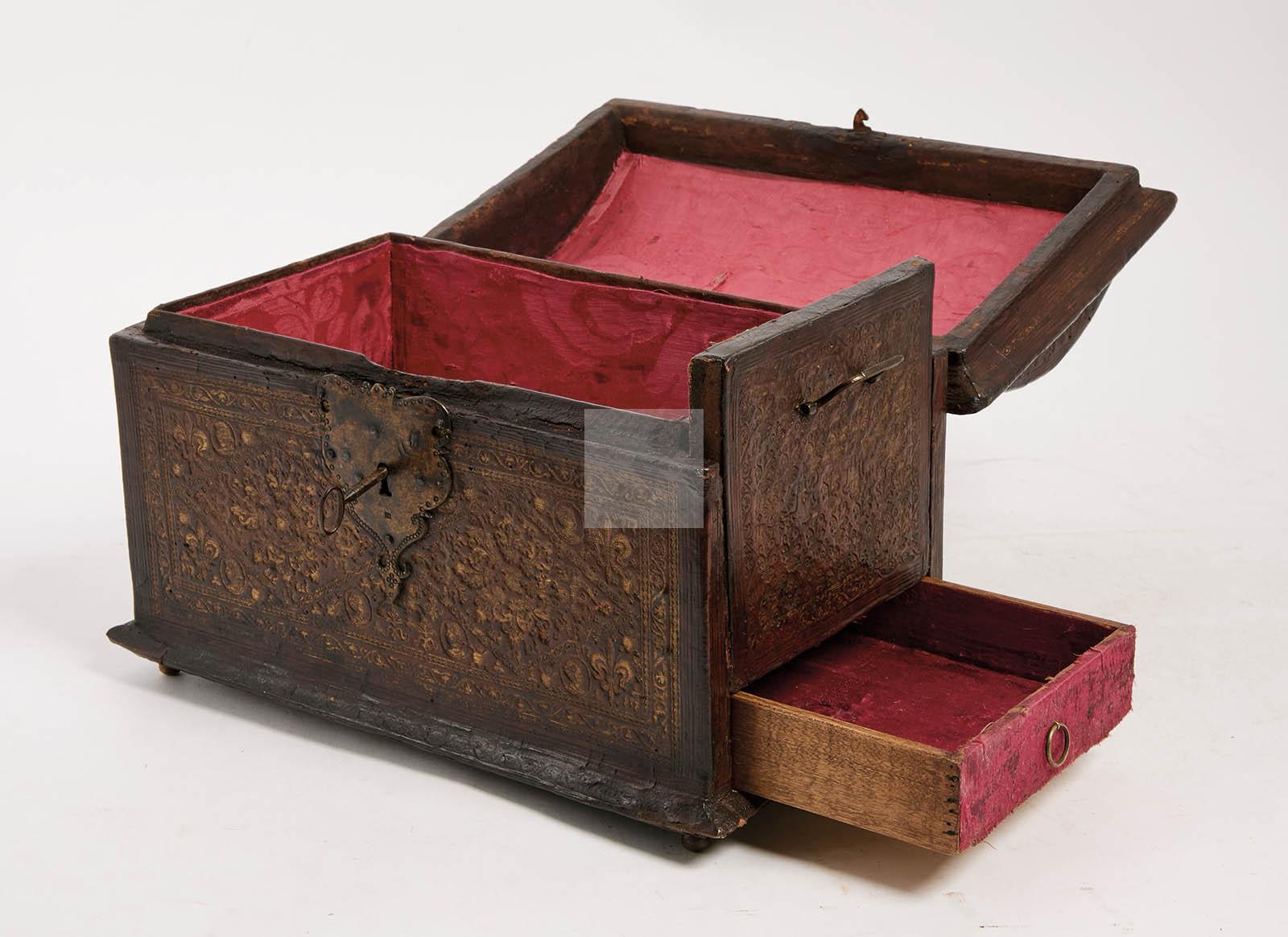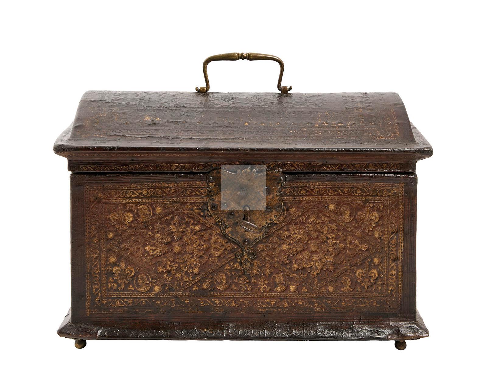 Lot n°161 - 161 Beau coffre gainé de maroquin estampé à réhauts dorés à décor de tête de per