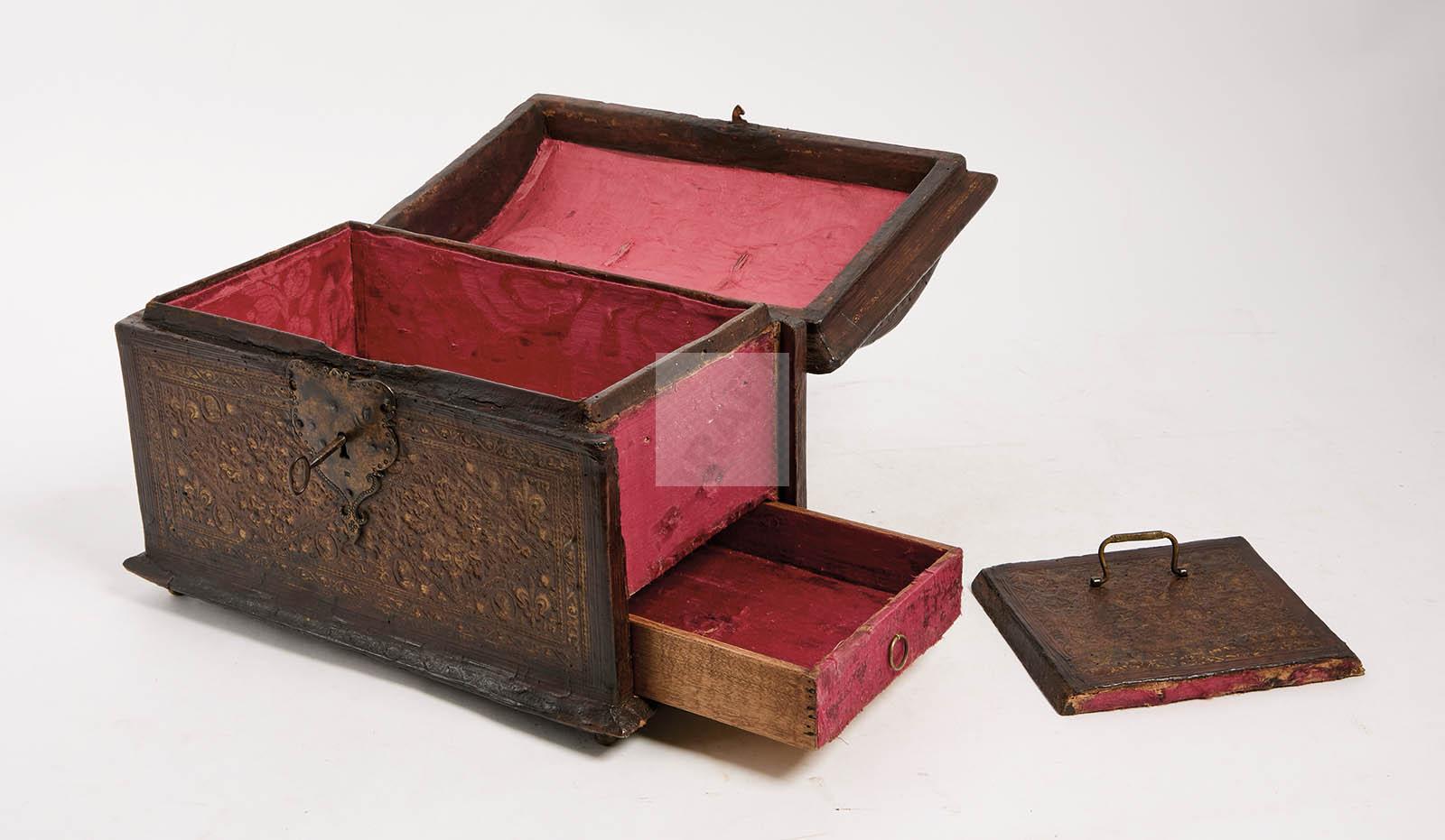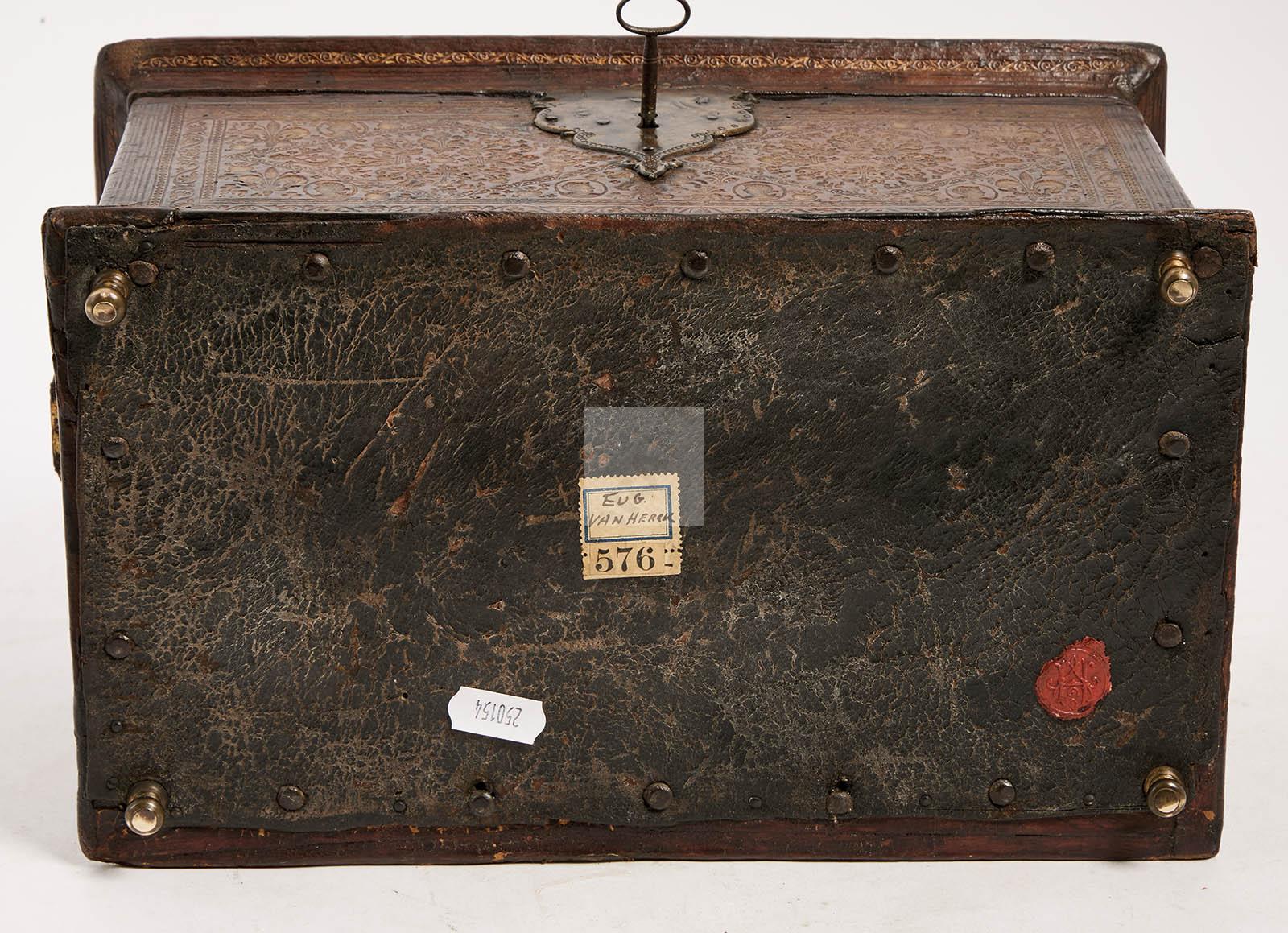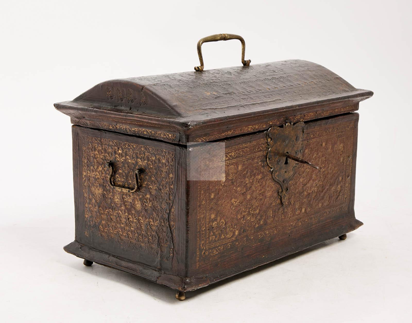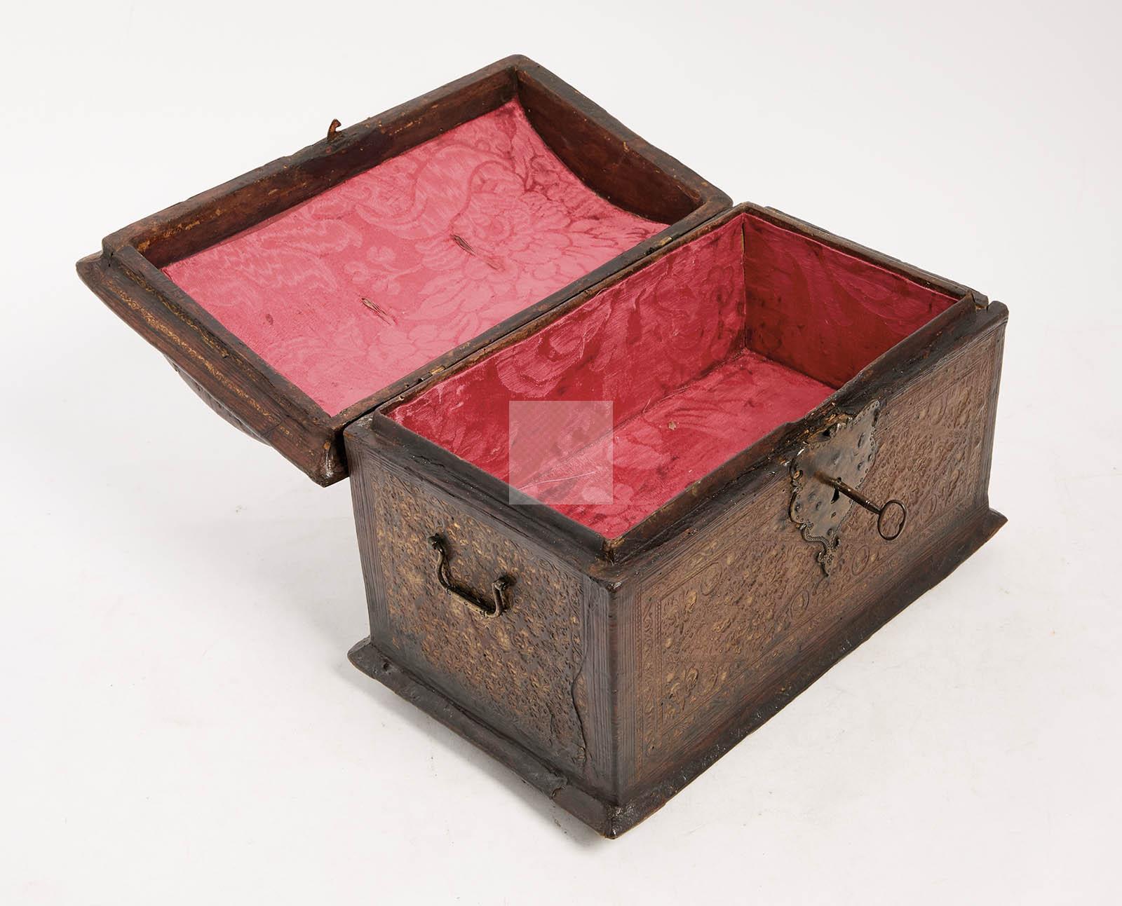 Lot n°161 - 161 Beau coffre gainé de maroquin estampé à réhauts dorés à décor de tête de per