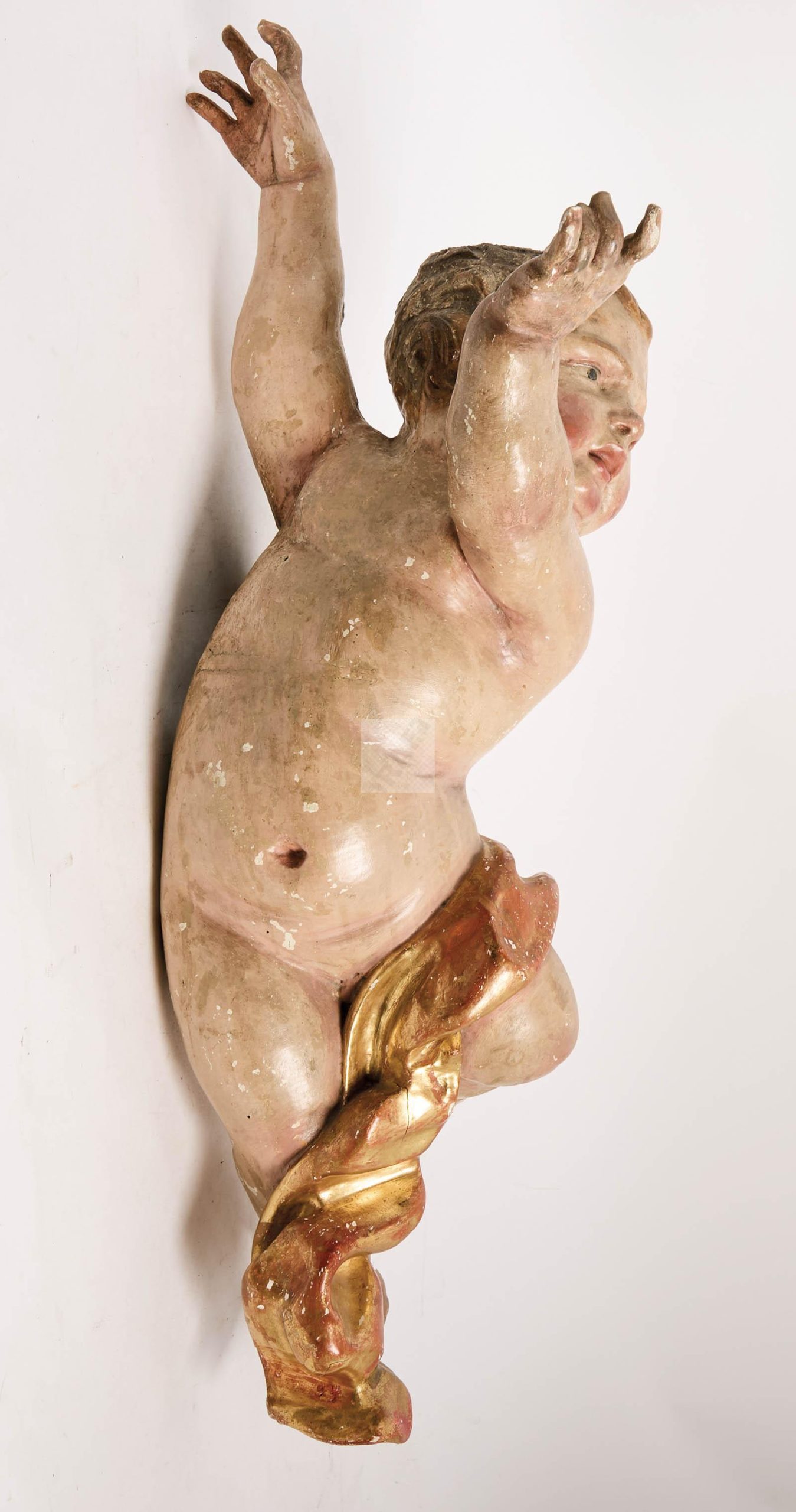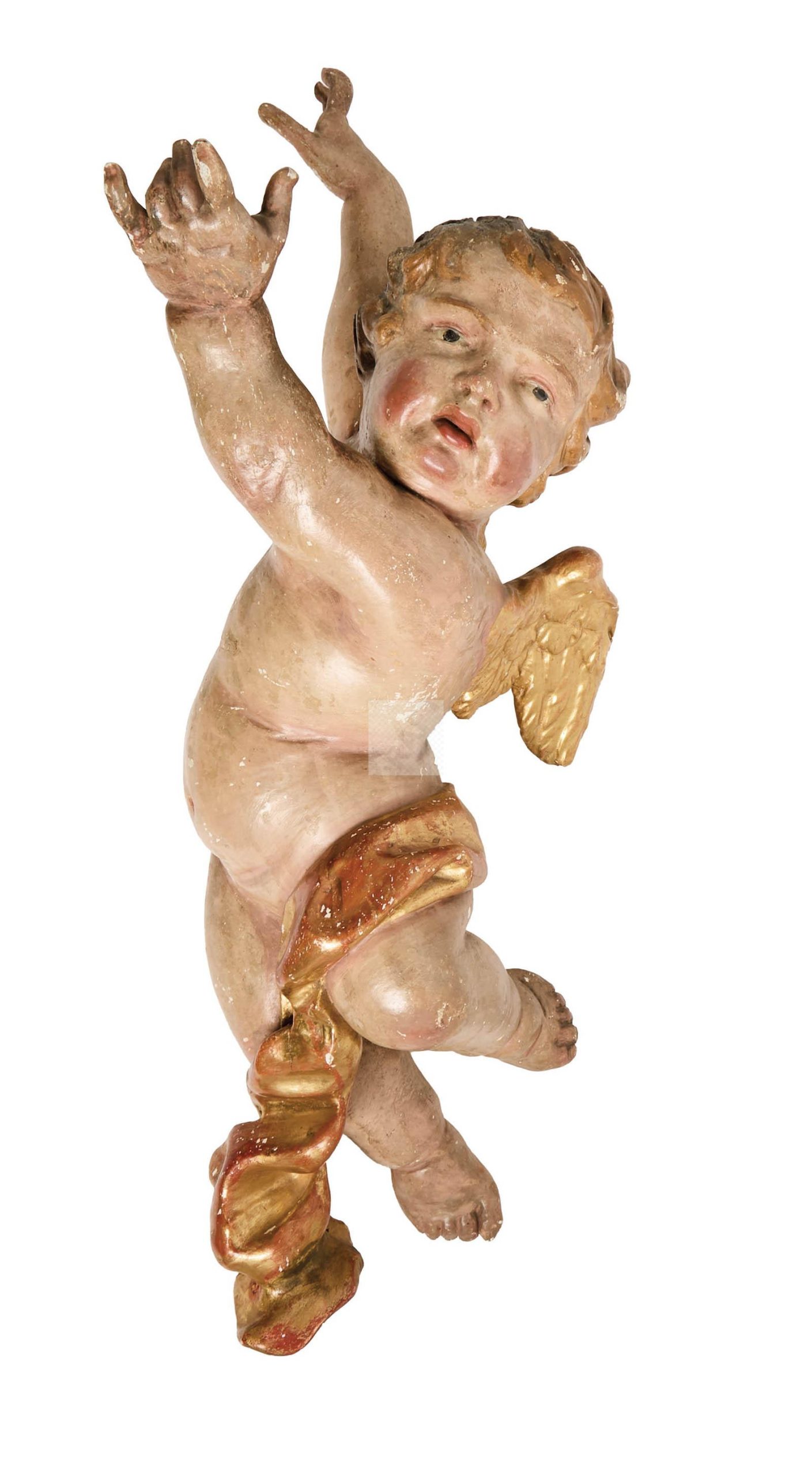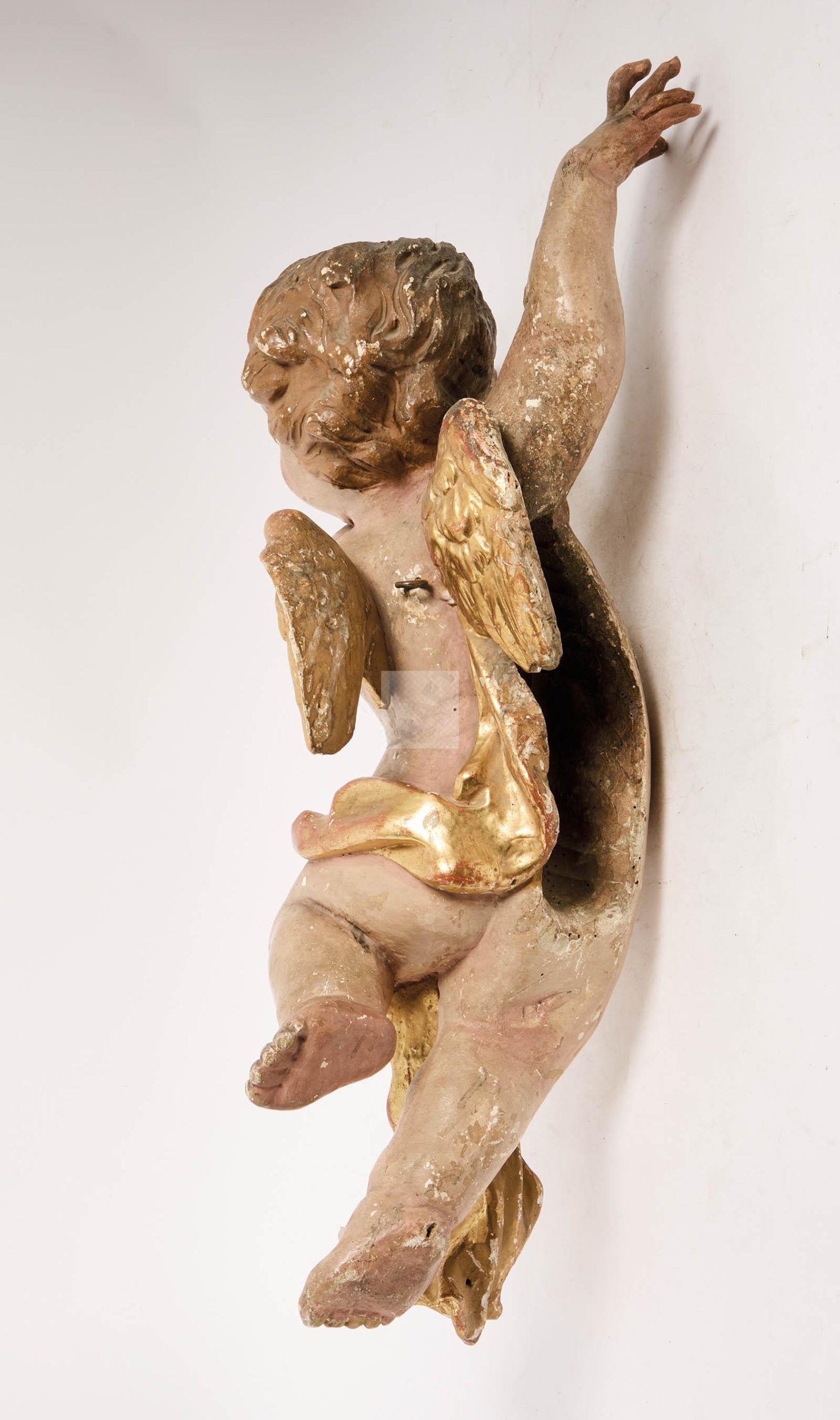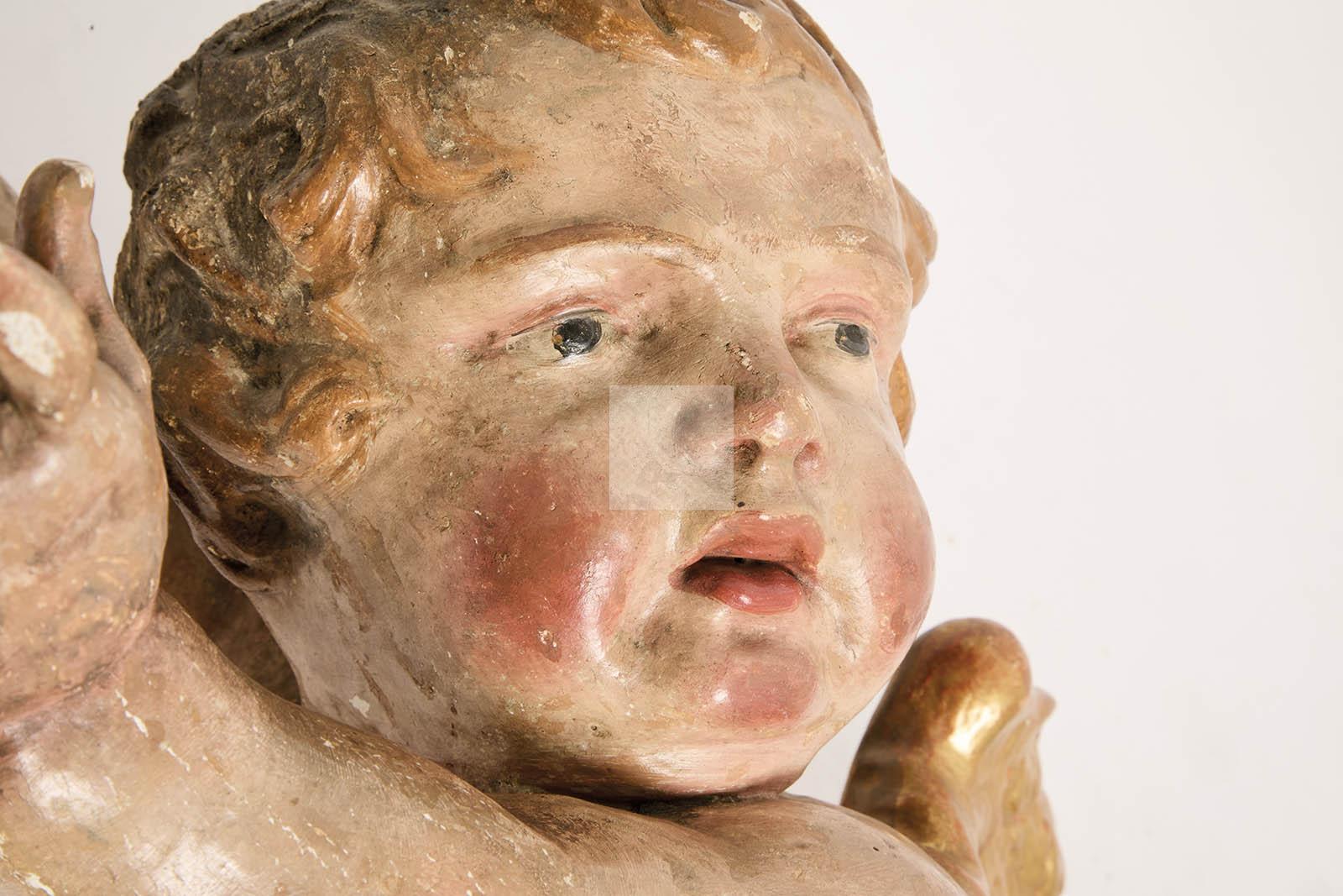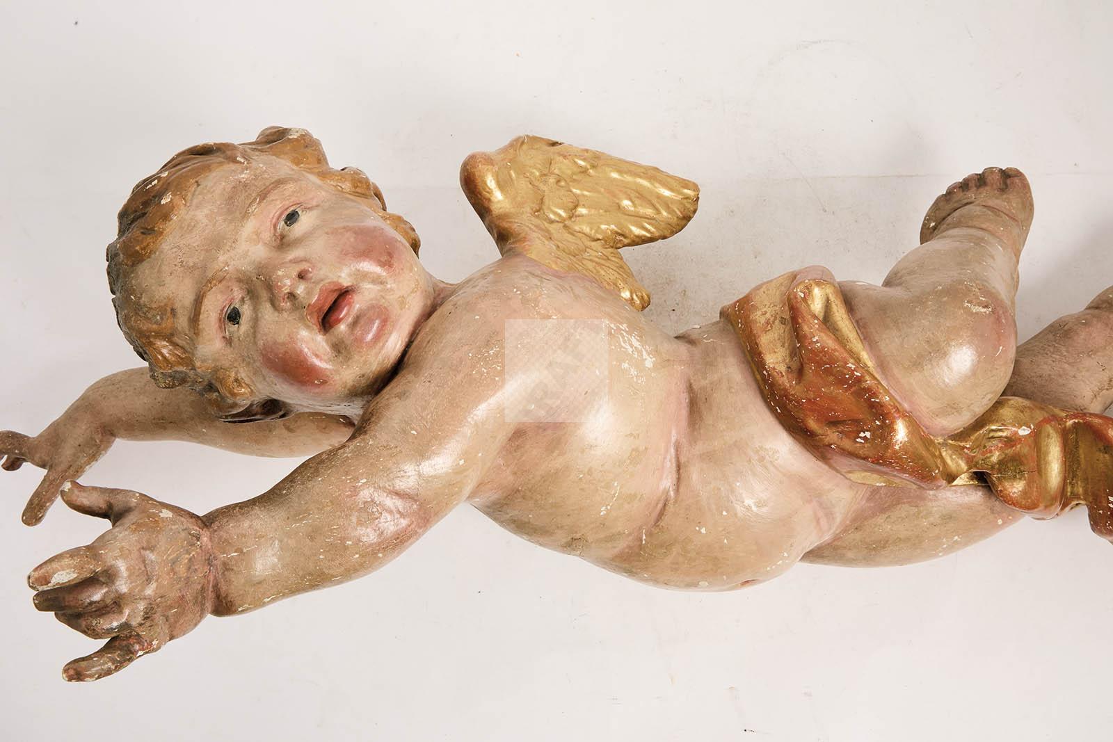 Lot n°177 - 177 Ange en bois sculpté polychrome à réhauts dorés