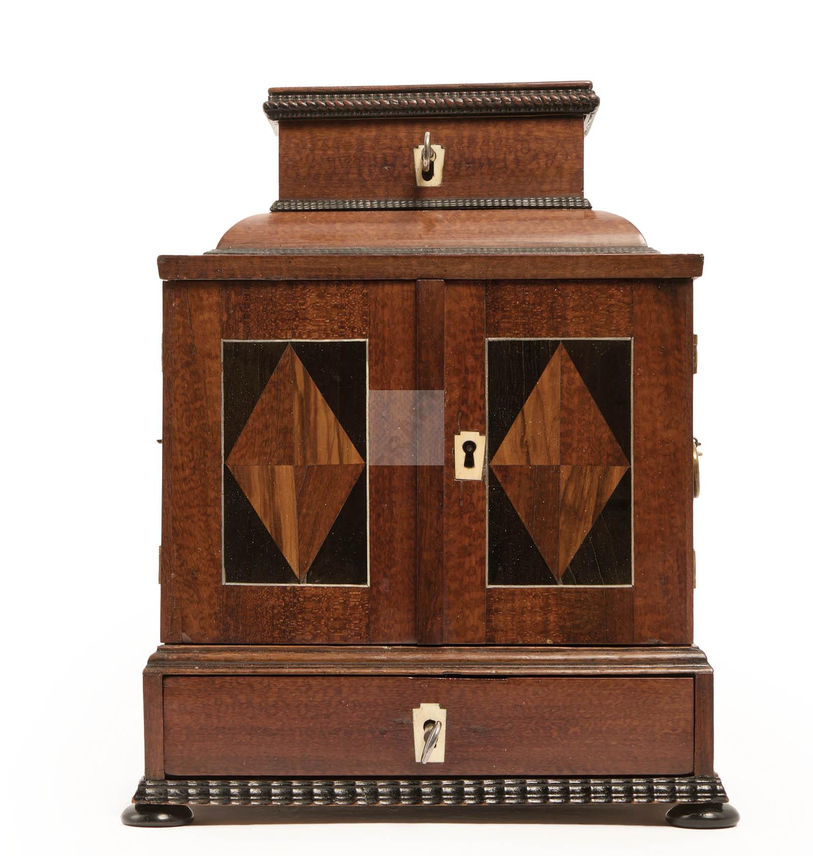 178 Petit cabinet de maitrise en placage d’Amourette, ébène, bois noirci et os à décor marqueté de motifs géométriques. Il ouvre à un vantail, deux vantaux latéraux qui dissimulent huit tiroirs, un tiroir en ceinture, petits pieds toupie.
