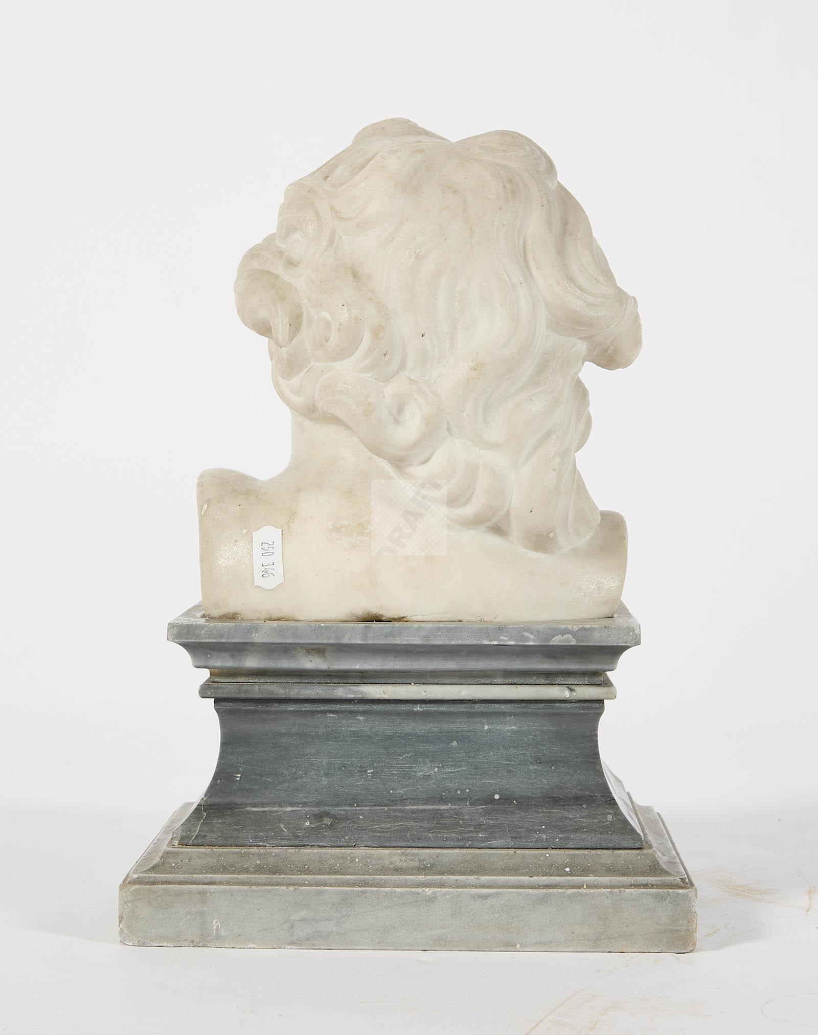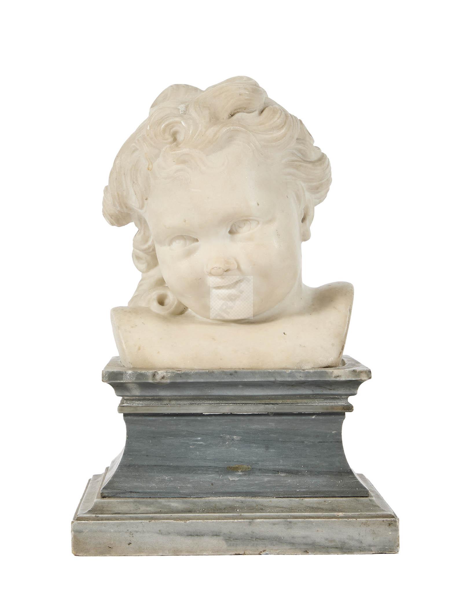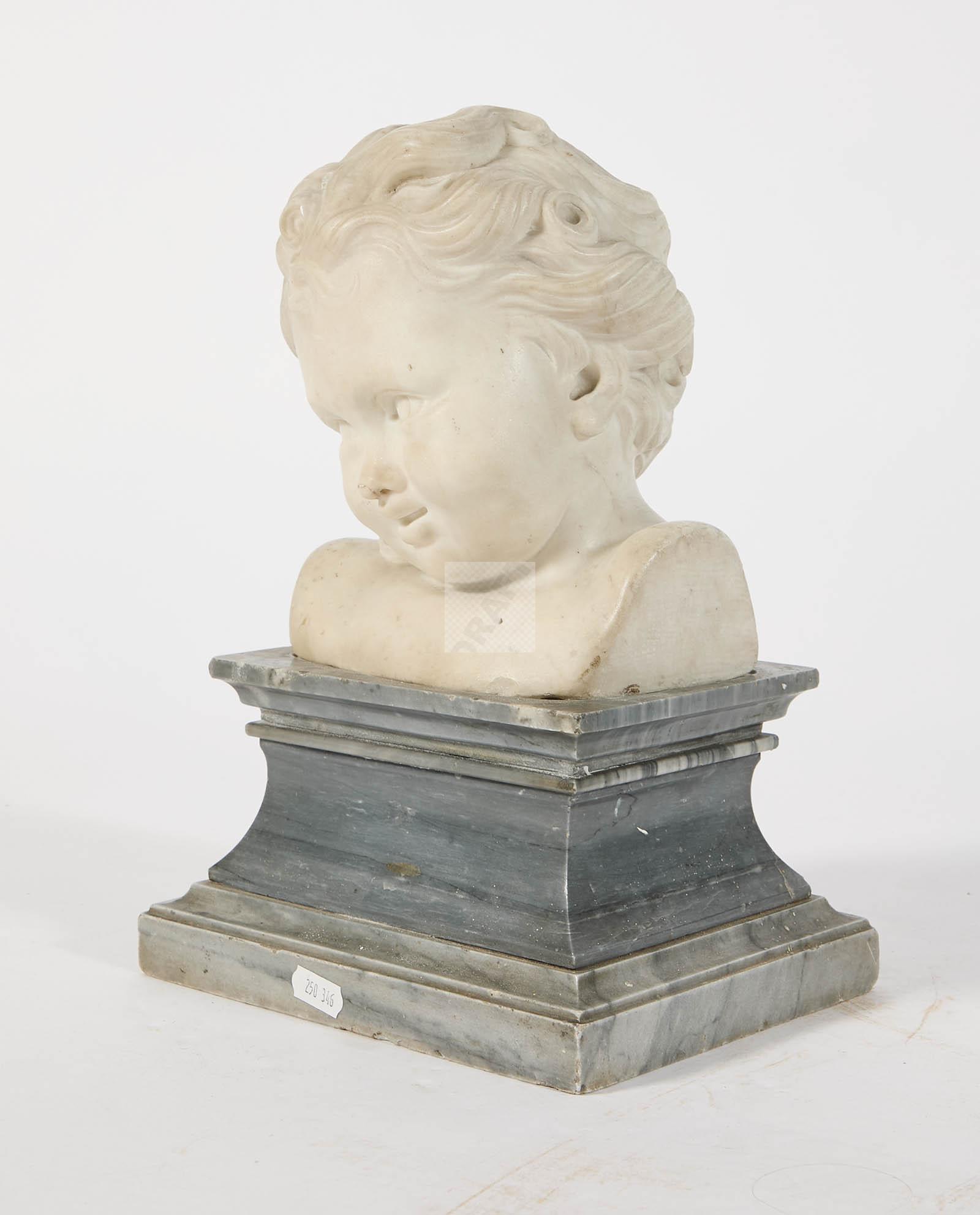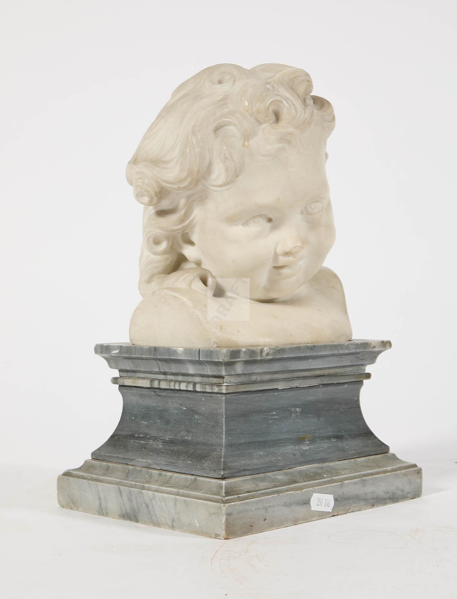 Tête d’enfant souriant en marbre de Carrare reposant sur une base en marbre bleu turquin.