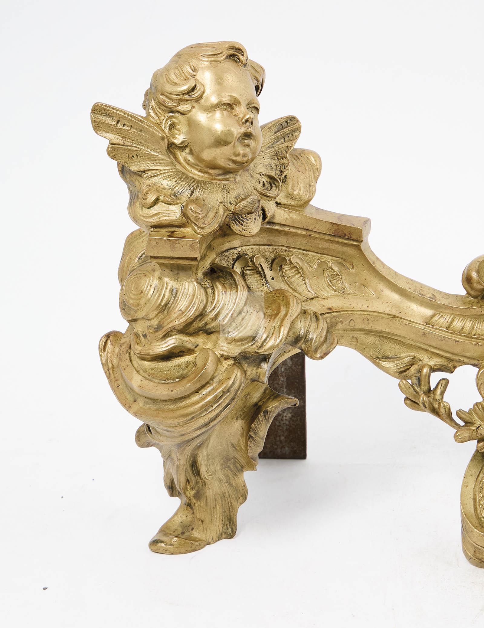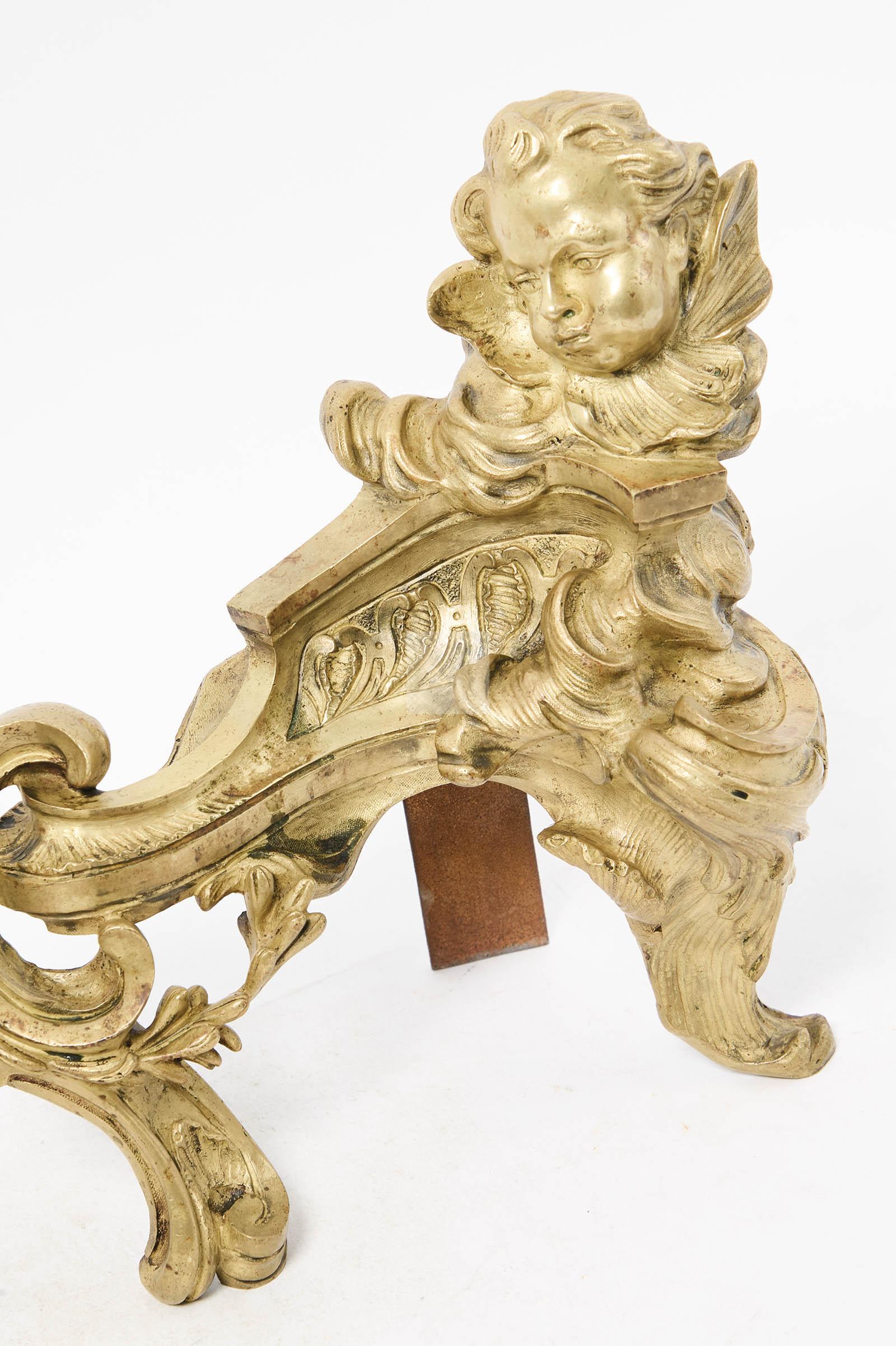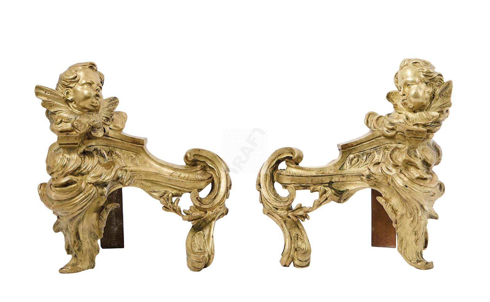 203 Paire de chenets en bronze ciselé à décor en ronde-bosse de têtes de zéphyrs, nuées et rocailles.