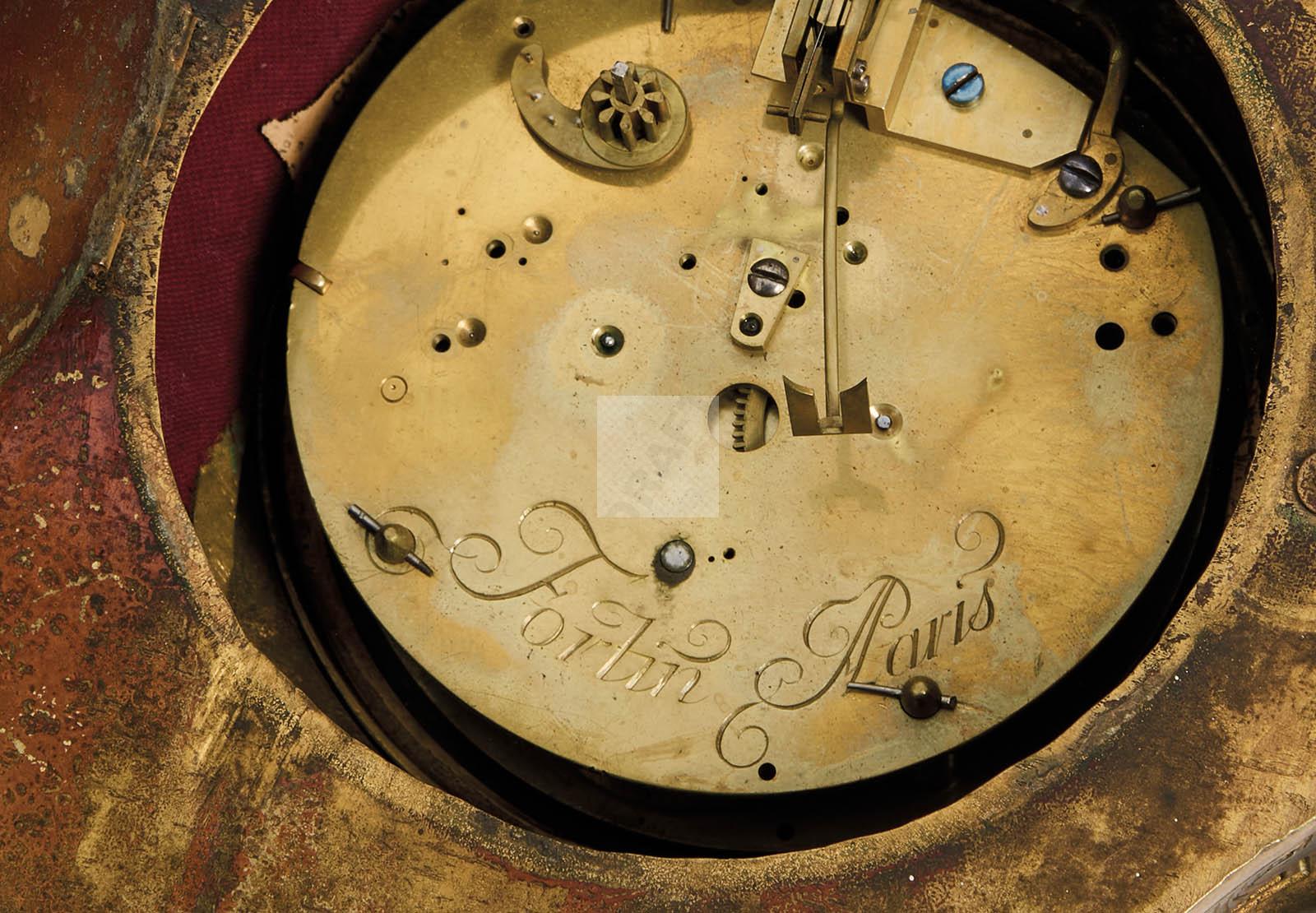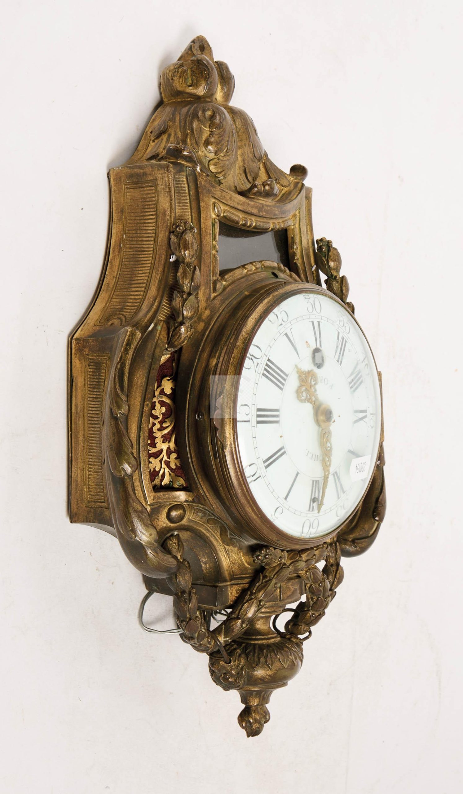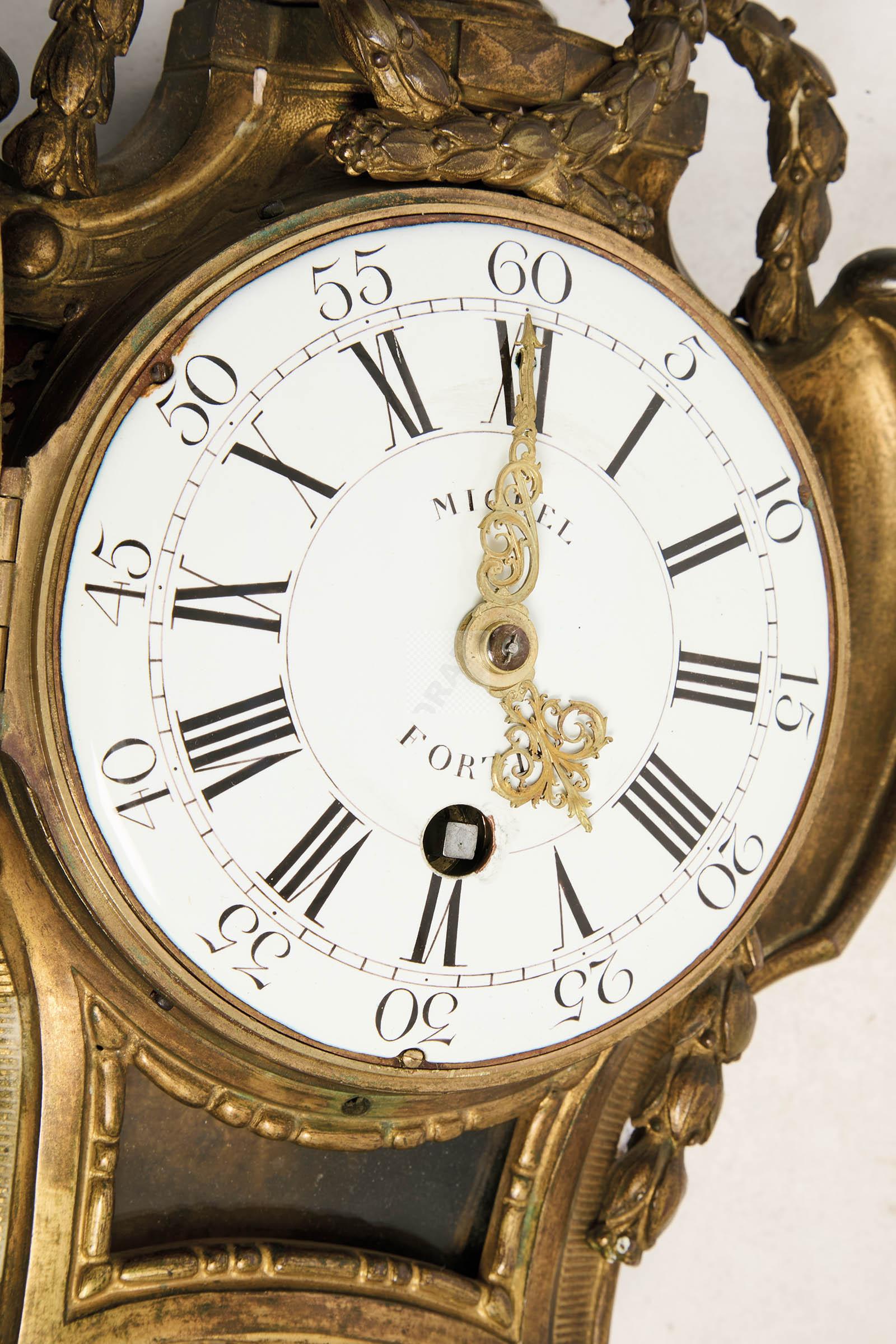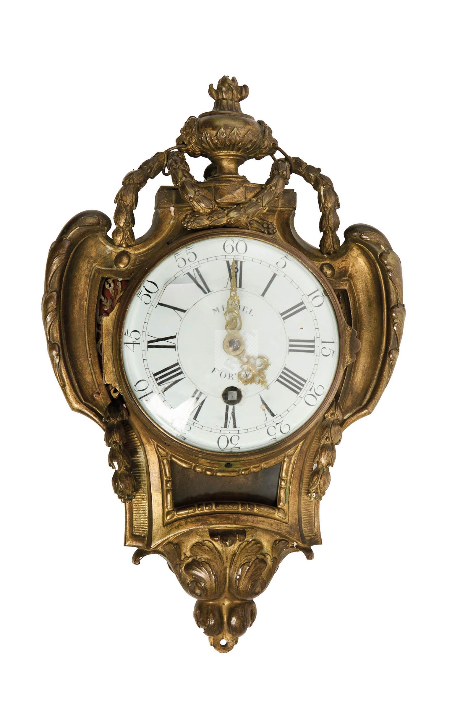 205 Cartel en bronze ciselé et doré à décor de frises feuillagées, pot à fleur à mufles de lion à l’amortissement, cadran et mouvement signés Michel FORTIN à Paris.
