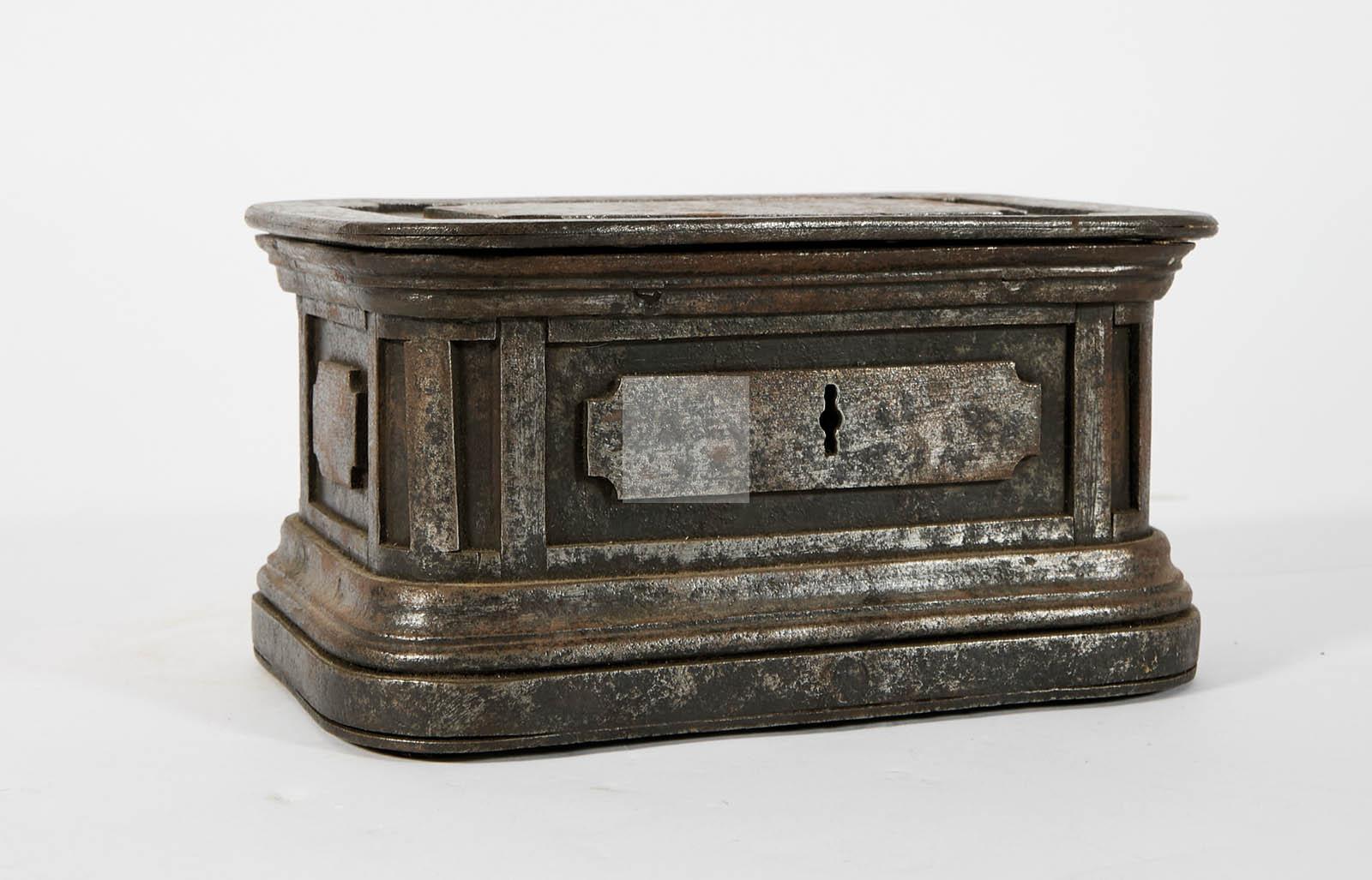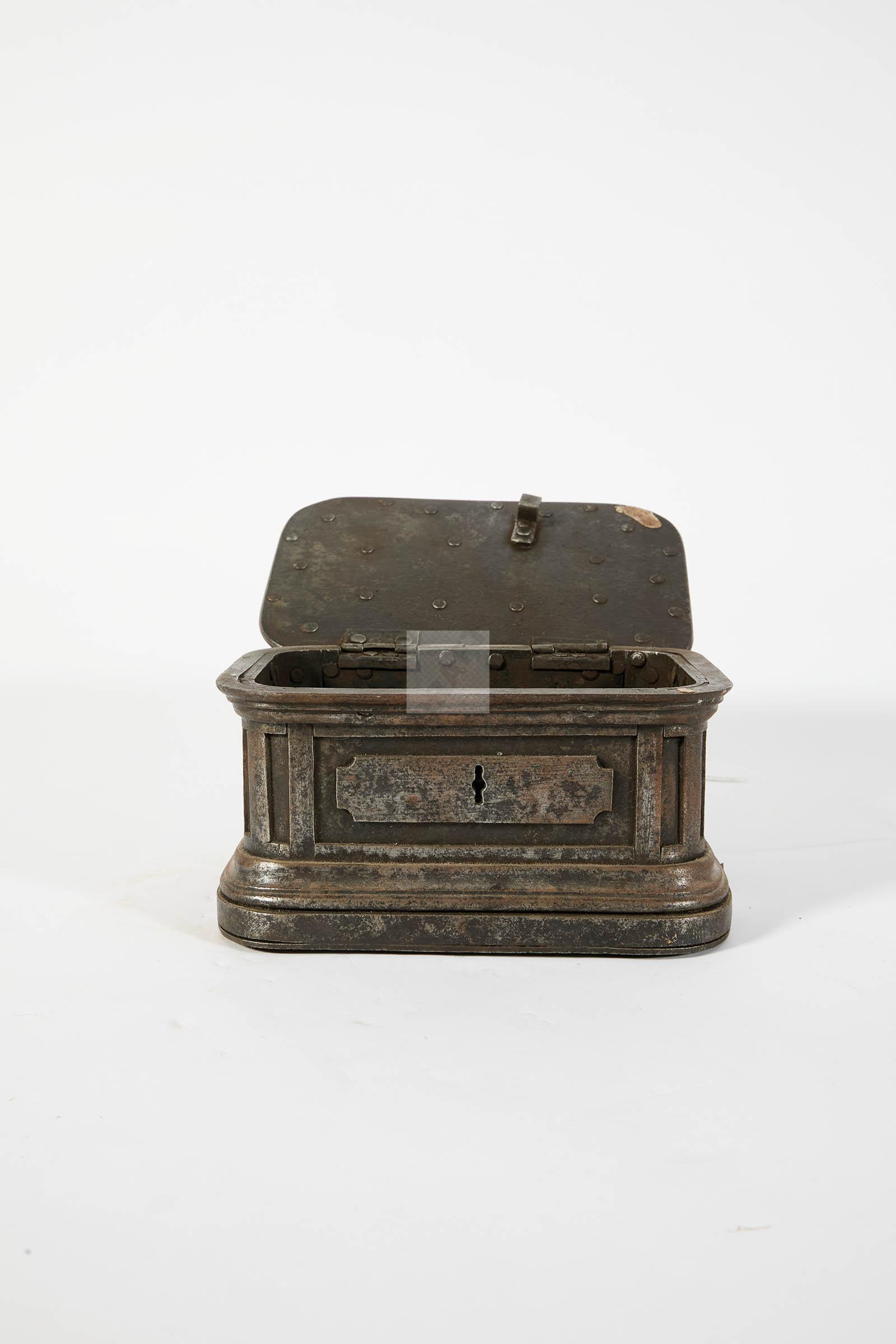 220 Coffret en acier avec serrure à complications. Epoque : fin du 18ème ?. Dim : 10.5 x 21 x14.5 cm.
