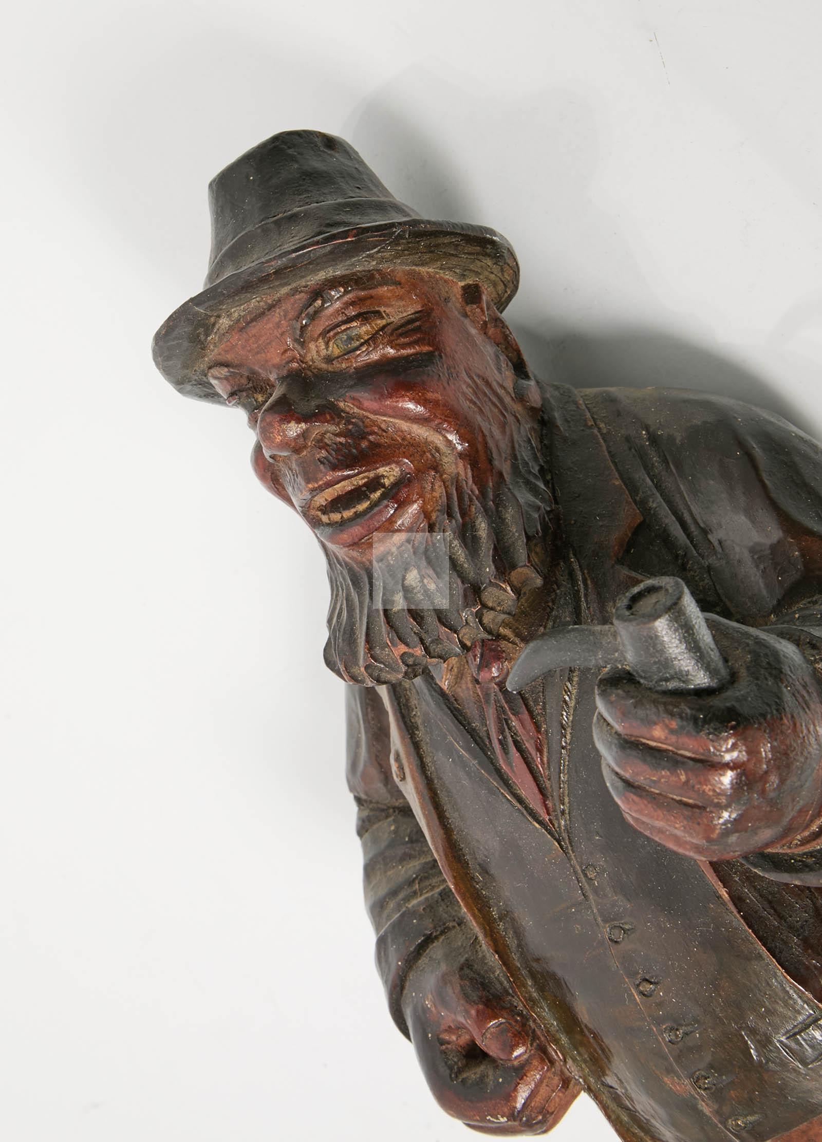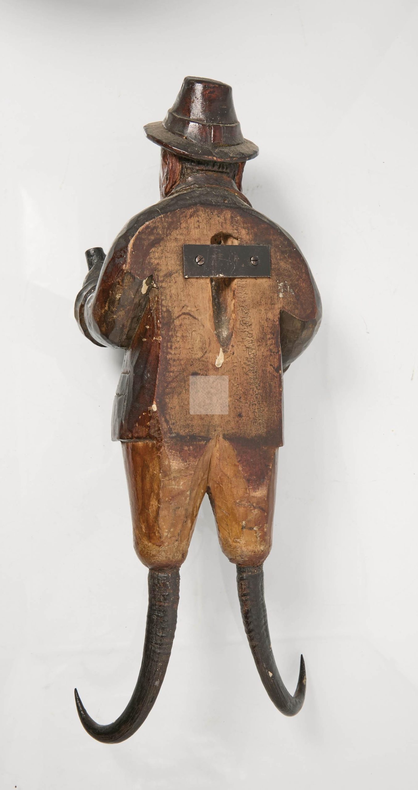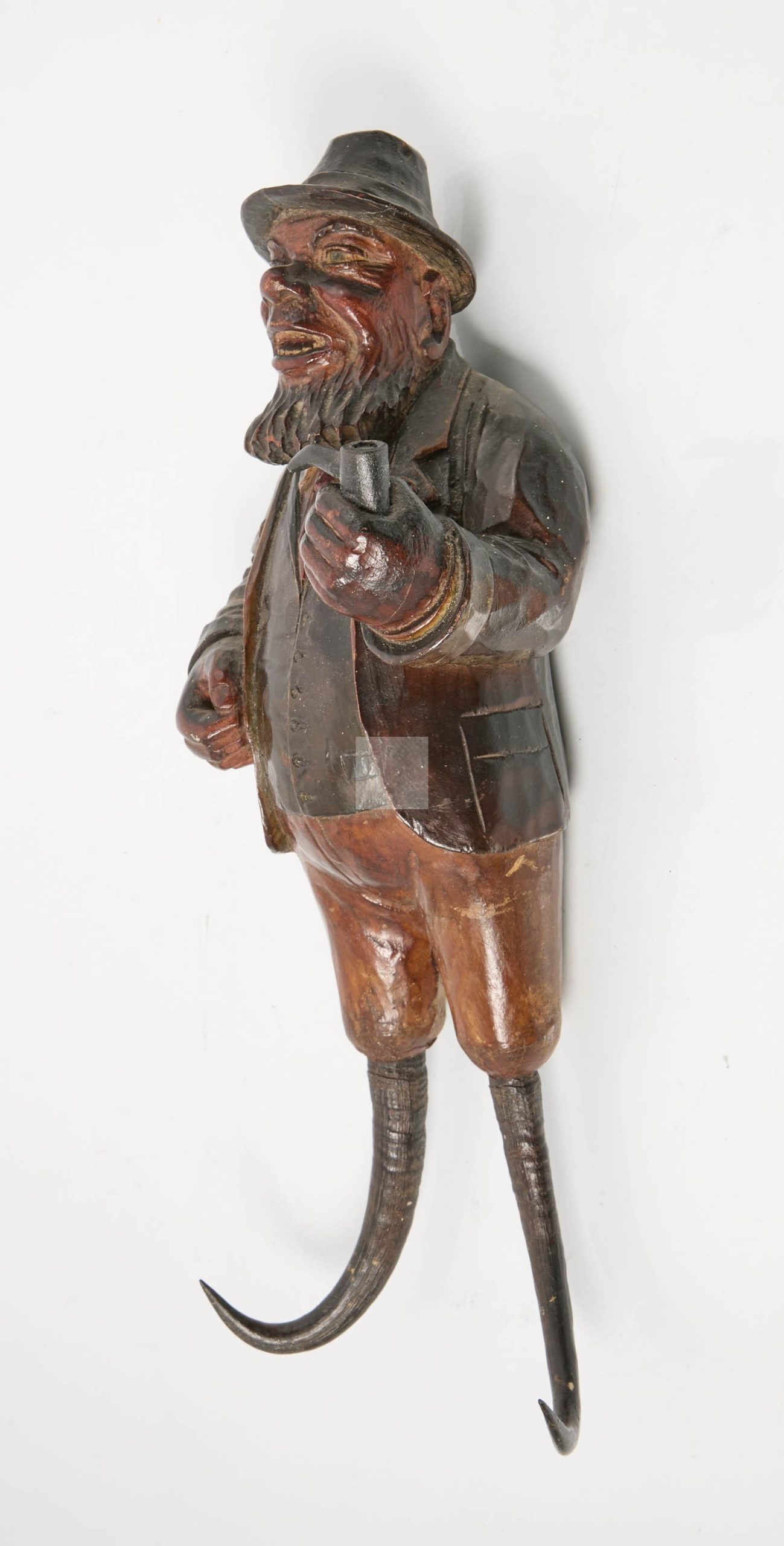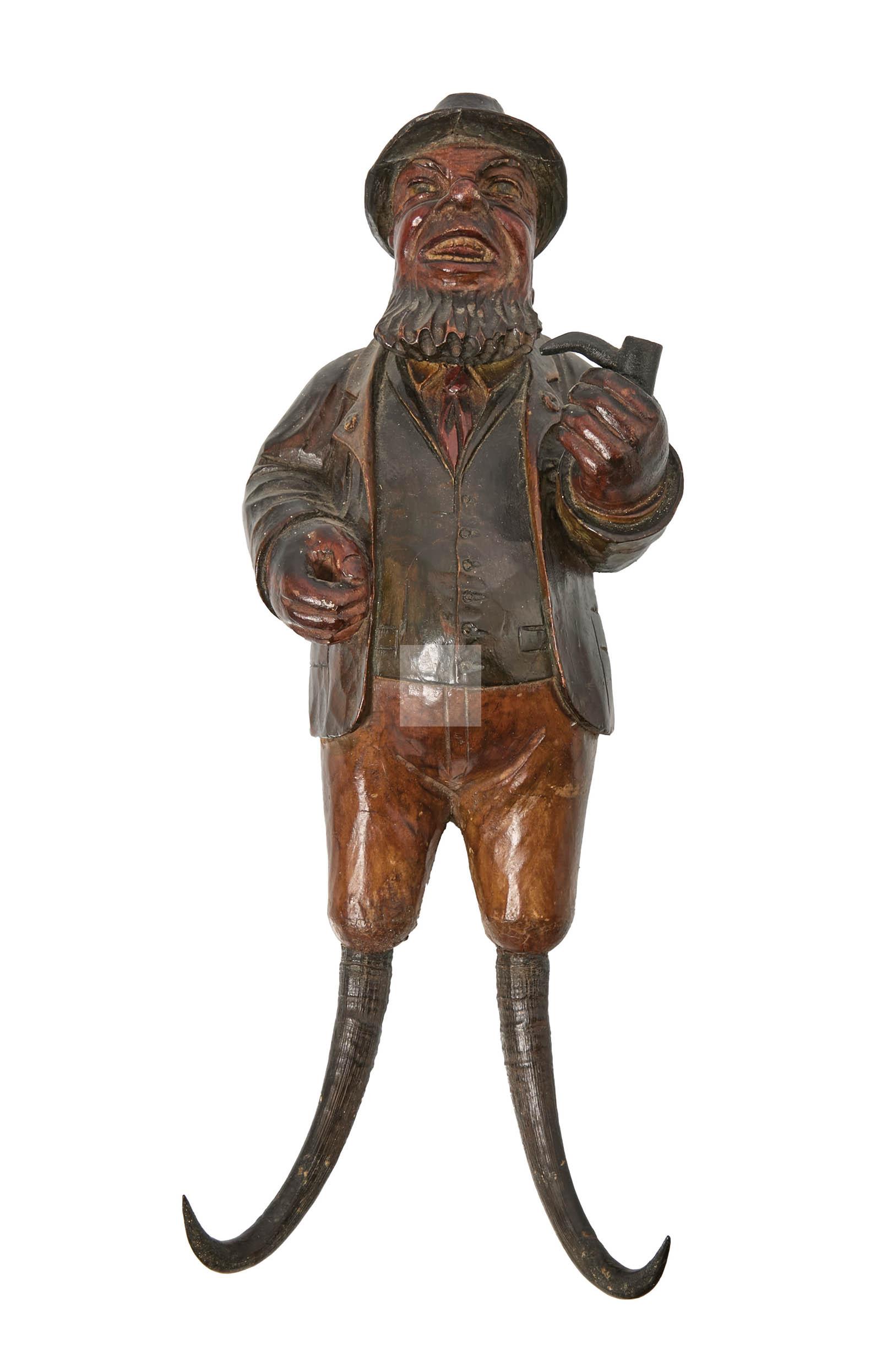Lot n°233 - 233 Porte chapeau en bois sculpté polychrome et cornes à décor de fumeur de pipe