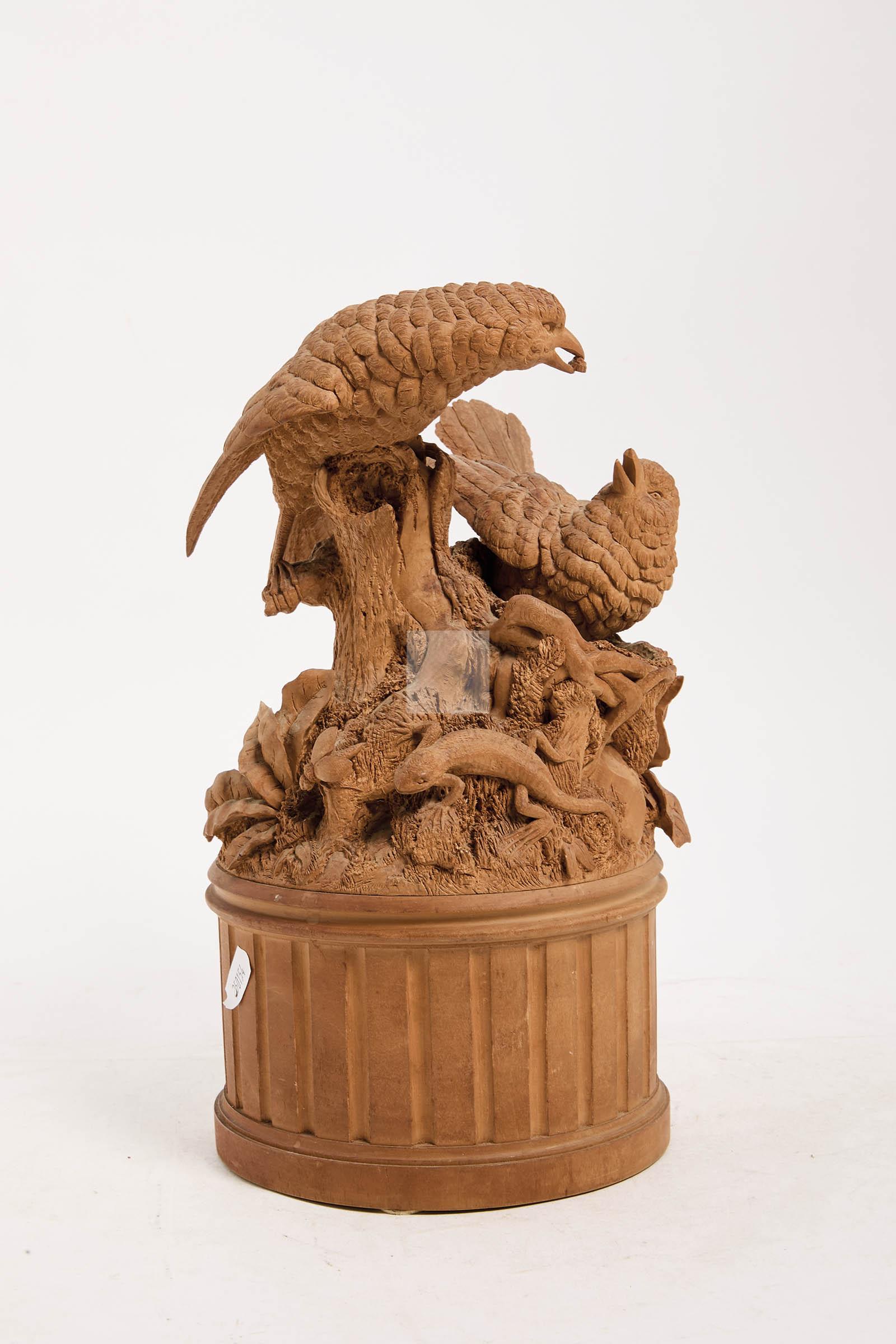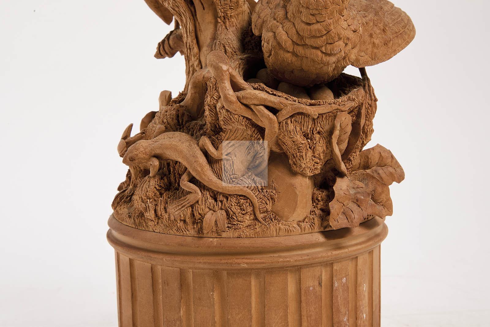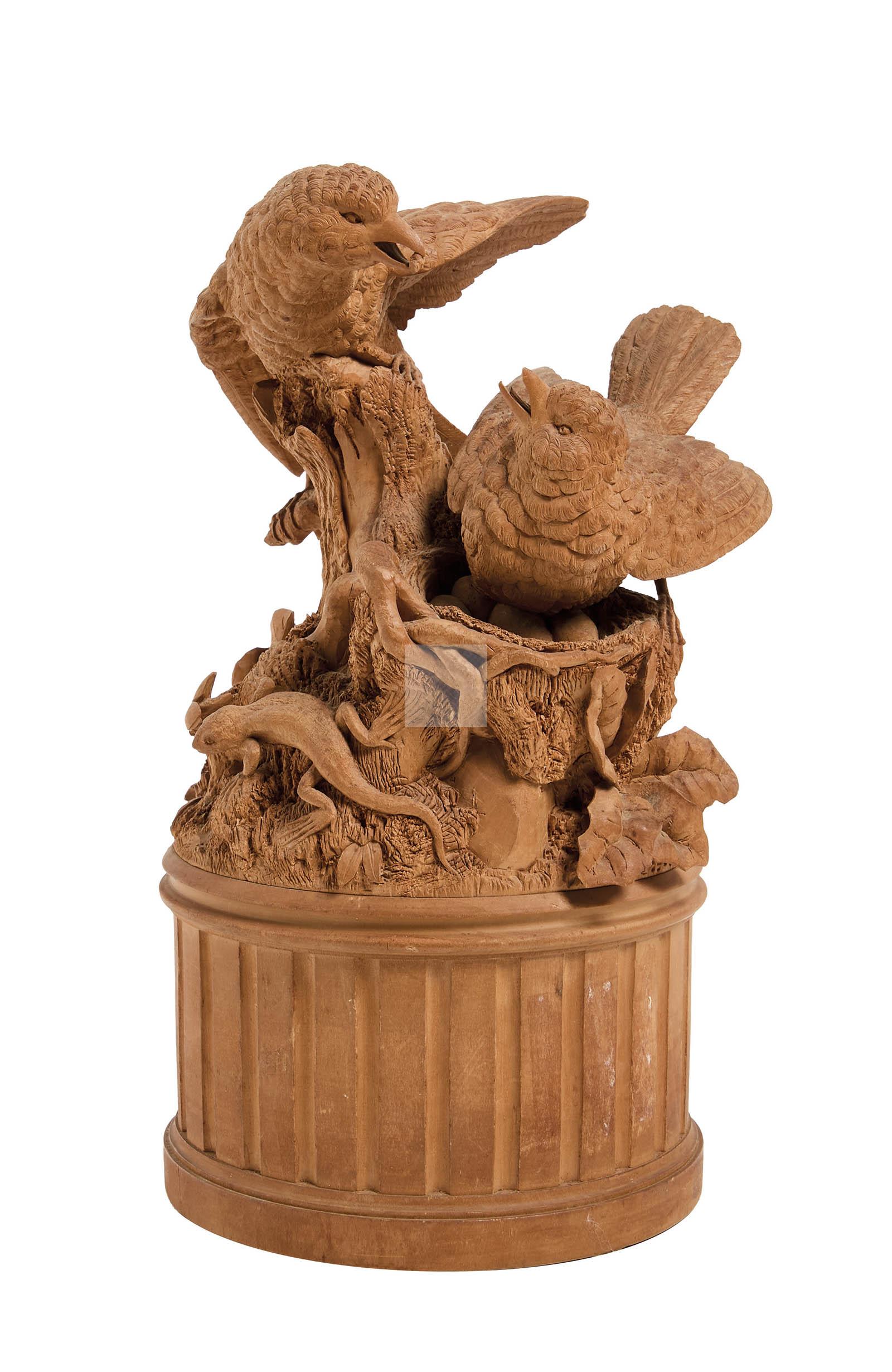 Composition en bois finement sculpté à décor d’oiseaux, nid, escargot, lézard et motif feuillagé reposant sur une demi-colonne tronquée