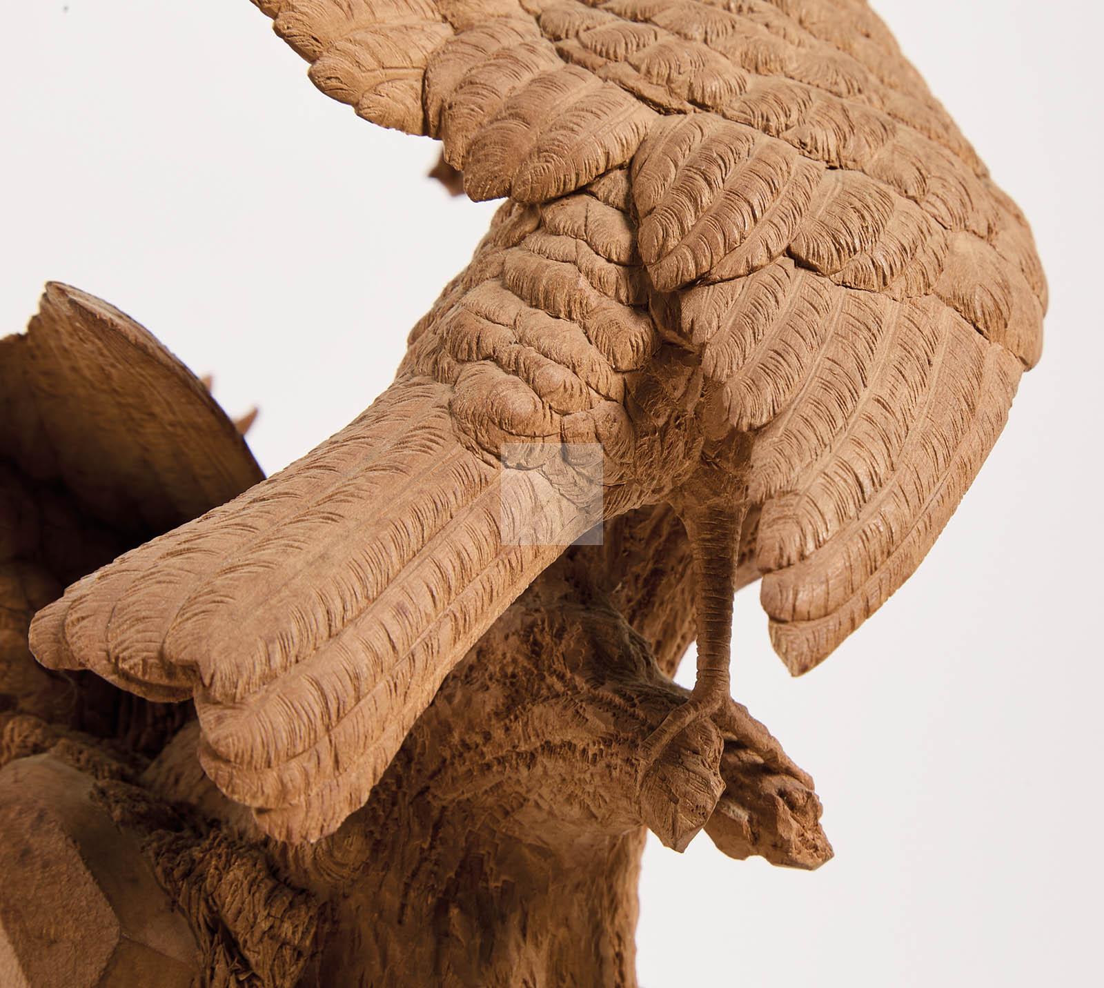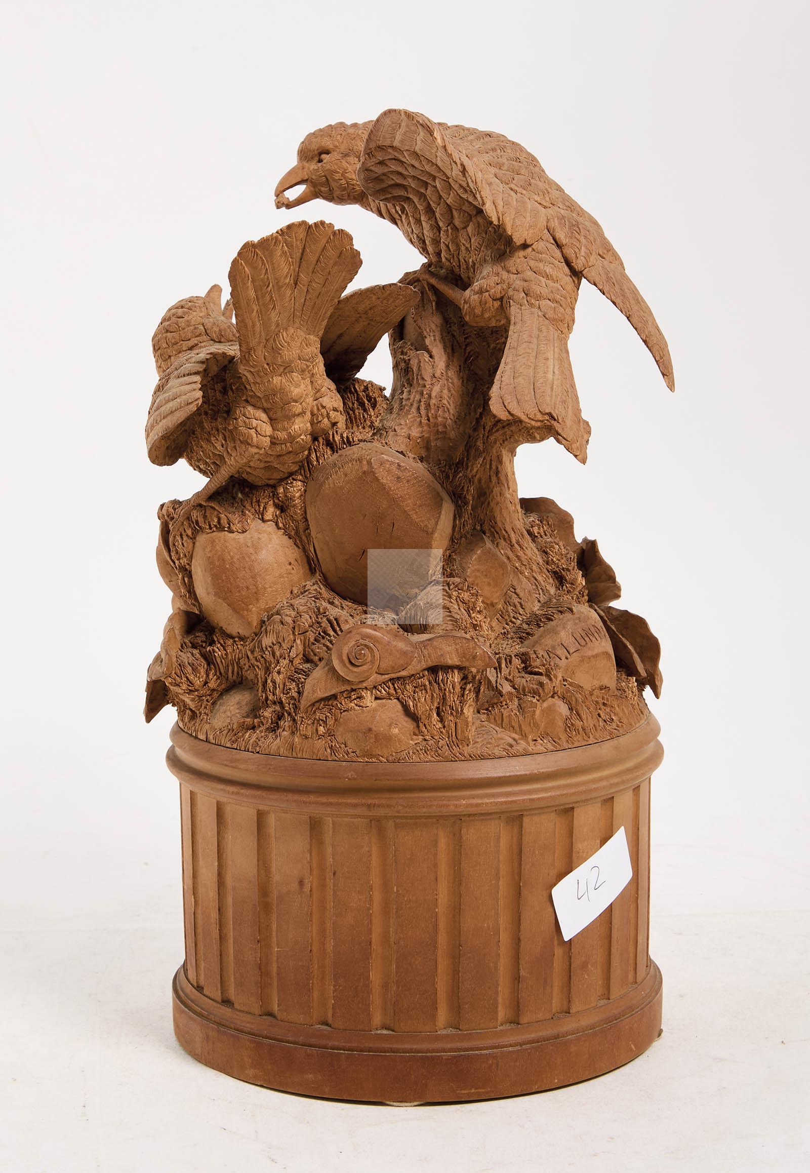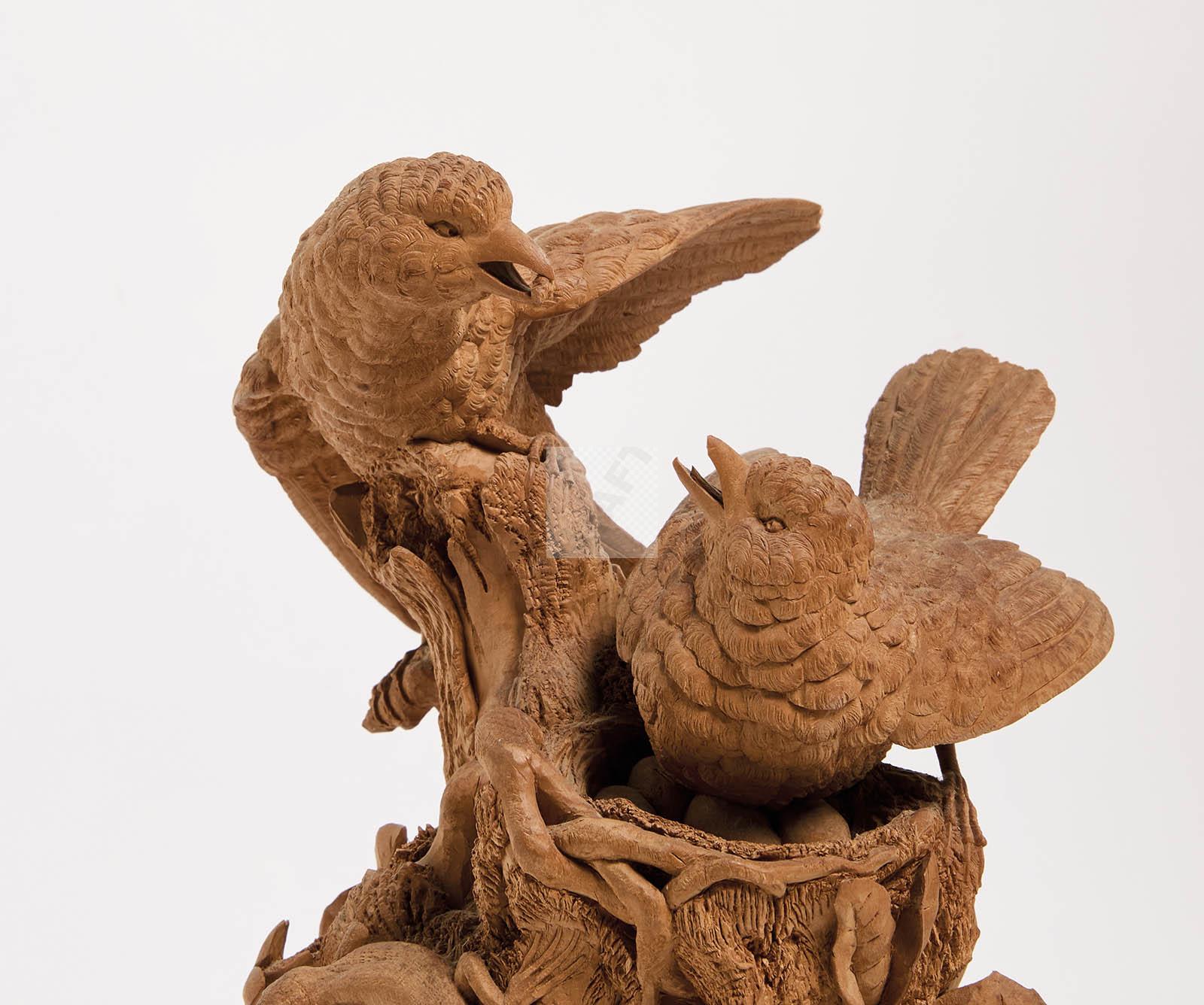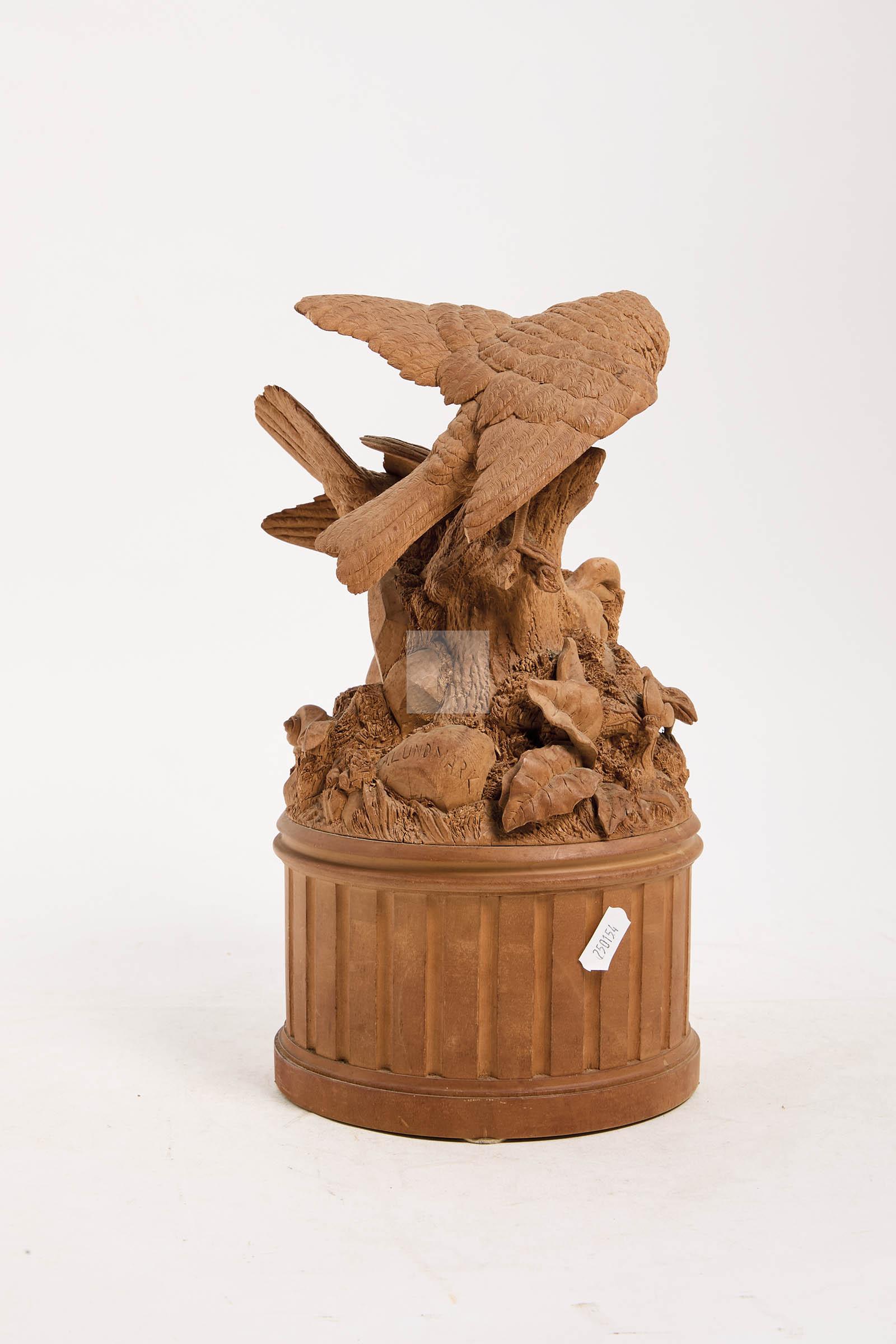 Composition en bois finement sculpté à décor d’oiseaux, nid, escargot, lézard et motif feuillagé reposant sur une demi-colonne tronquée