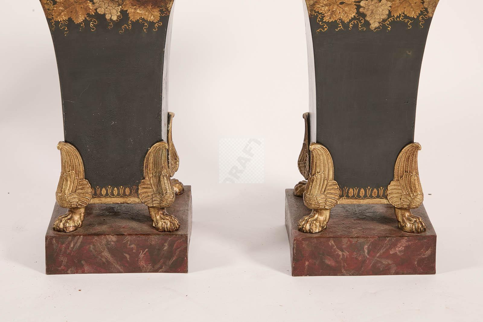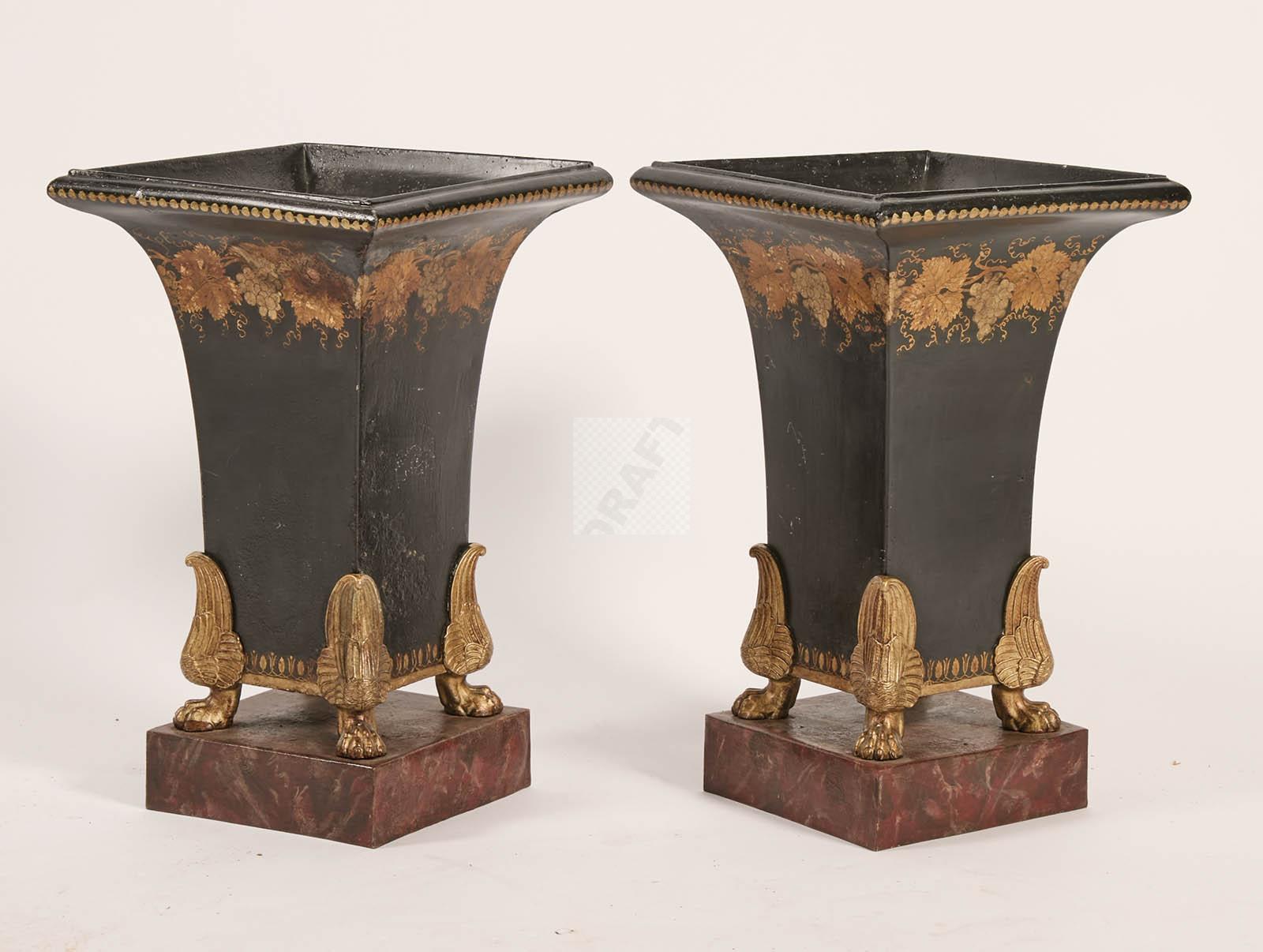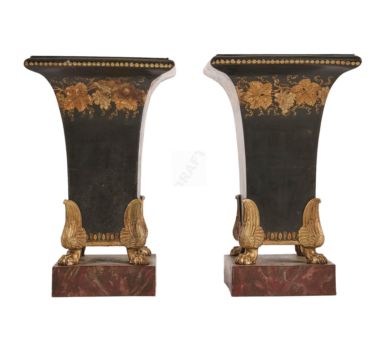 246 Paire de rafraichissoires cornet en tôle laqué polychrome, pieds griffe, base à décor faux marbre