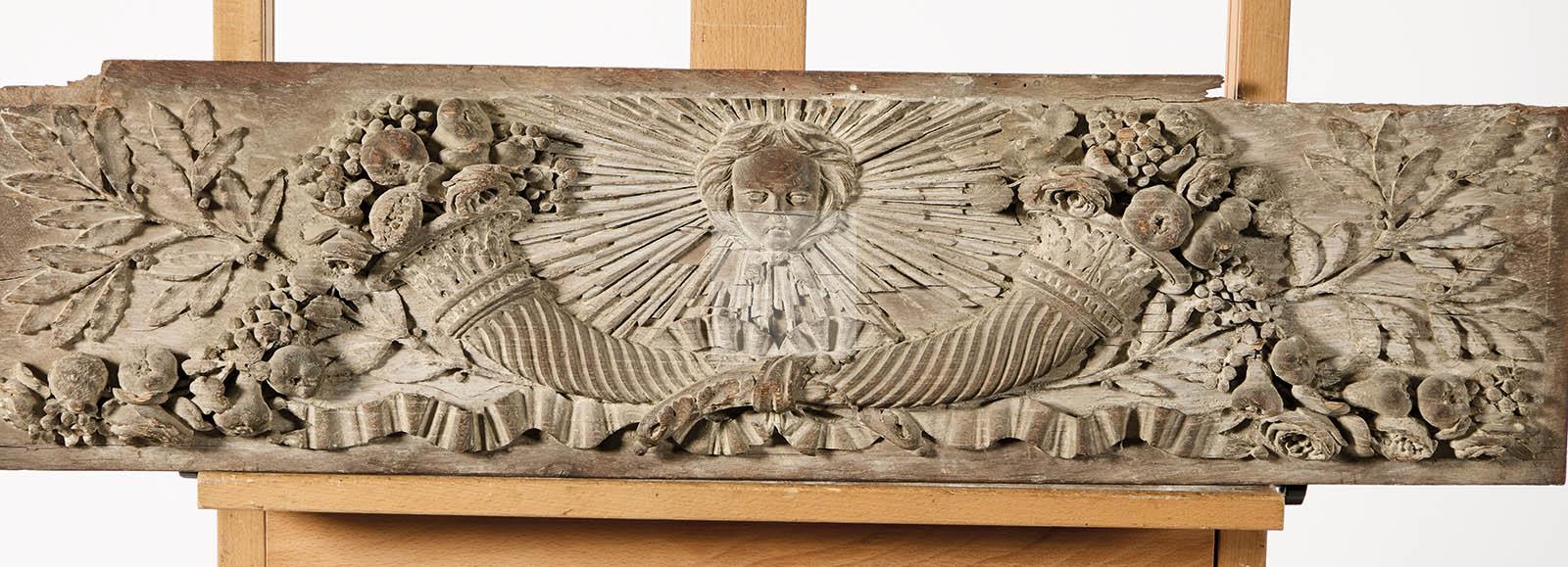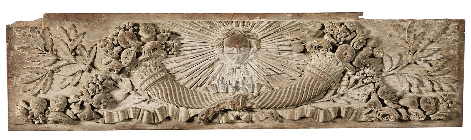 Bas-relief en bois de chêne très finement sculpté d’une corne d’abondance centrée d’un visage d’enfant rayonnant, feuilles de chêne, guirlandes de fruits et noeuds de rubans.