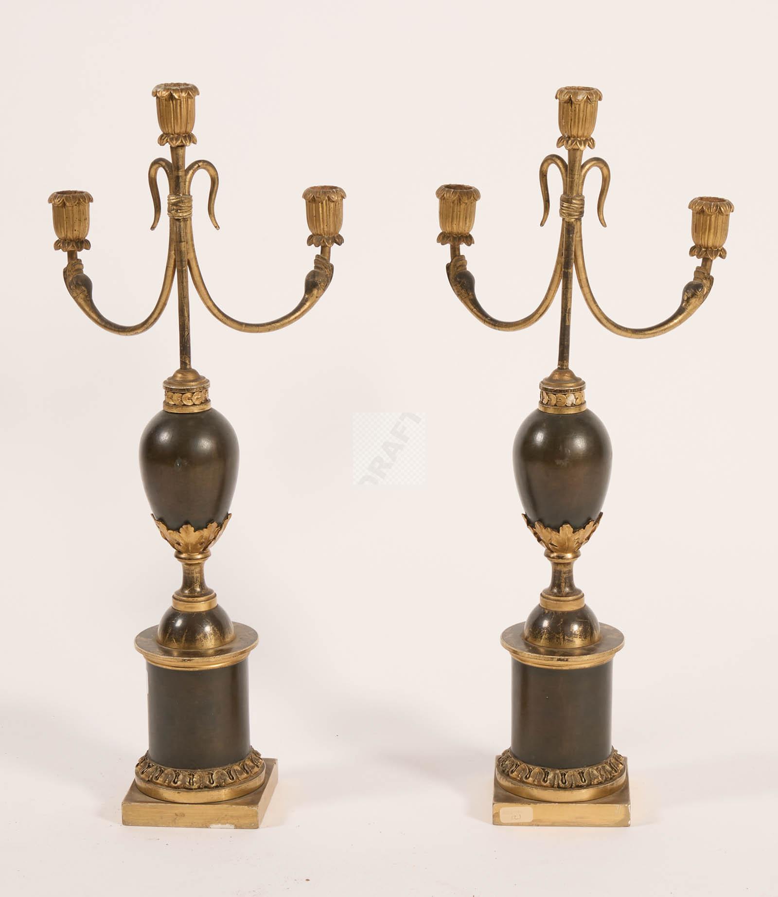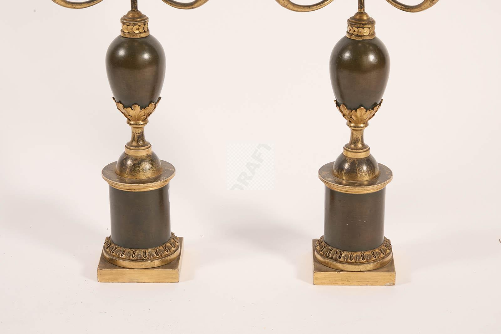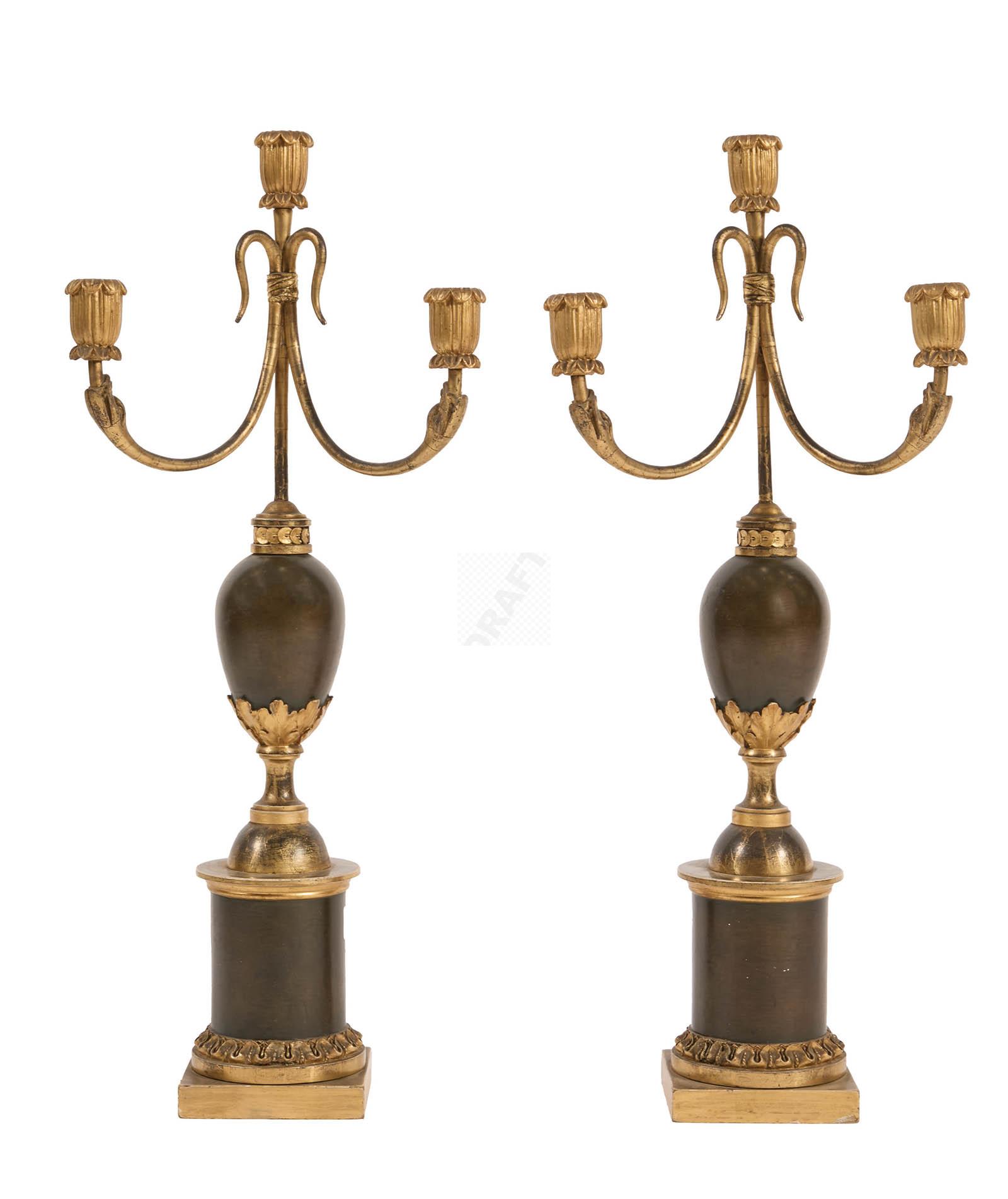 254 Paire de candélabres à trois bras de lumières en bois et métal patiné, sculpté et doré à décor de vase fuselé à motif feuillagé reposant sur des colonnes tronquées