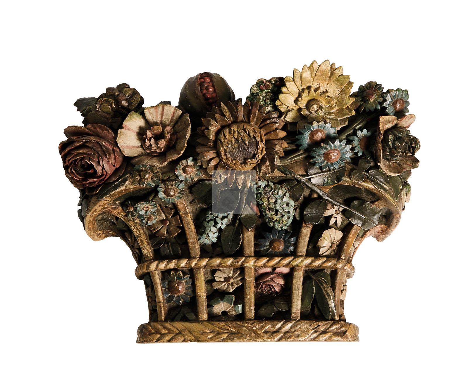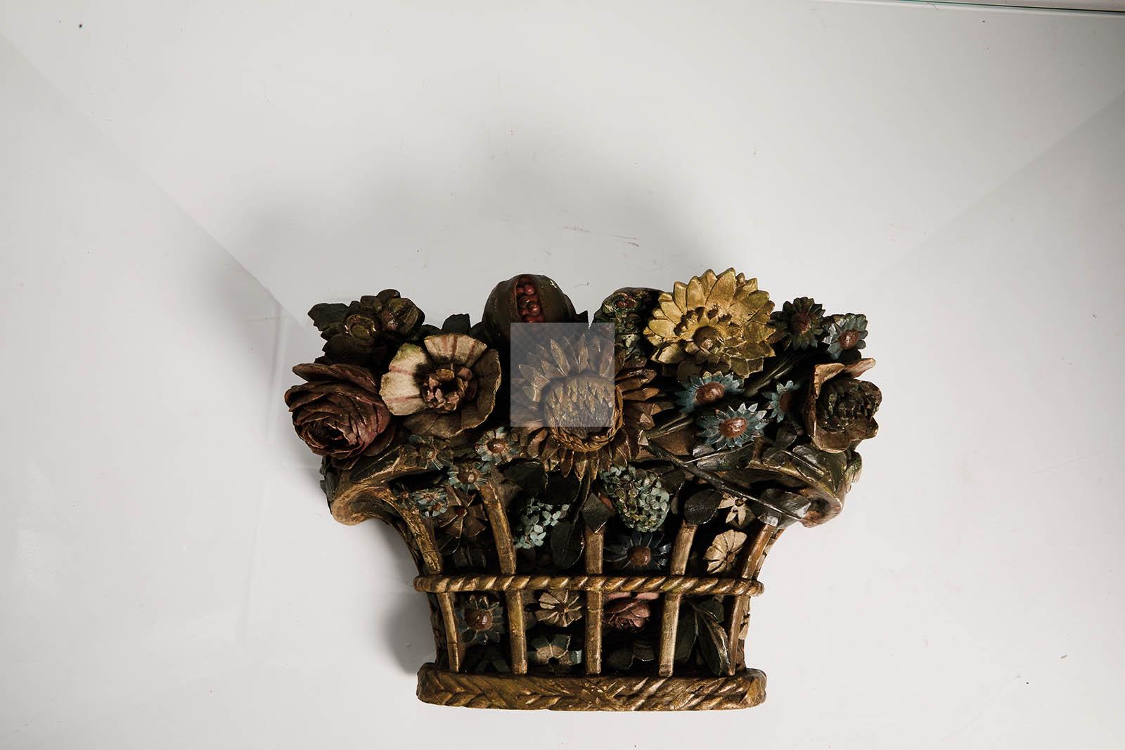 Lot n°258 - 258 Corbeille fleurie en bois sculpté polychrome.