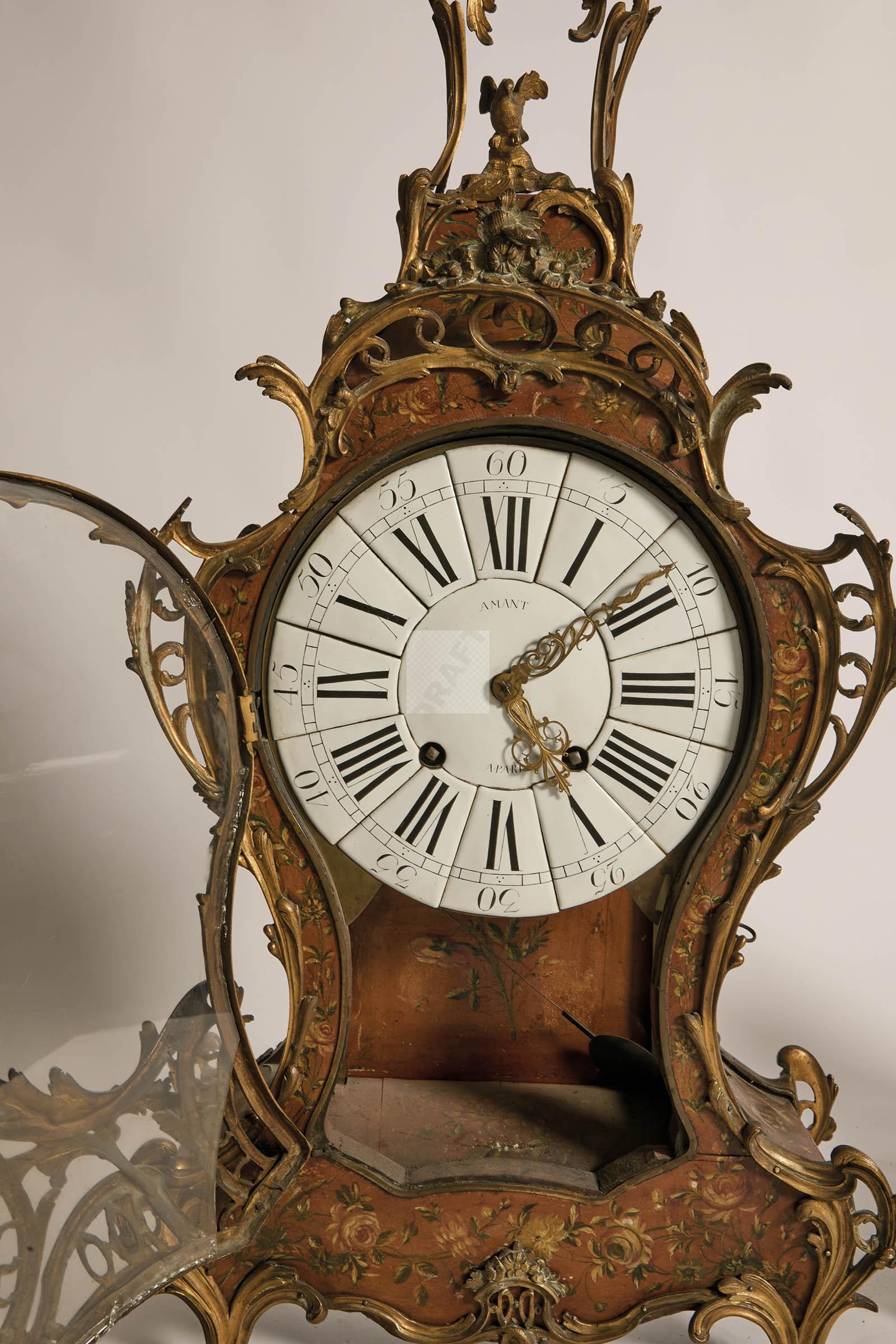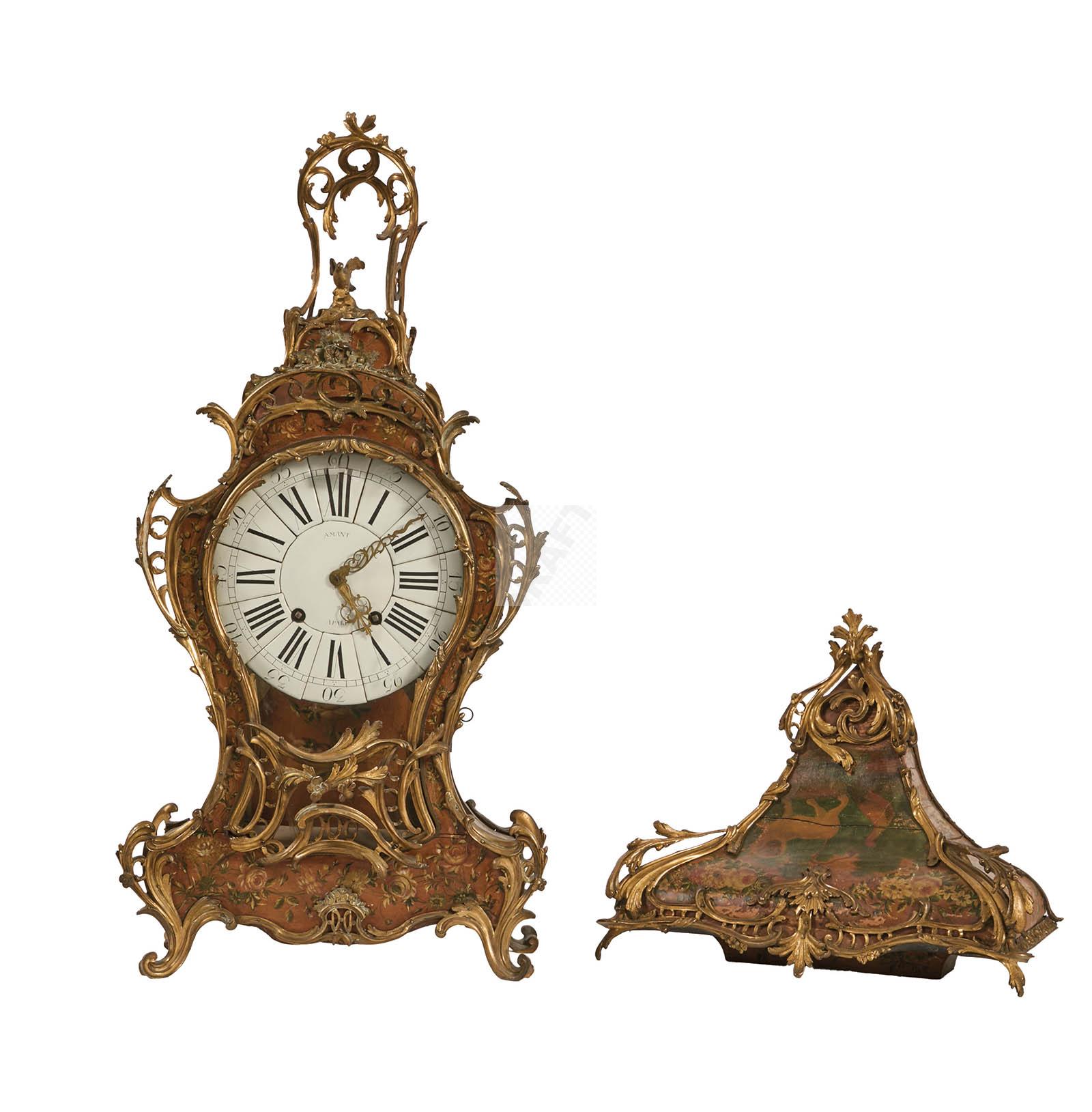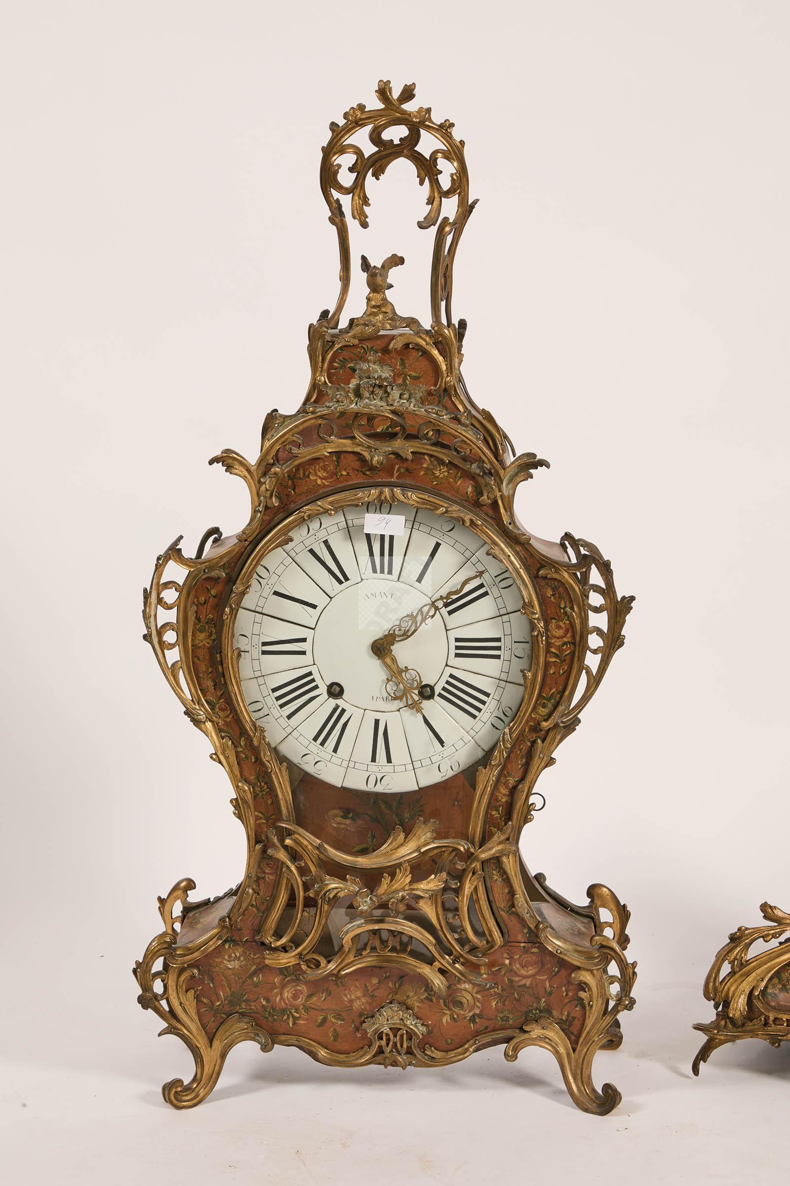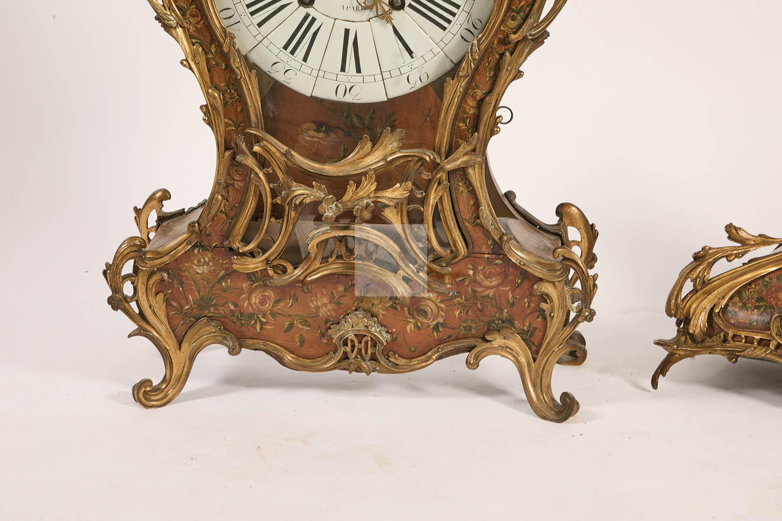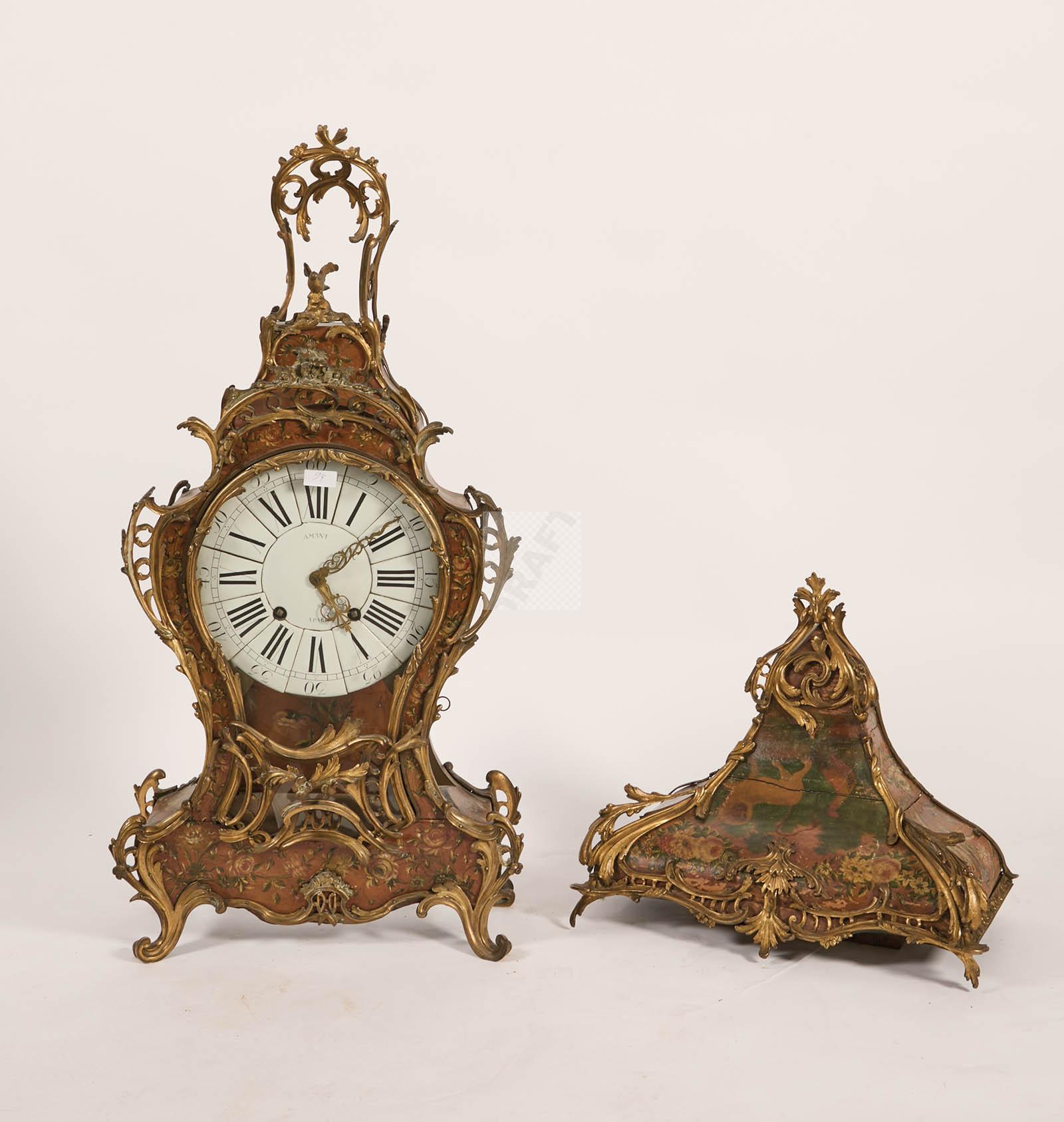 261 Cartel et son cul de lampe à décor polychrome de branchages fleuris, cadranémaillé et mouvement signés AMANT à Paris, ornementation de bronzes ciselés et dorés