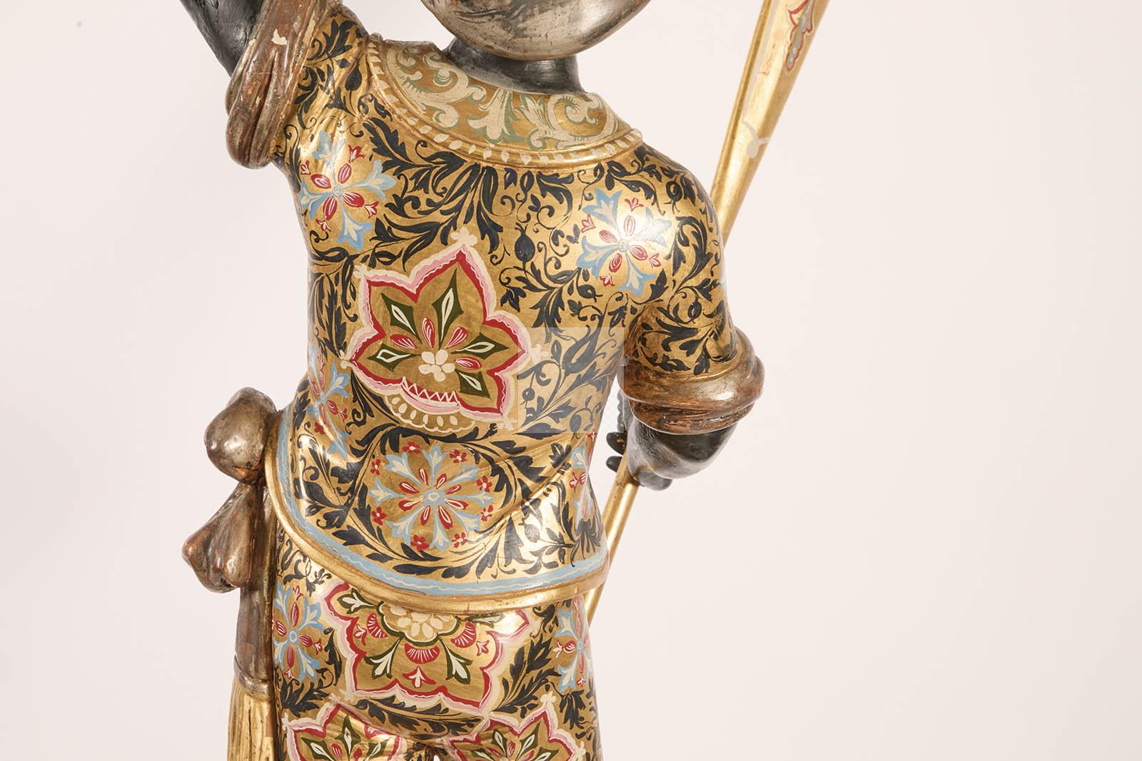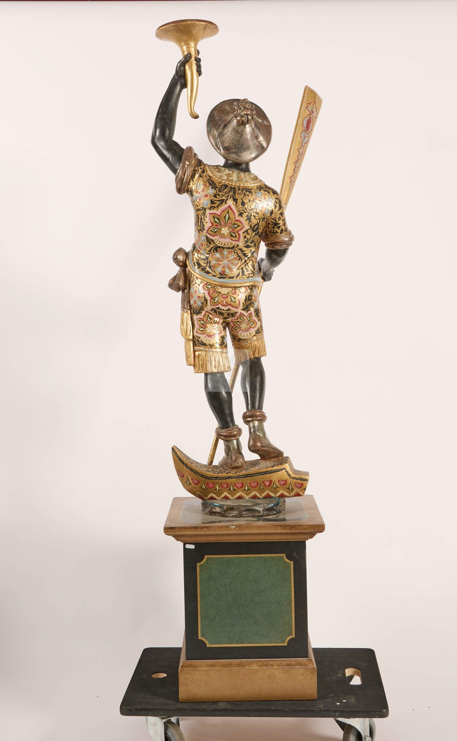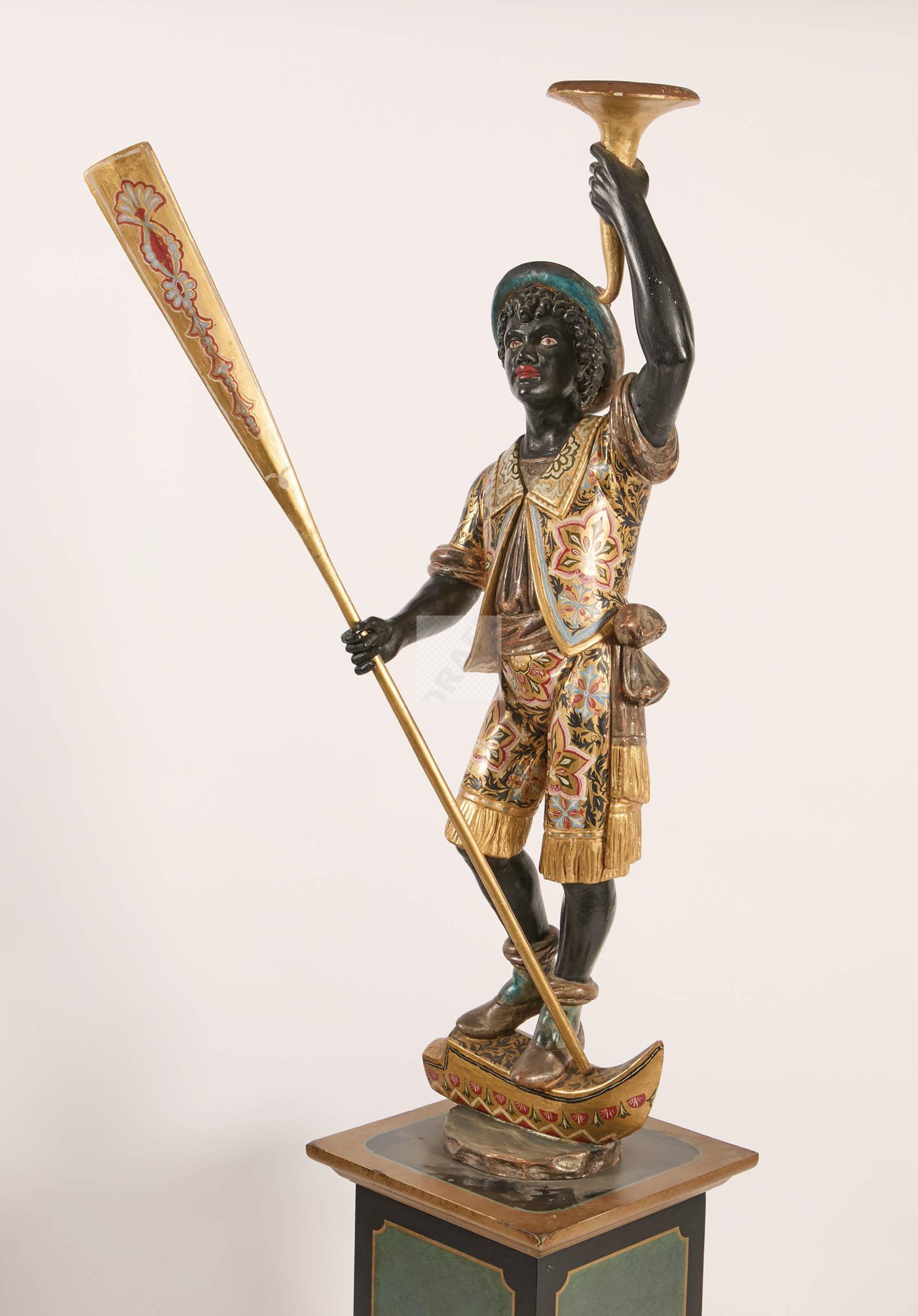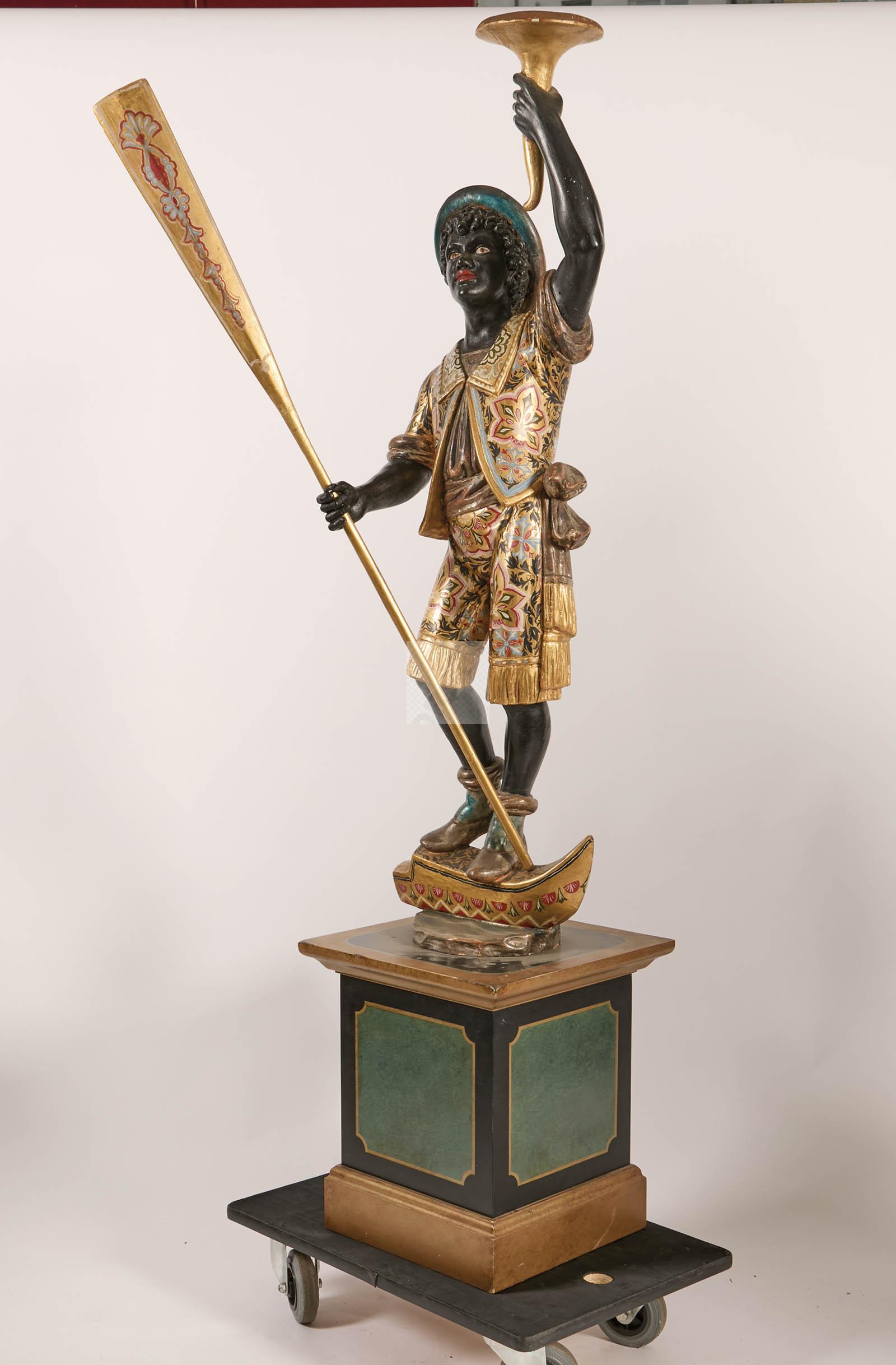 265 Gondolier porte lumière-lumière en bois sculpté polychrome à réhauts dorés et argentés.