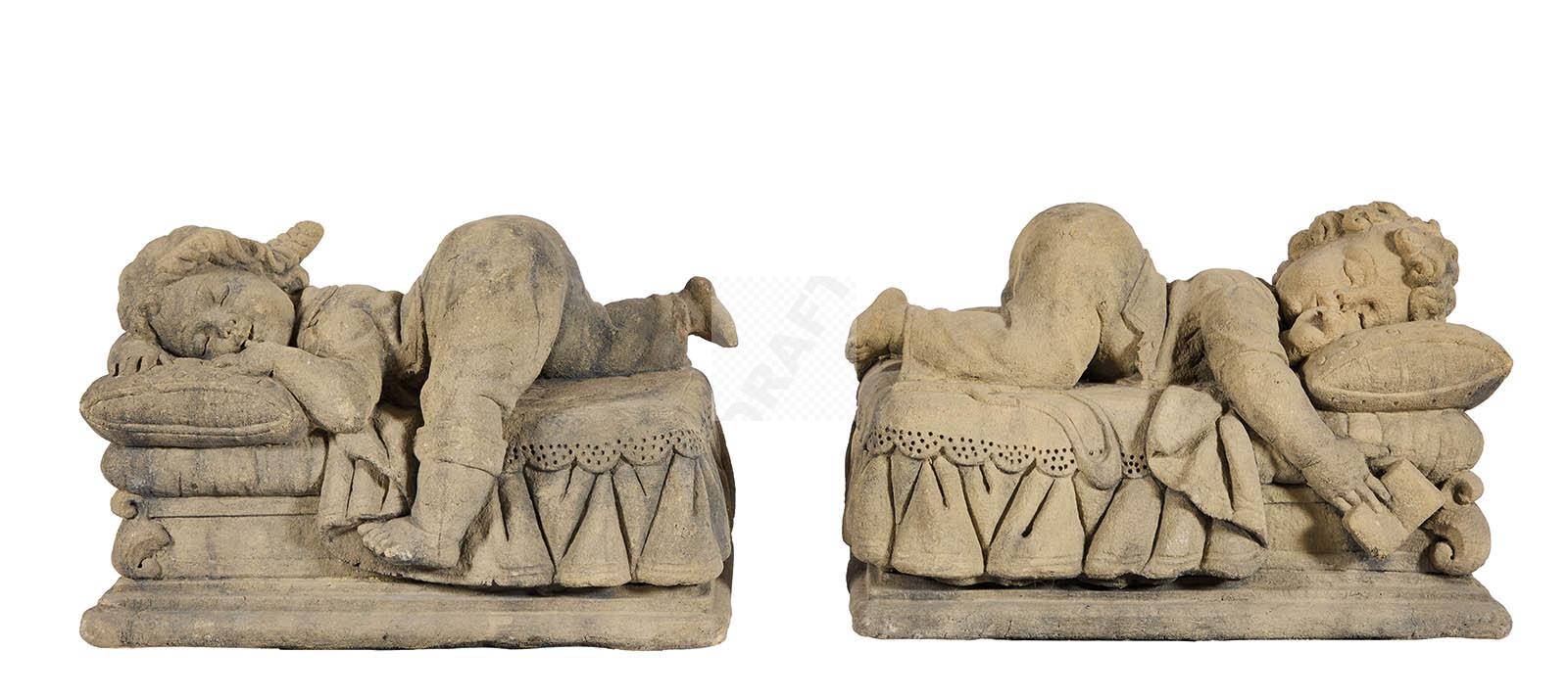 268 Paire d’enfants se reposant sur des couffins soulignés de motifs de passementerie, en pierre sculpté, bases à degrés.