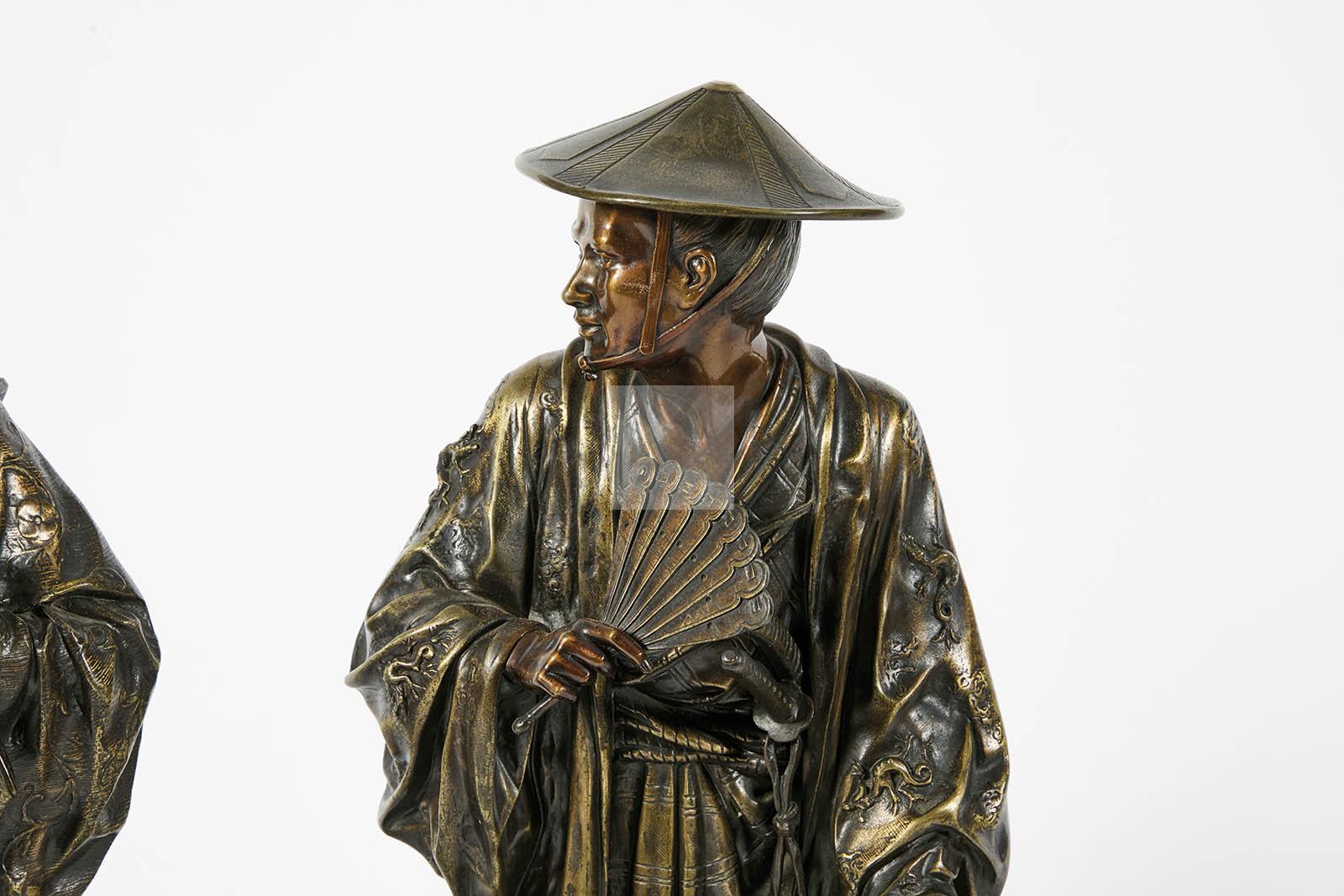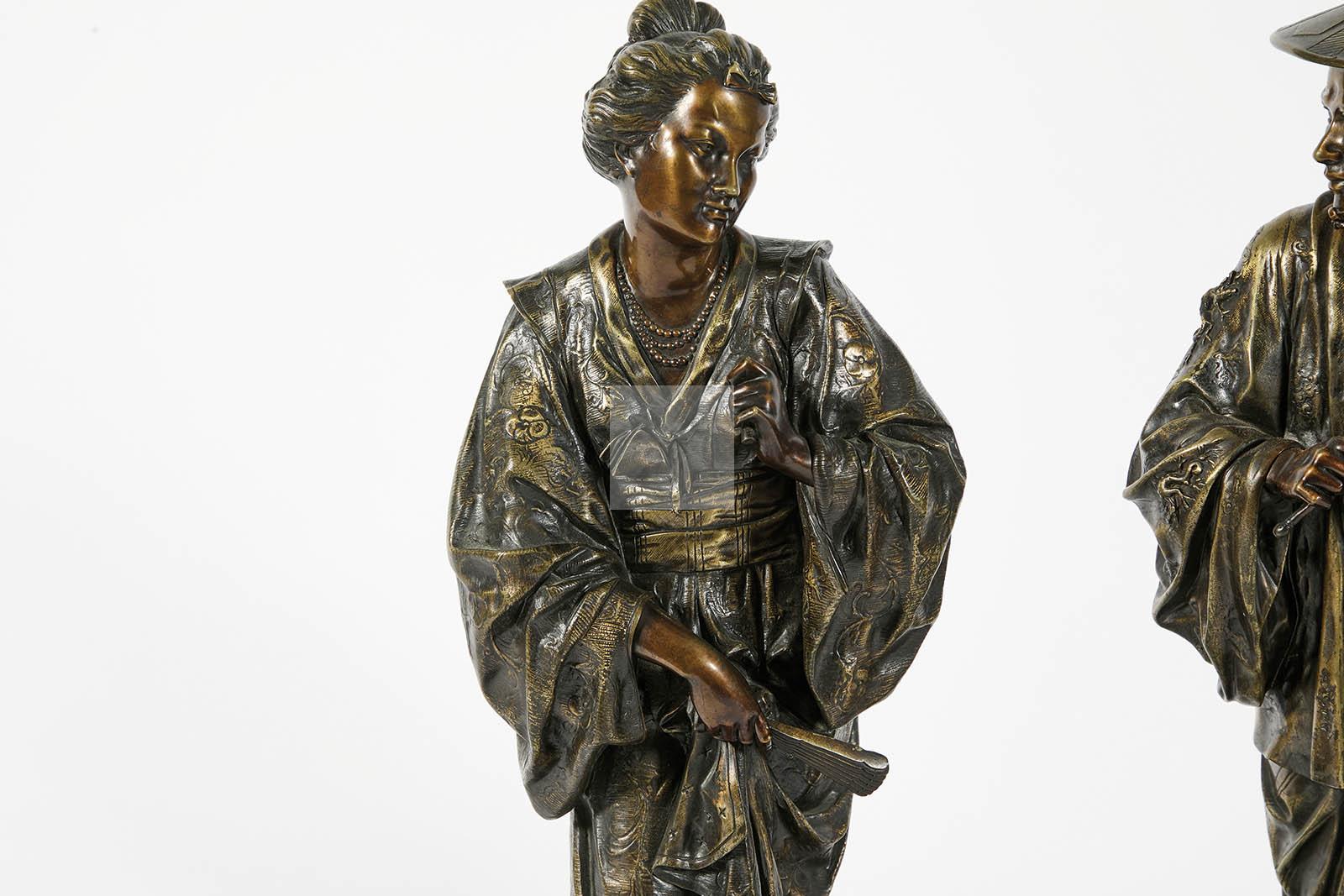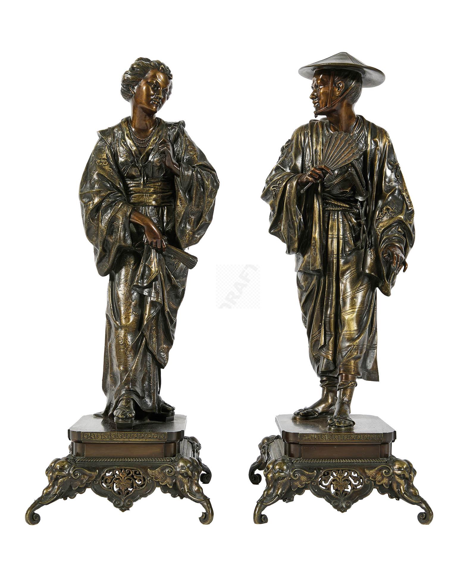 Importante et belle paire de groupes en bronze à patine brune nuancée, représentant une chinoise et un chinois en costume traditionnel. La femme vêtue d’un kimono très finement ciselé d’un motif floral, l’homme tient un éventail. Tous deux reposent sur des socles ajouré ornés de tête d’éléphant à chaque angle. Attribuable à plusieurs sculpteurs français de la deuxième partie du 19e siècle à Paris, de Charles Cordier à Émile Guillemin ou Émile Louis Picault.