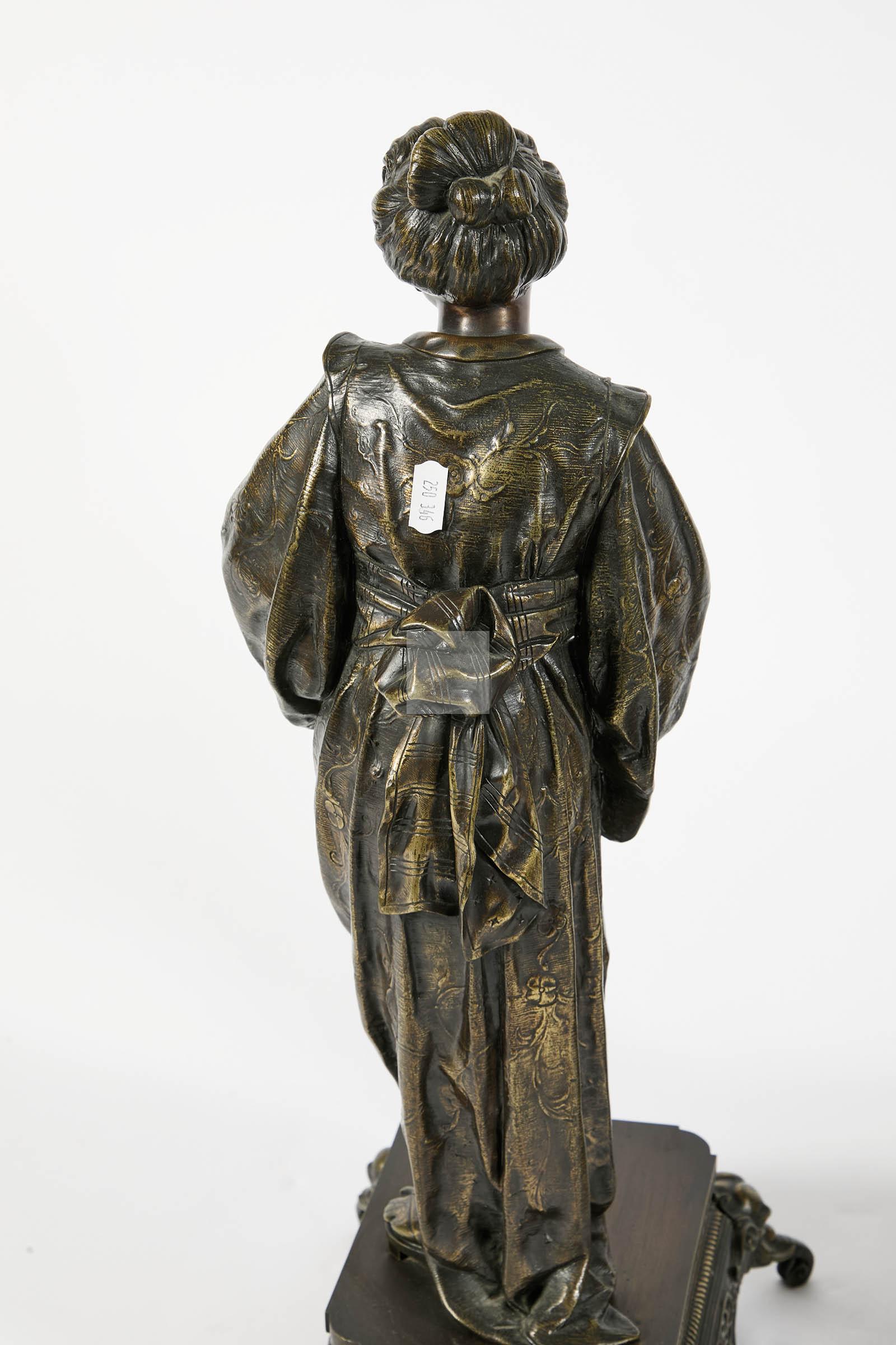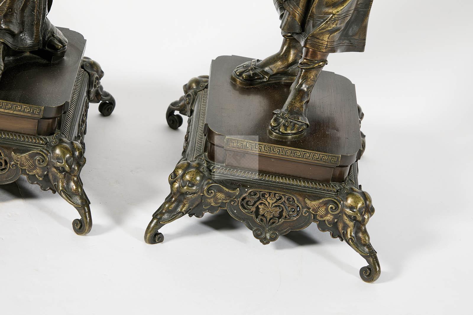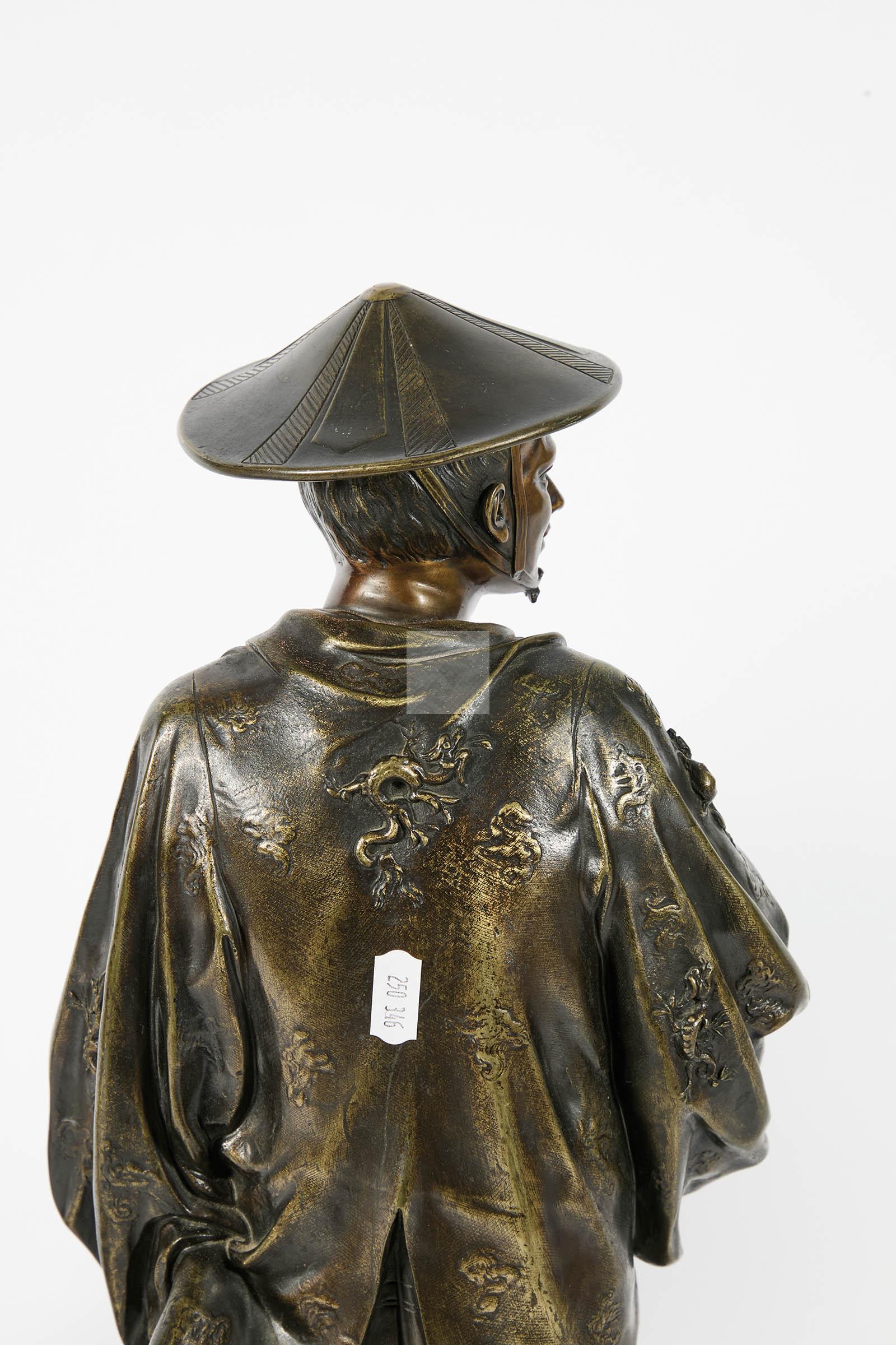 Importante et belle paire de groupes en bronze à patine brune nuancée, représentant une chinoise et un chinois en costume traditionnel. La femme vêtue d’un kimono très finement ciselé d’un motif floral, l’homme tient un éventail. Tous deux reposent sur des socles ajouré ornés de tête d’éléphant à chaque angle. Attribuable à plusieurs sculpteurs français de la deuxième partie du 19e siècle à Paris, de Charles Cordier à Émile Guillemin ou Émile Louis Picault.
