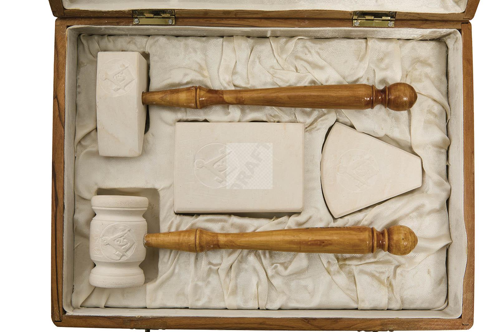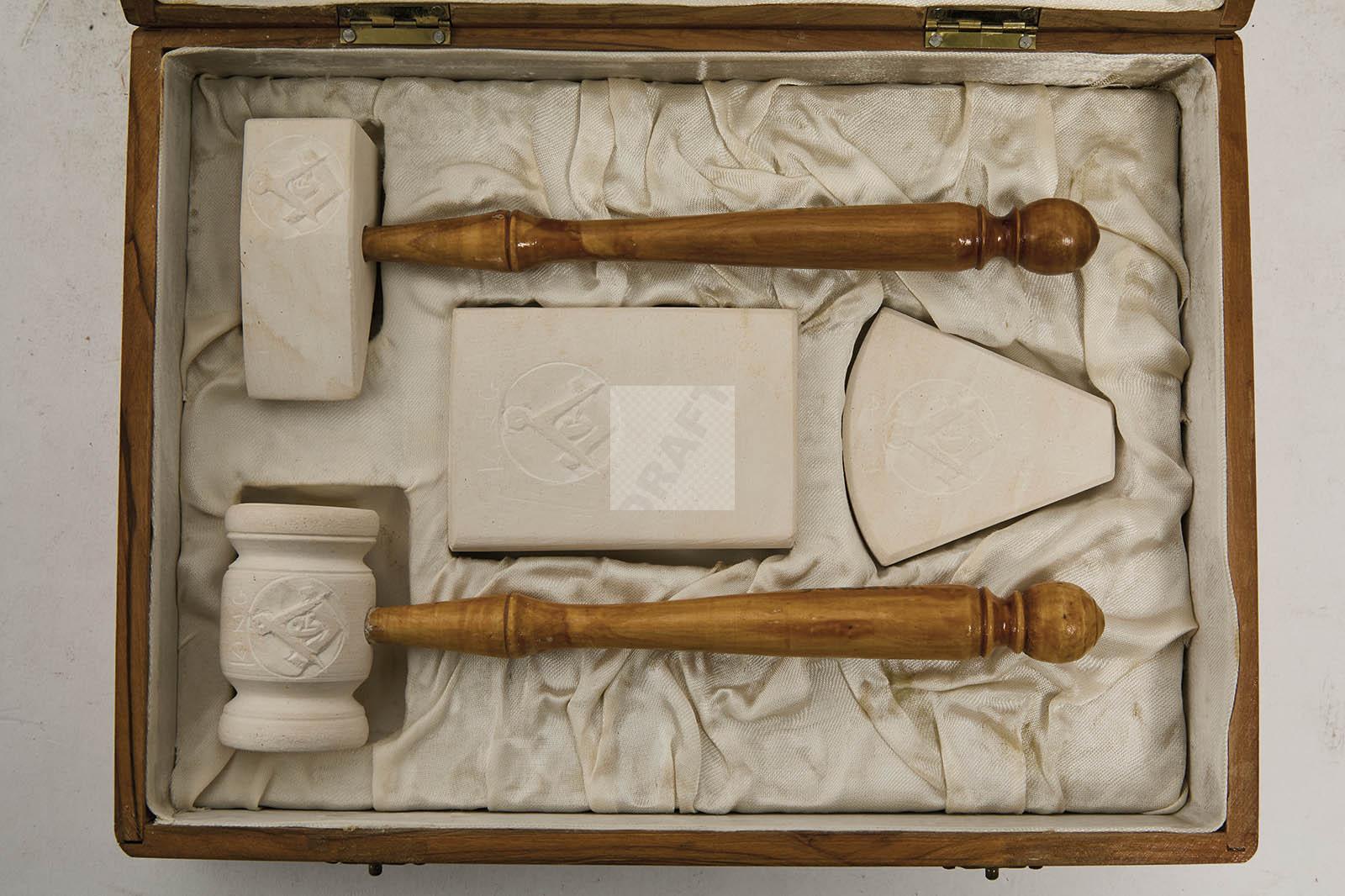 287 COFFRET FRANC MACONNIQUE (Maçonnerie de la Marque), comprenant un maillet de frappe, un marteau de taille, une réplique de Livre de la Loi, une clé de voûte.