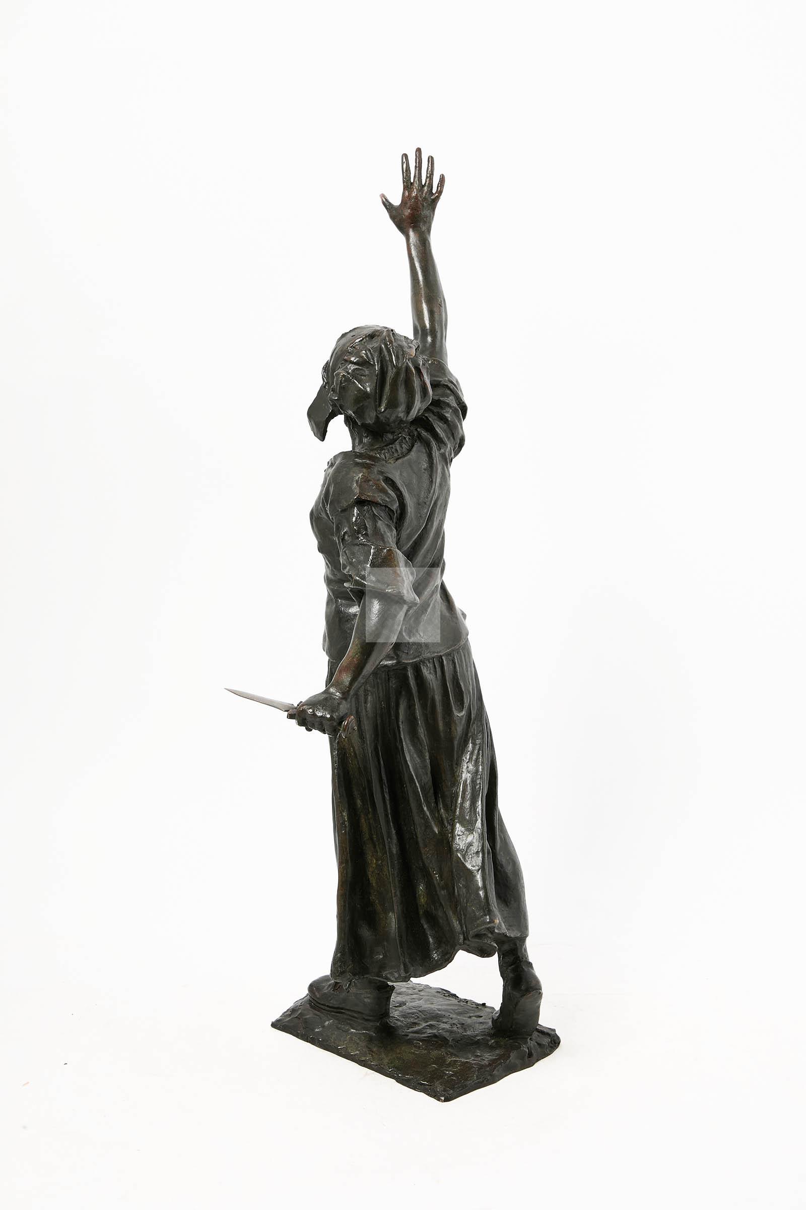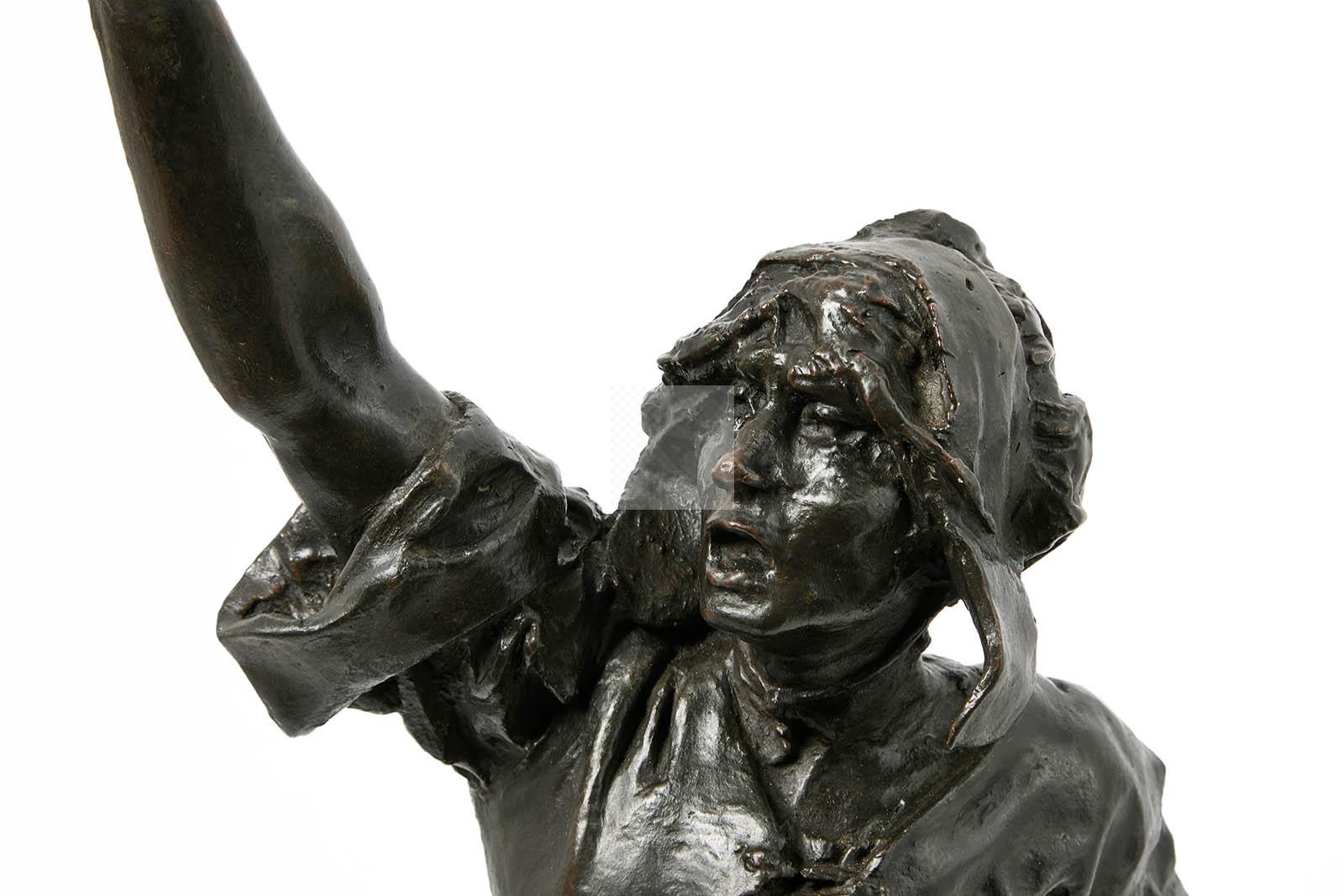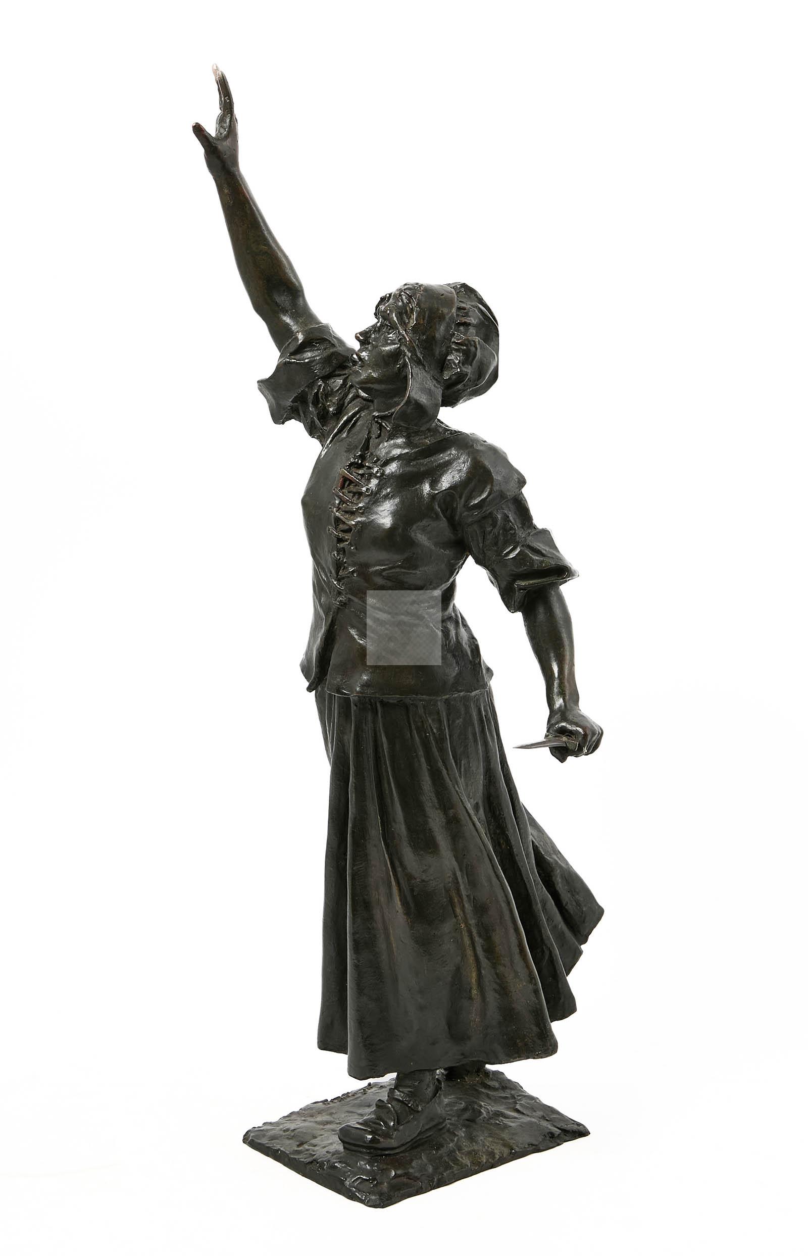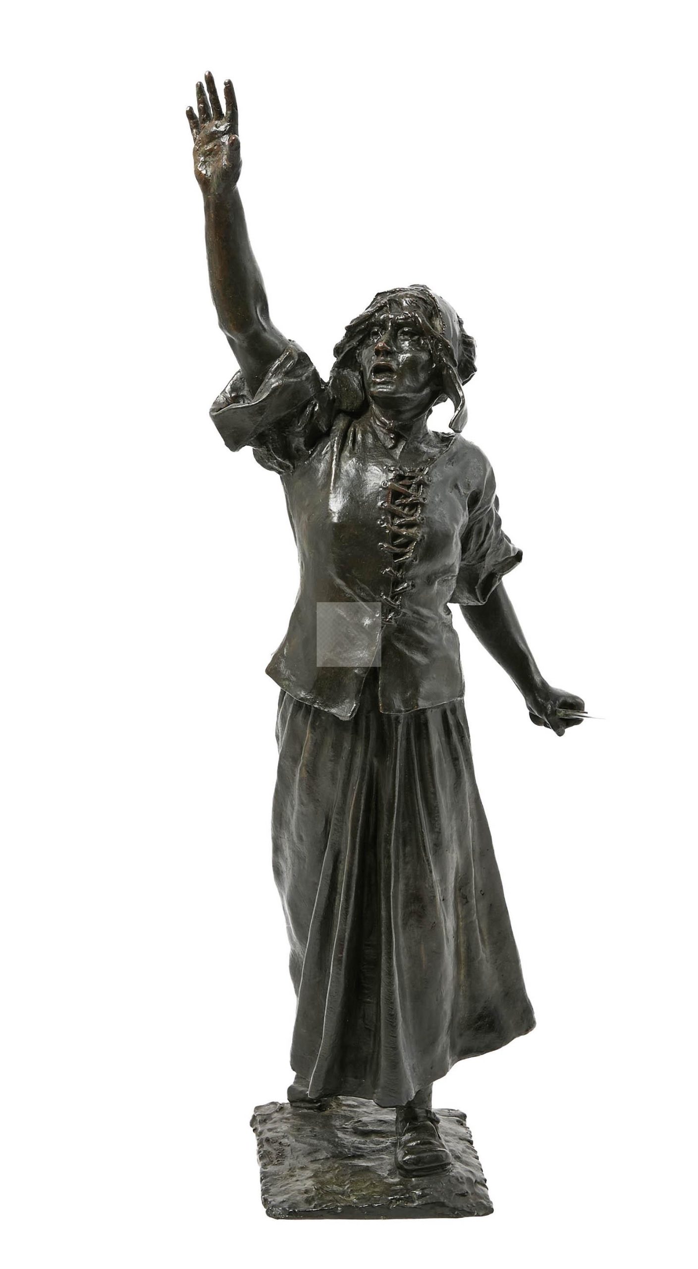 « Projet du monument à Jeanne Maillotte » Bronze à patine brun nuancé. Cire perdue. Haut hors socle : 72 cm Egrenures et trous de perçage au socle de marbre, accident restauré au glaive. Monument à Jeanne Maillotte réalisé en 1935 et se trouvant avenue du Peuple-Belge à Lille. Jeanne Maillotte est un personnage légendaire de l’histoire de Lille, qui aurait contribué à repousser une attaque des hurlus en 1582. Un récit du XIXème siècle évoque un épisode historique lillois situé dans le contexte des conflits religieux du XVIème siècle entre catholiques et protestants : enjuillet 1582, une bande de hurlus aurait attaqué la ville de Lille par le faubourg de Courtrai, provoquant la stupeur de la population. Une cabaretière du nom de Jeanne Maillotte travaillant dans une échoppe de la place des Bleuets aurait alors alerté les archers de la confrérie de Saint Sébastien et galvanisé la résistance des habitants au point de parvenir à repousser cette attaque. Si l’existence de ce personnage n’est pas prouvée, la léggende a eu du succès, suscitant des oeuvres d’arts, chansons populaires (un poème du chansonnier Alexandre Desrousseaux par exemple), l’inauguration d’une statue à Lille en 1935et la création d’une géante en 2004.